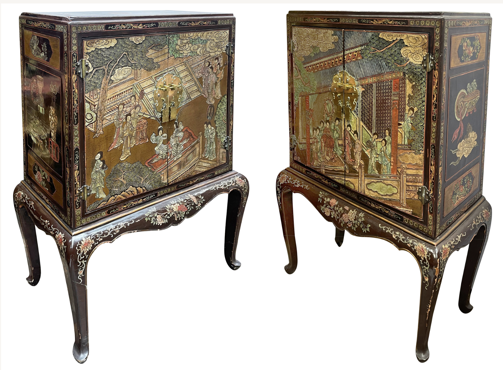 Pair Chinoiserie lacquer cabinets on stand. circa 1900