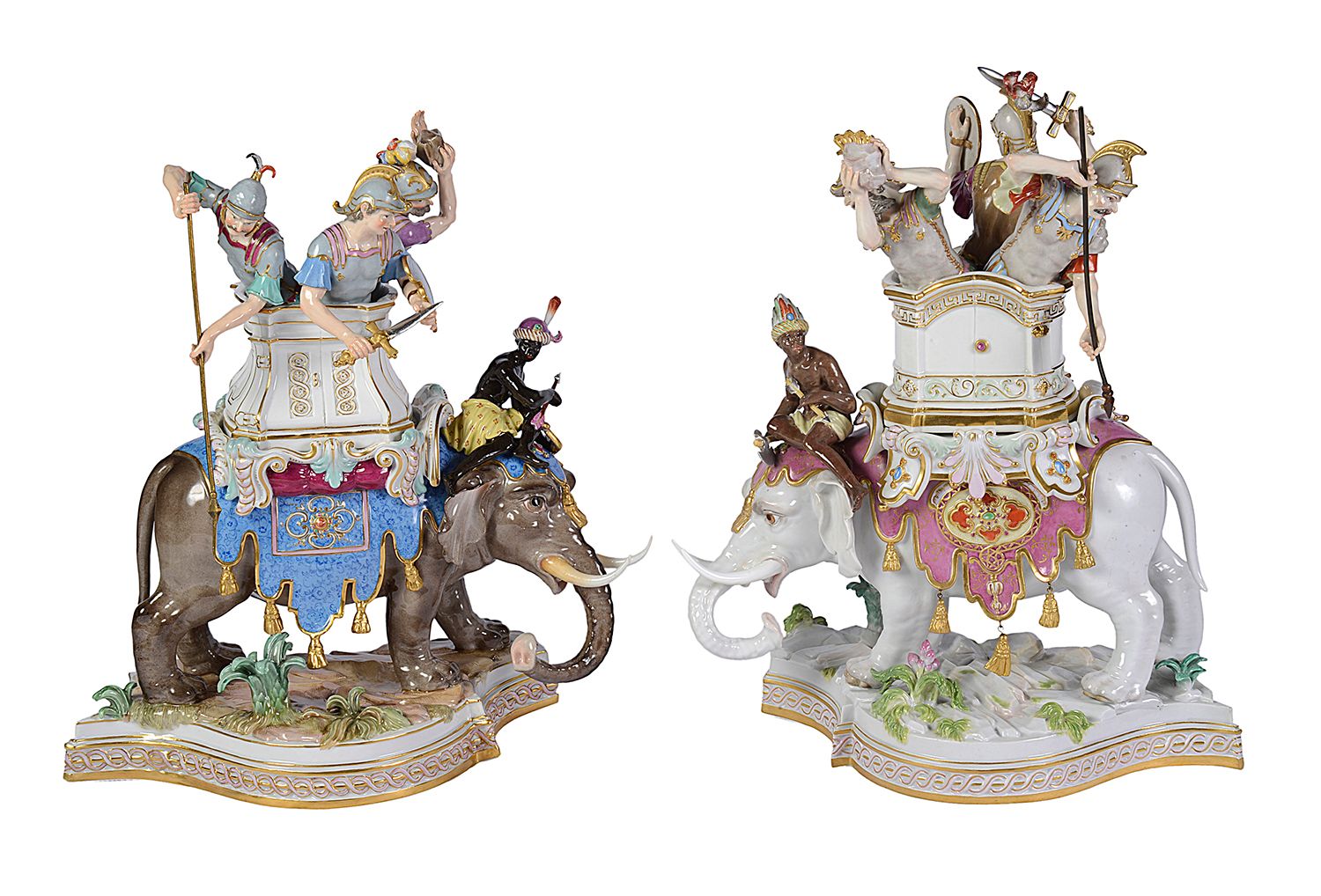 Rare pair of Meissen porcelain Elephants, depicting Alexander the Great concurring India, C19th