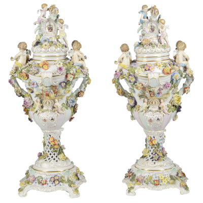 Large Pair Dresden style lidded comports, late 19th Century.