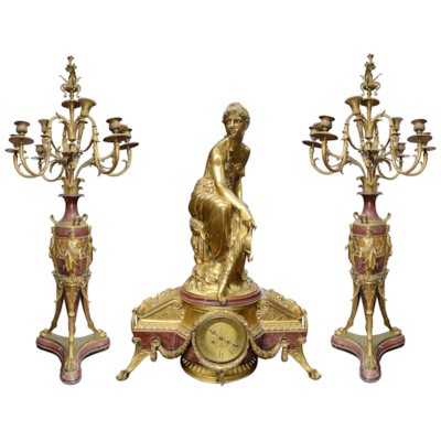 Large 19th Century Louis XVI style gilded ormolu clock set.