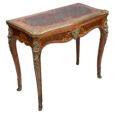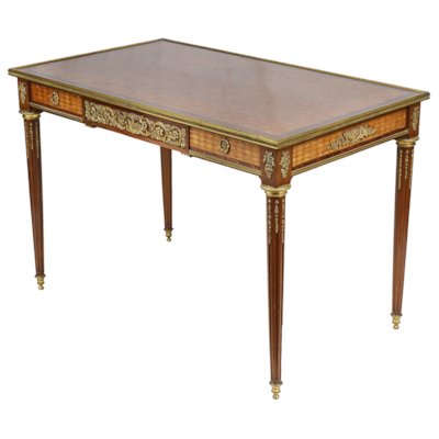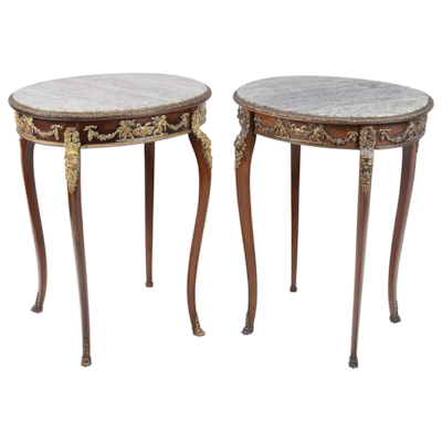 Fine quality near pair French marble topped side tables. In the manner of Linke