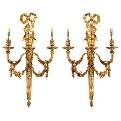 Pair classical 19th Century Louis XVI style ormolu wall lights, 63cm(25")