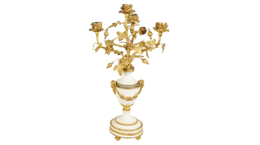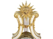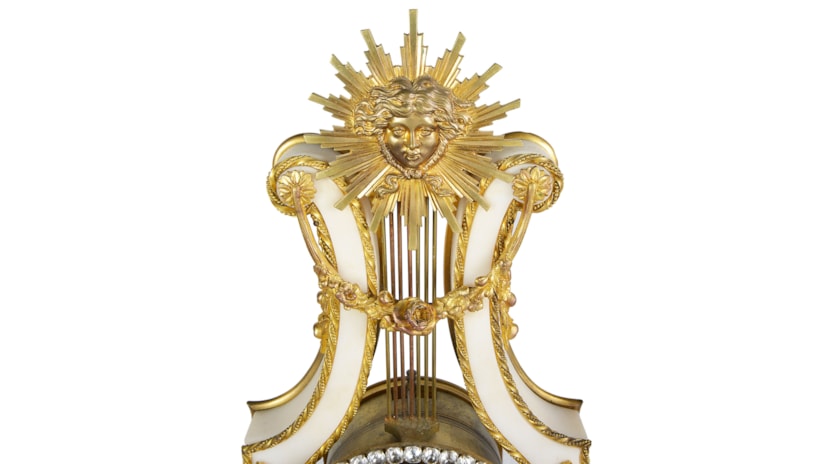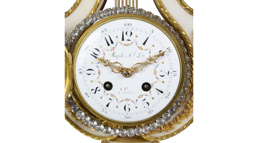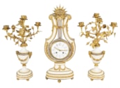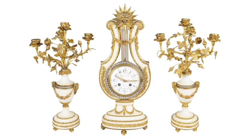 19th Century French Lyre shape clock garniture. 18cm wide x 10cm deep x 47cm high
