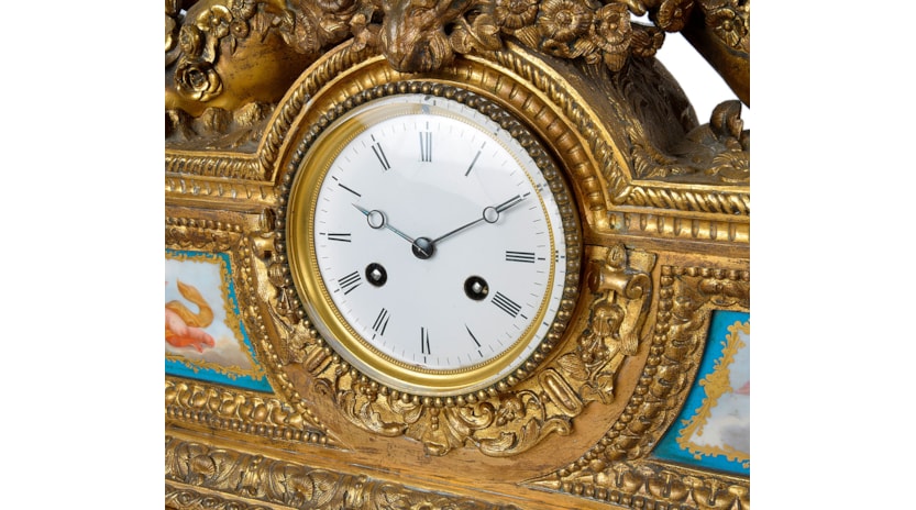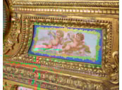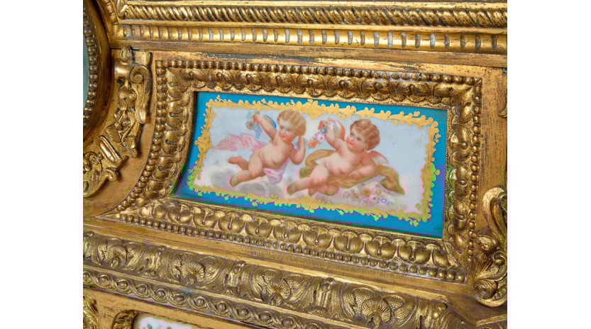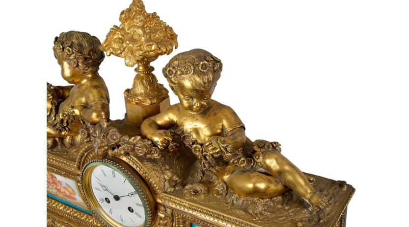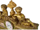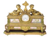Louis XVI style mantel clock, two recling putti. 47cm high x 66cm wide x 19cm deep.