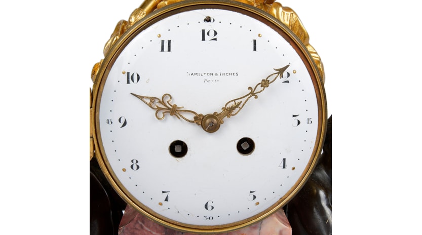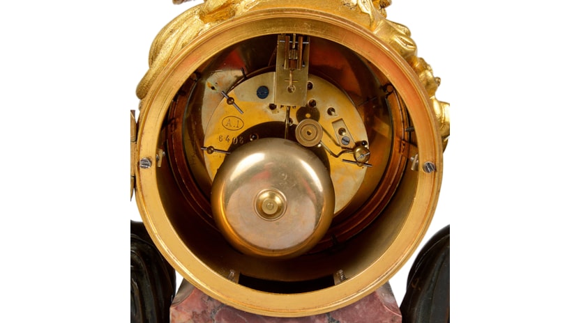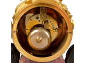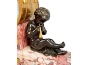 A good quality French gilded ormolu, bronze and rouge marble mantel clock, in the Louis XVI style. Having Doves above the clock face, an enamel dial with an eight day movement, chiming on the hour and half hour. Bronze putti on either side play the pipes and mounted on a rouge marble base.