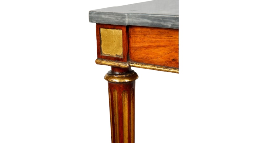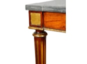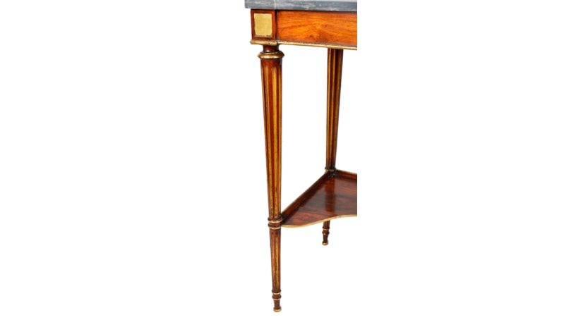 A good quality Regency period Rosewood and parcel gilt side table, having its original Grey veined marble top, raised on turned tapering fluted legs, united by a shelf beneath..