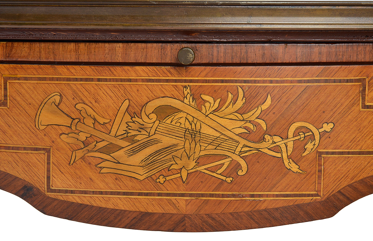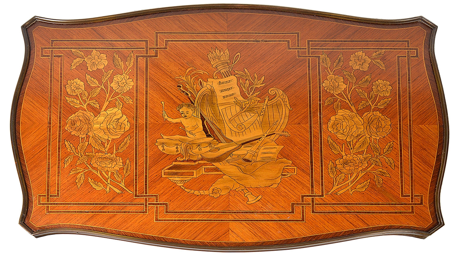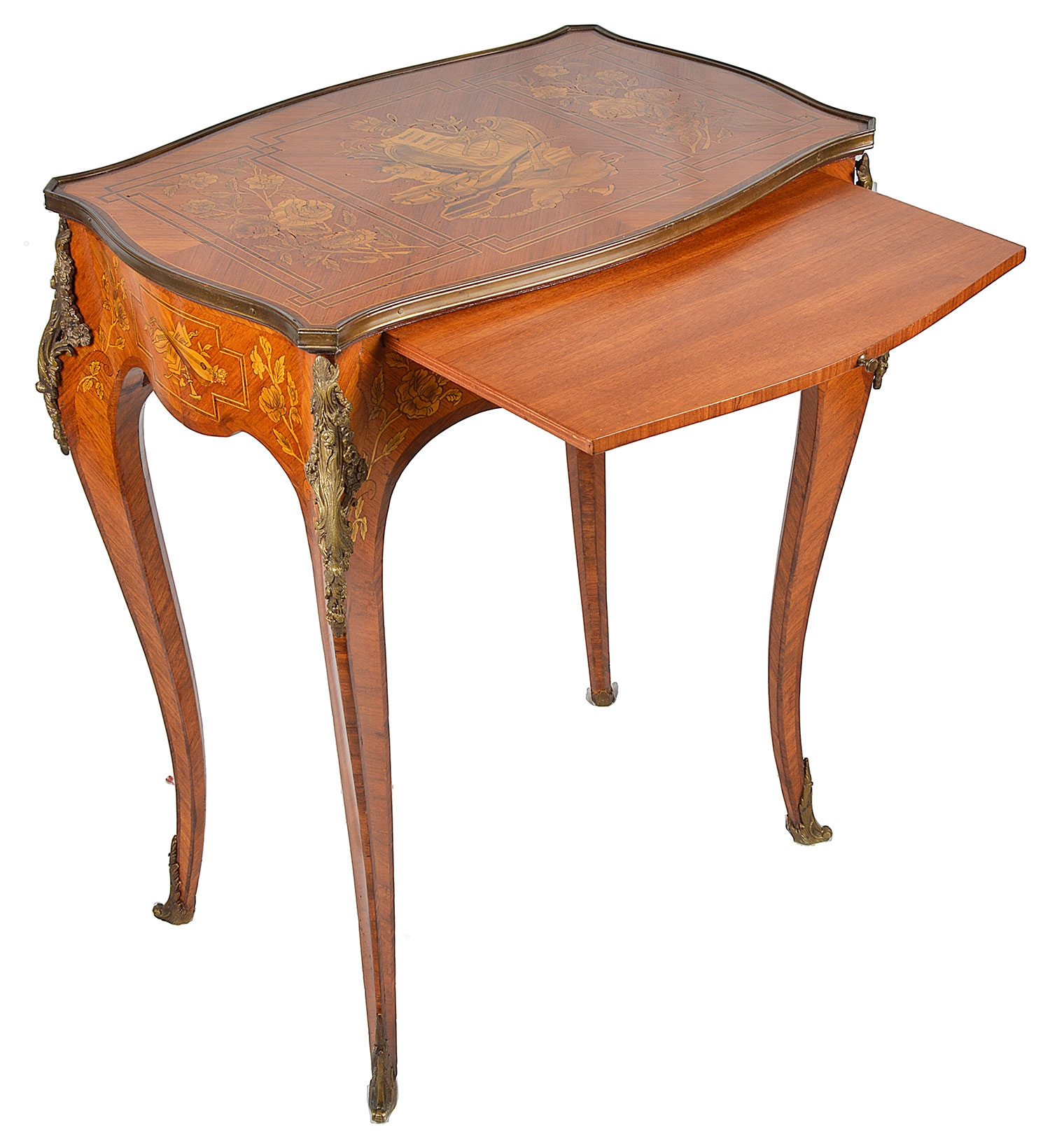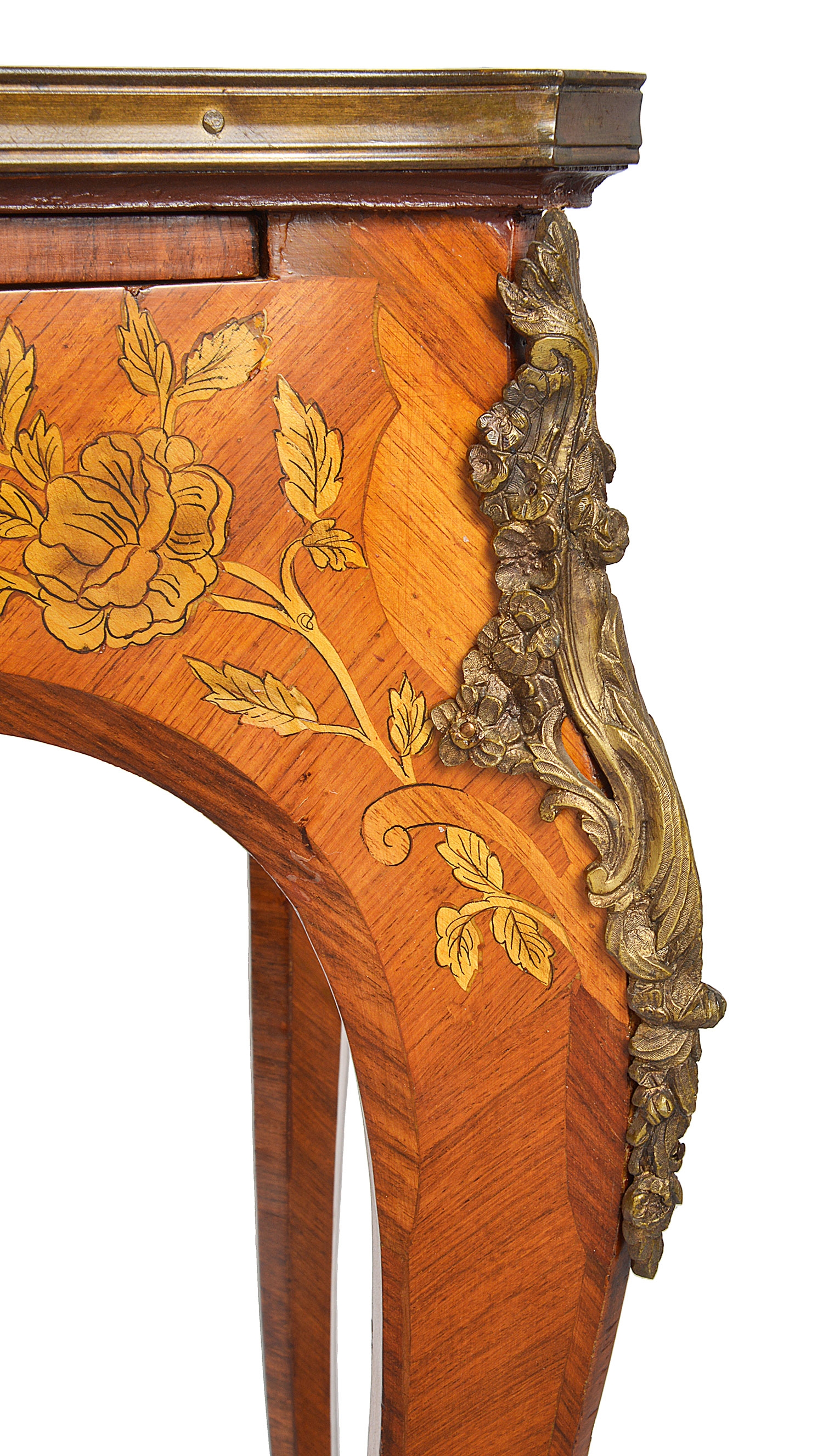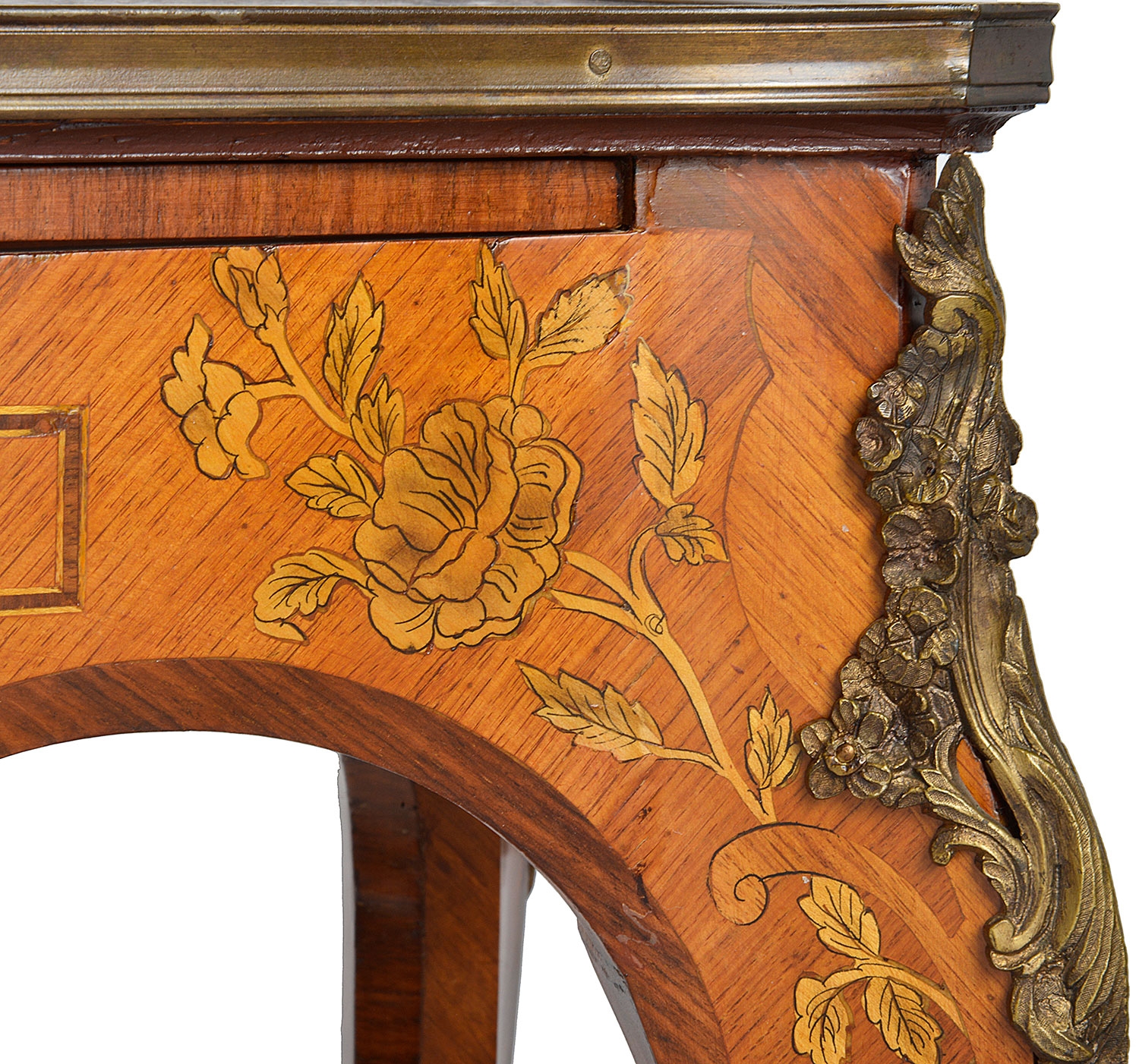 Pair of marquetry inlaid French side tables, 58cm x 43cm x 74cm high