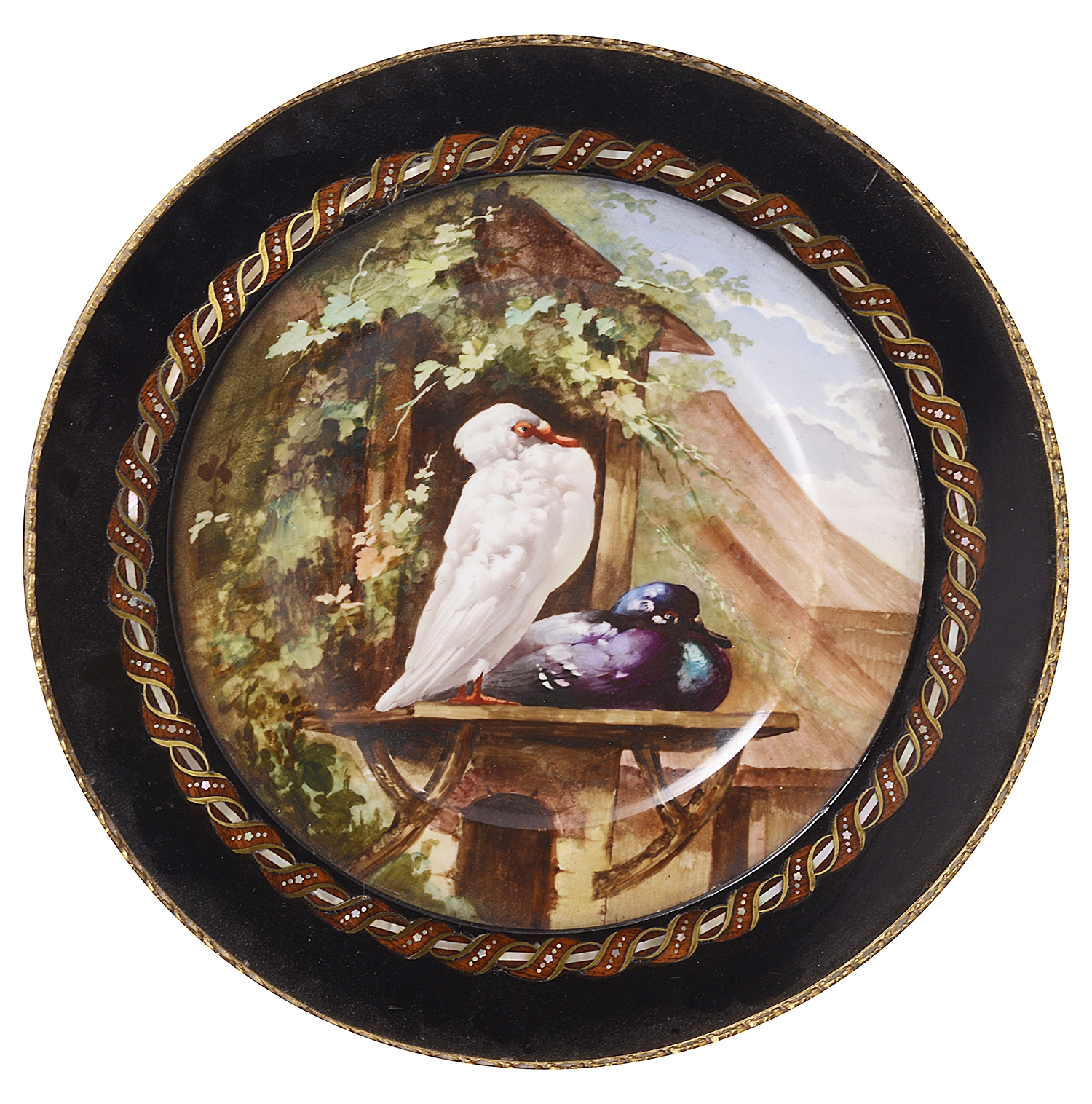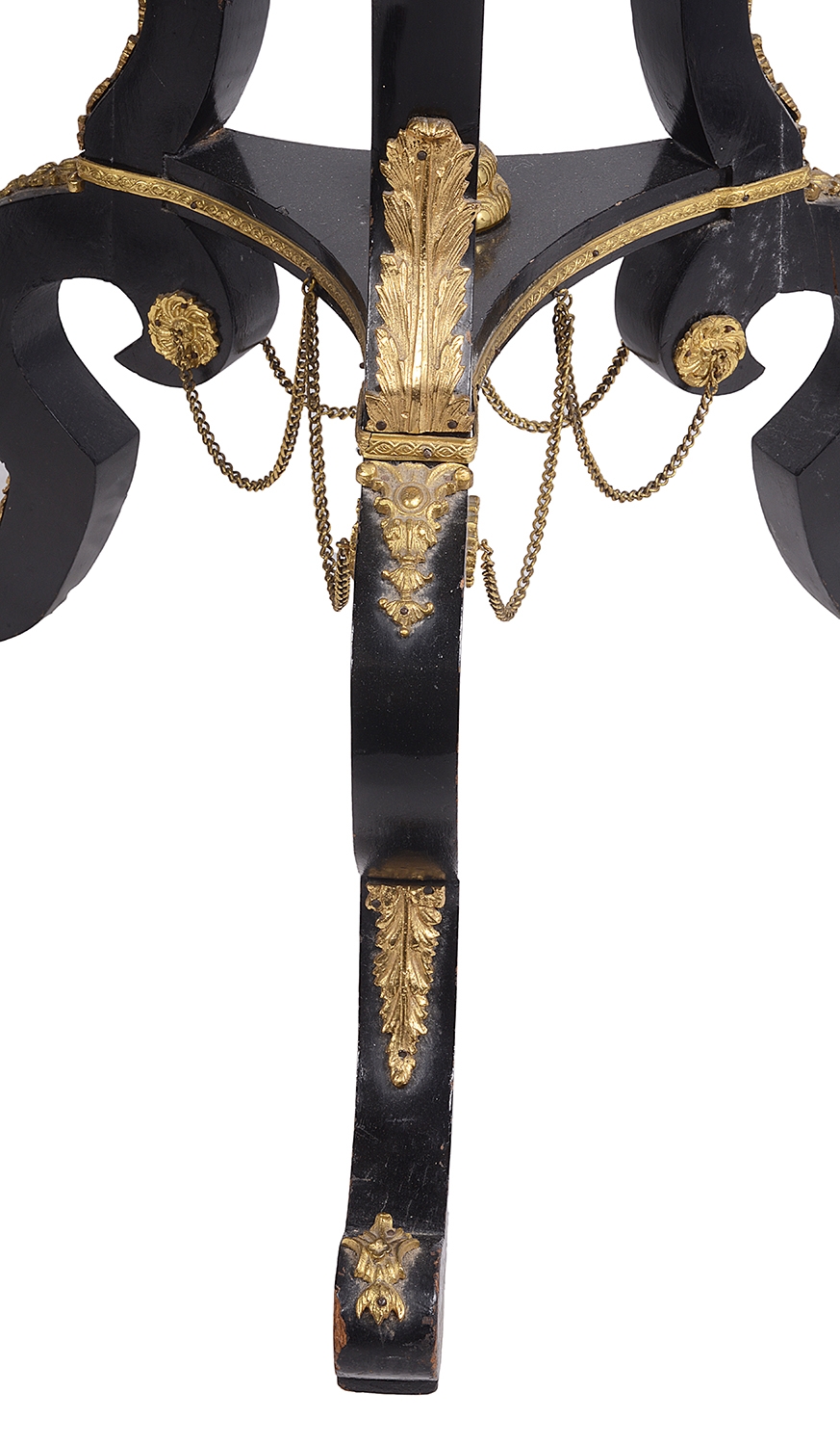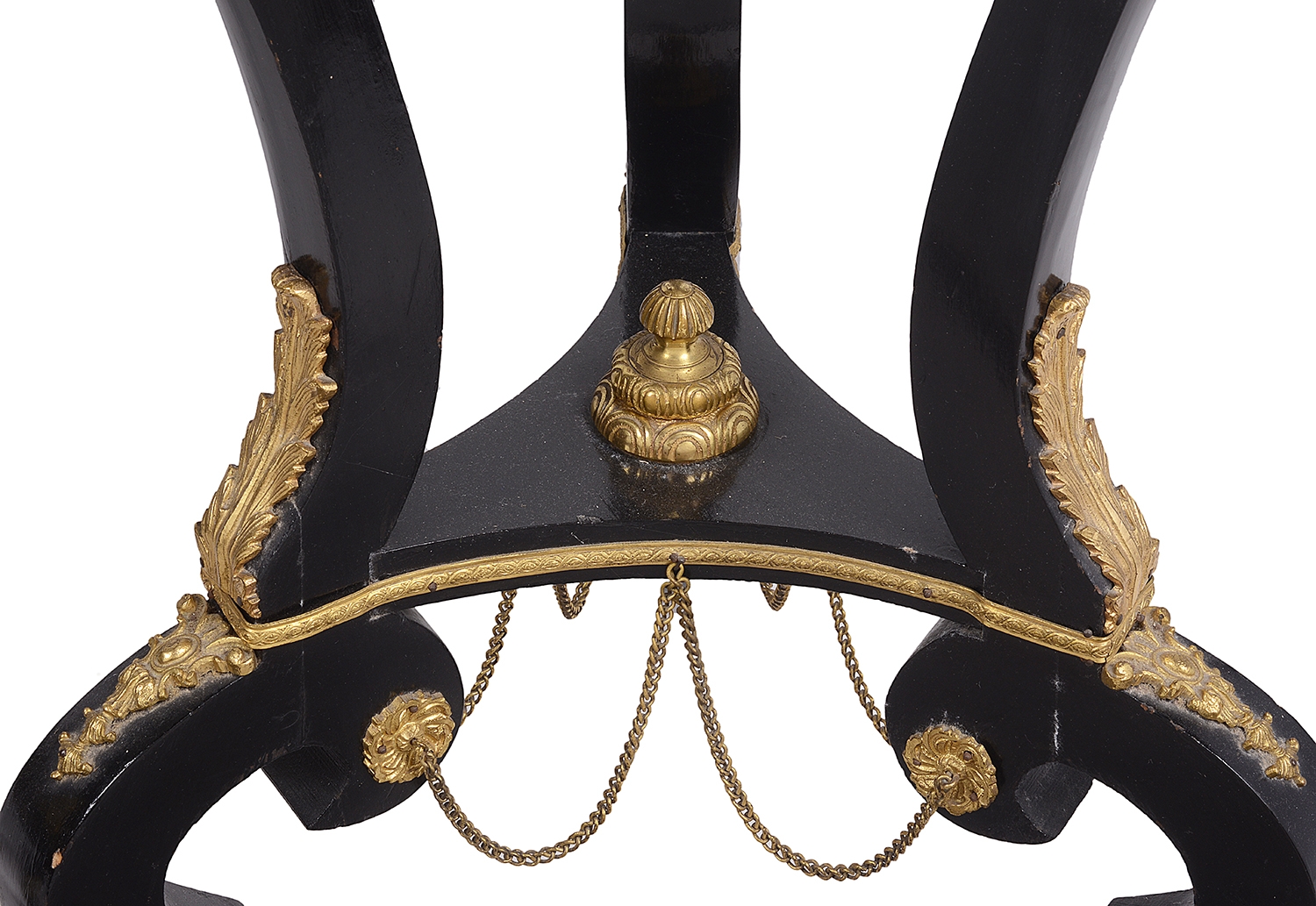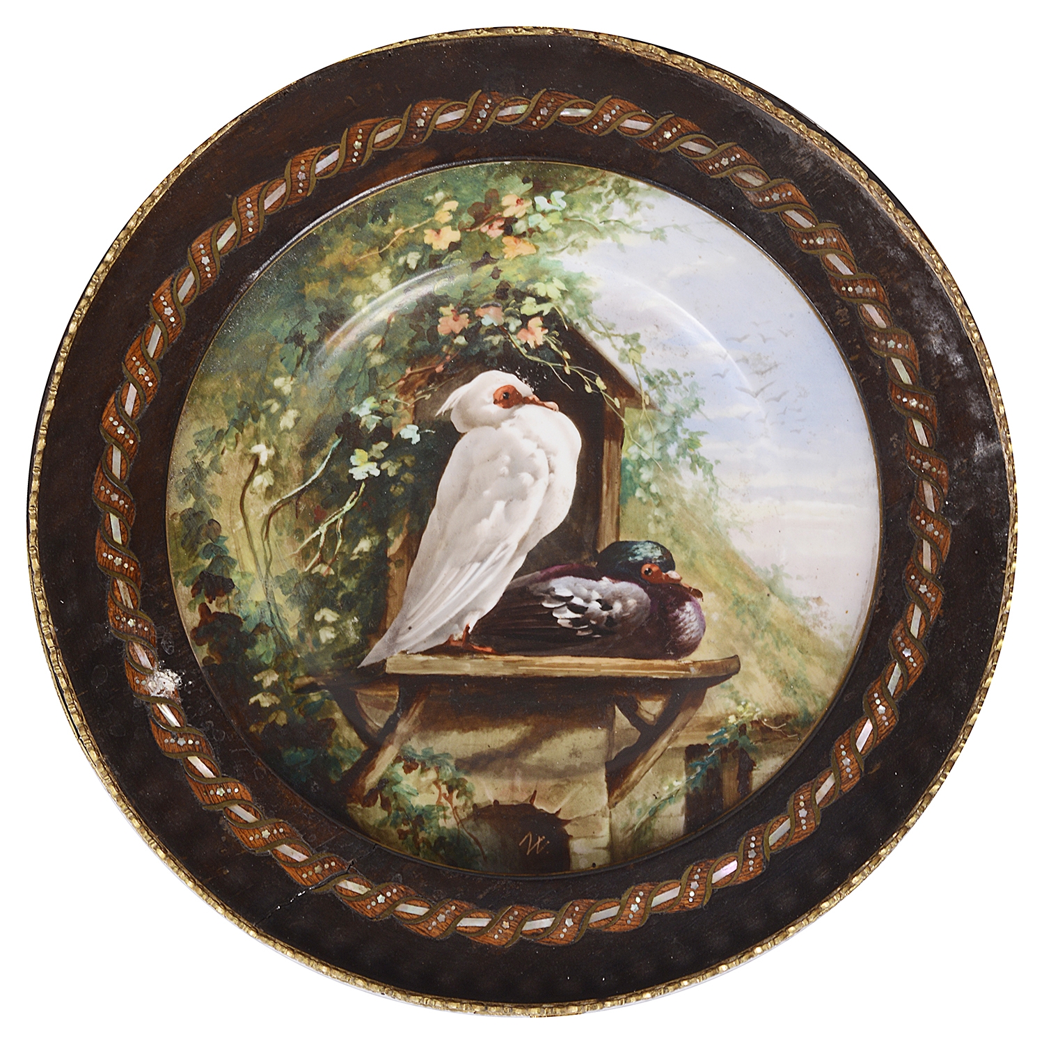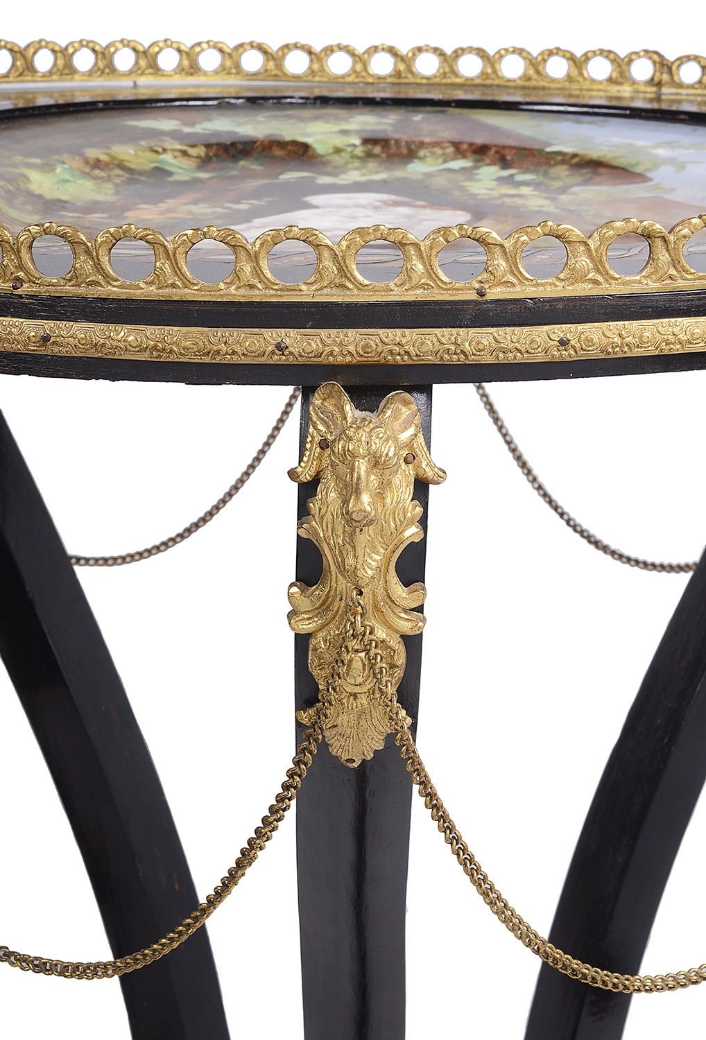 A good quality pair of late 19th century ebonized side tables. Each with inset porcelain plates depicting birds resting, gilded ormolu mounts.