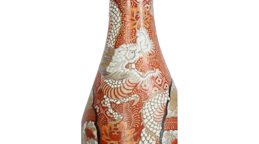 A good quality decorative pair of 19th century Japanese Kutani vases, each having mythical dragons wrapped around the vases amongst flowers and moitfs.