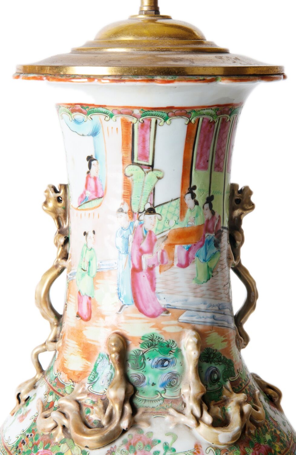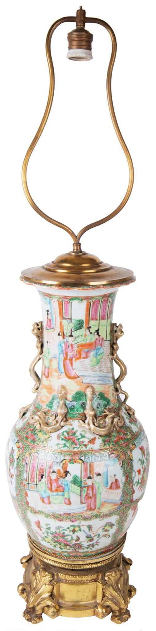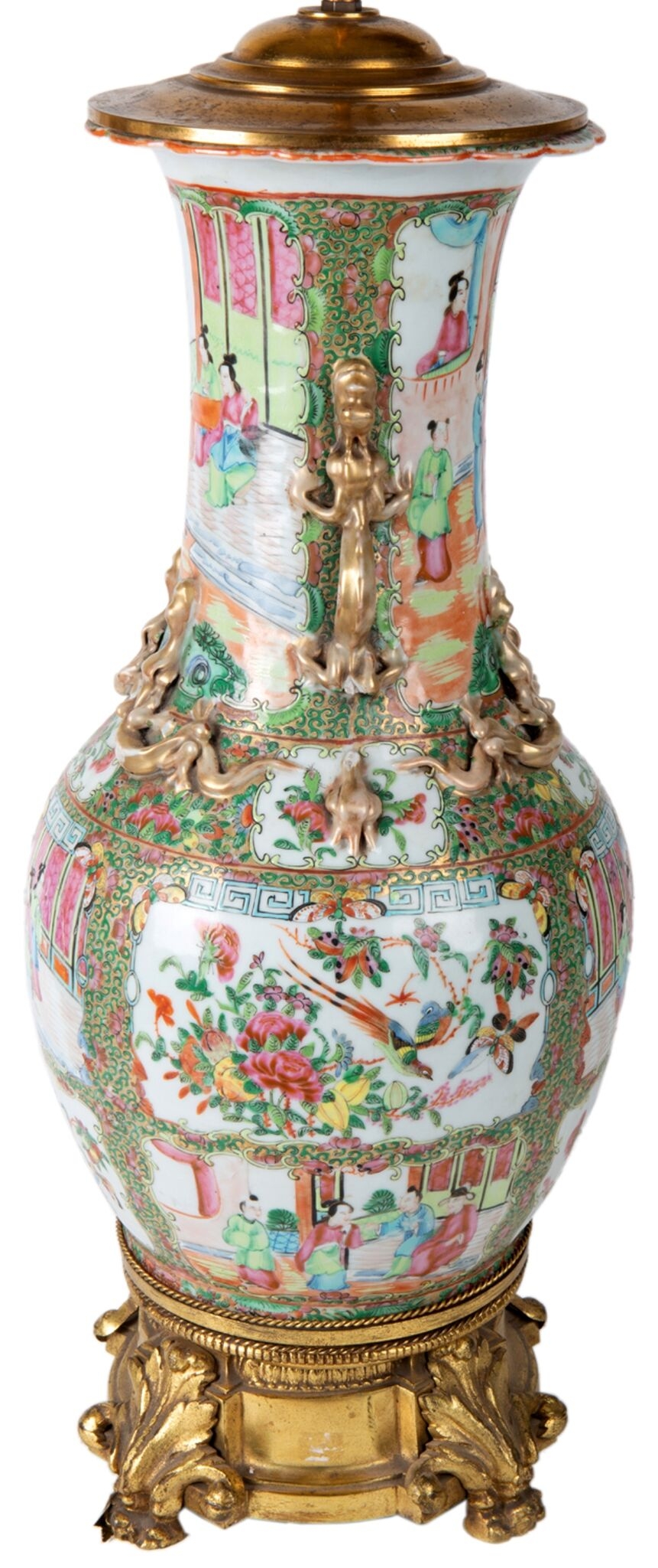 A good quality 19th century Chinese Canton / Rose medallion vase or lamp. Having classical Chinese scenes painted in the inset panels. Gilded lizards to the neck, mounted on a classical gilded ormolu scrolling base.