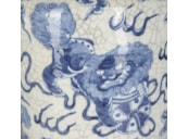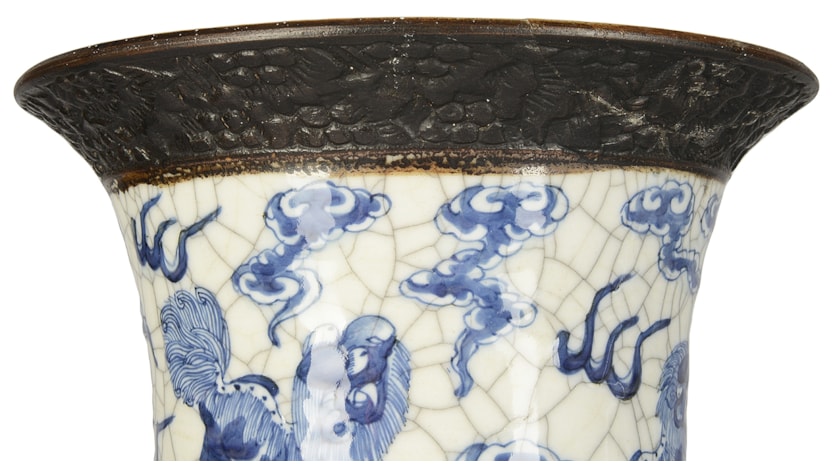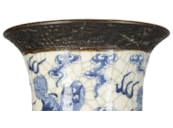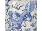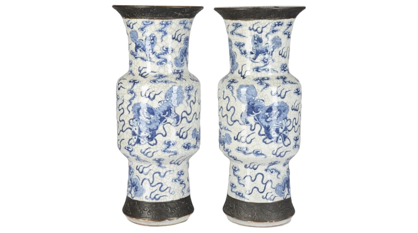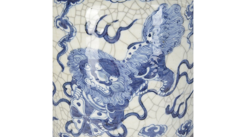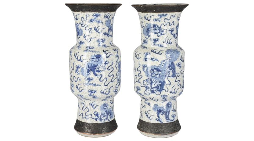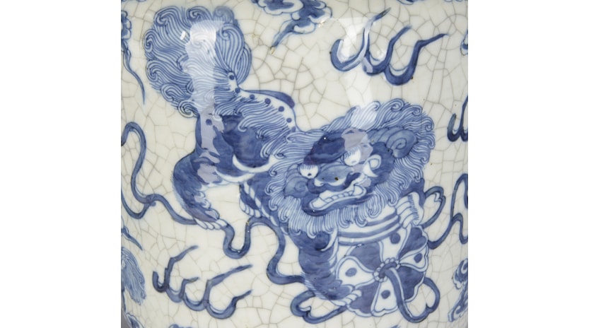 A good quality large and impressive pair of Chinese 19th century blue and white crackelware vases. Each Earthenware boarders top and bottom with sea scrolls. Mythical dragon and dogs amongst clouds and snakes.