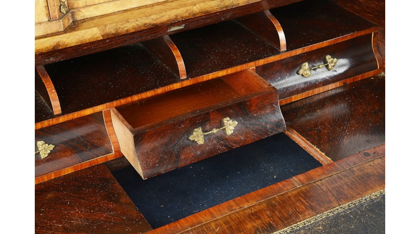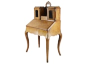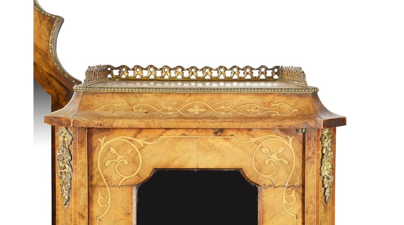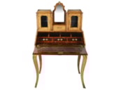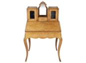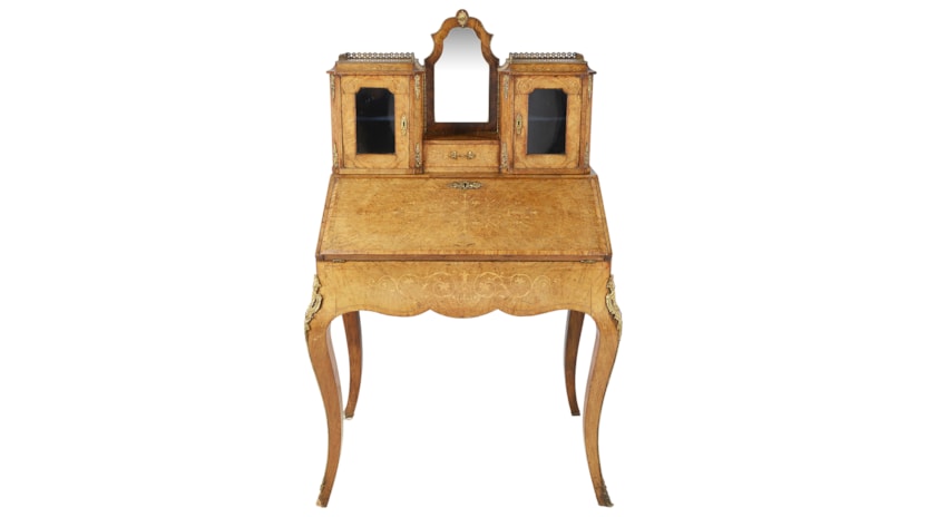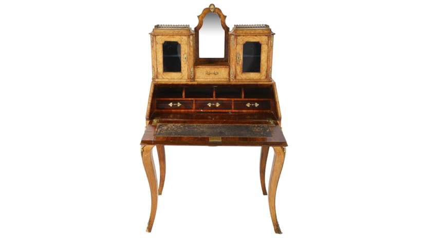 A good quality Victorian Walnut Bonheur du jour, having a mirror to the centre, glazed cupboards either side, an inlaid fall front bureau, opening to reveal compartments, drawers and a well. Raised on elegant cabriole legs.