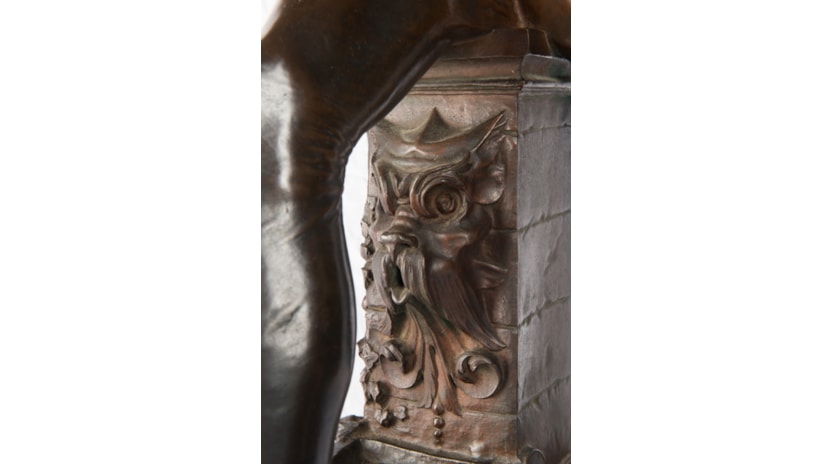 Paul Fournier (French, 1859-1926): A large bronze figure of a minstrel playing a lute the figure in Renaissance dress, looking to dexter and seated on a fountain with lion mask spout and shaped bowl below, on a circular base, signed 'Paul Fournier'.