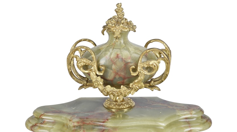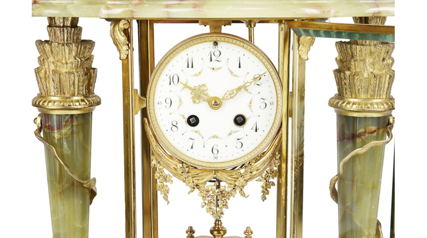 Large Louis XVI Style Onyx and Ormolu Clock Set, 19th Century.