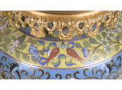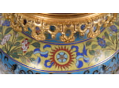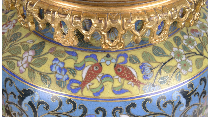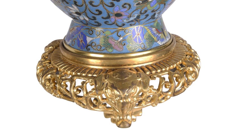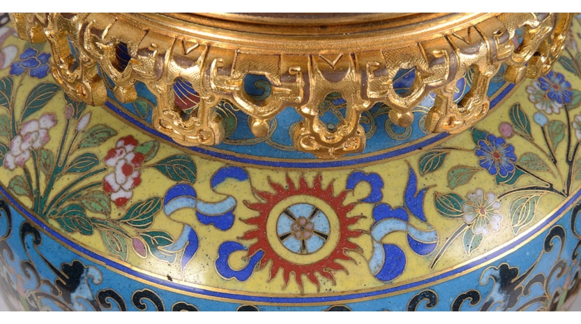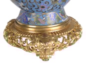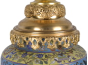 A very good quality pair of late 19th Century Chinese cloisonné; enamel and gilded ormolu vases / lamps. Each with wonderful classical bold colours, scrolling motif and foliate decoration.