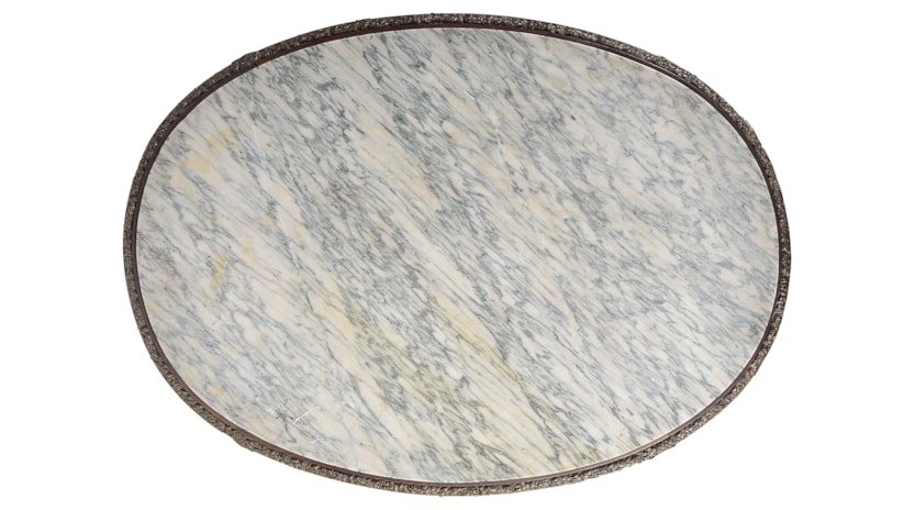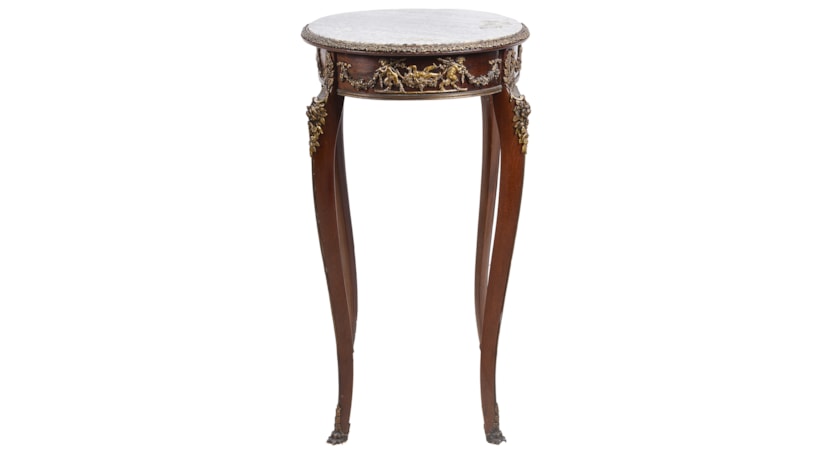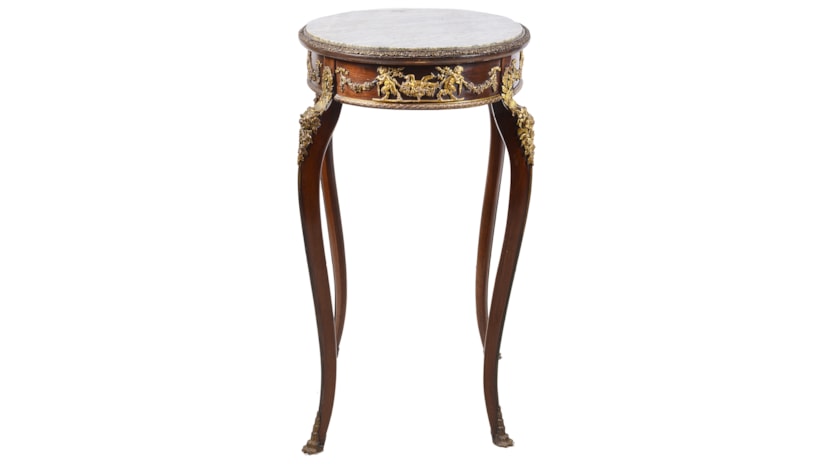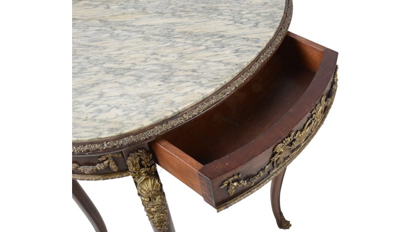 Fine quality near pair French marble topped side tables. In the manner of Linke.