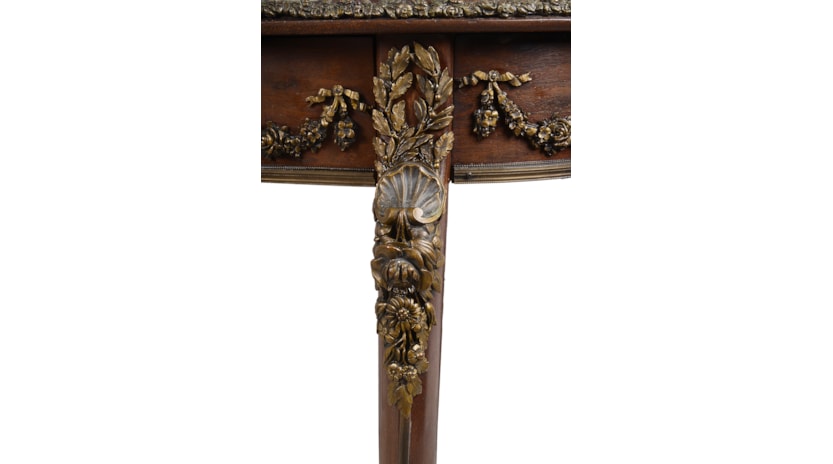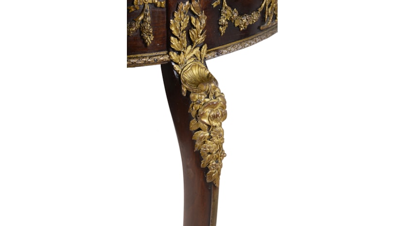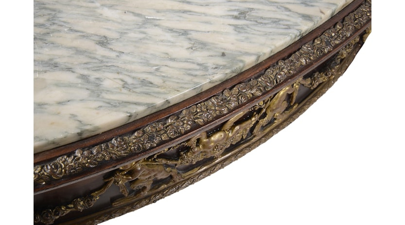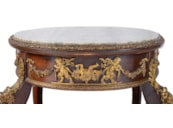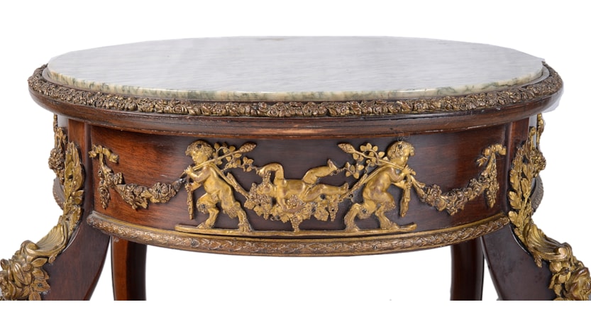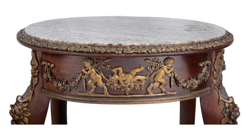 A fine quality near pair of French late 19th Century marble topped side tables, each with wonderful gilded ormolu mounts to the frieze, depicting Bacchus, cloven hoaffed putti playing, fine floral mounts to the tops of the elegant cabriole legs. In the manner of Francois Linke