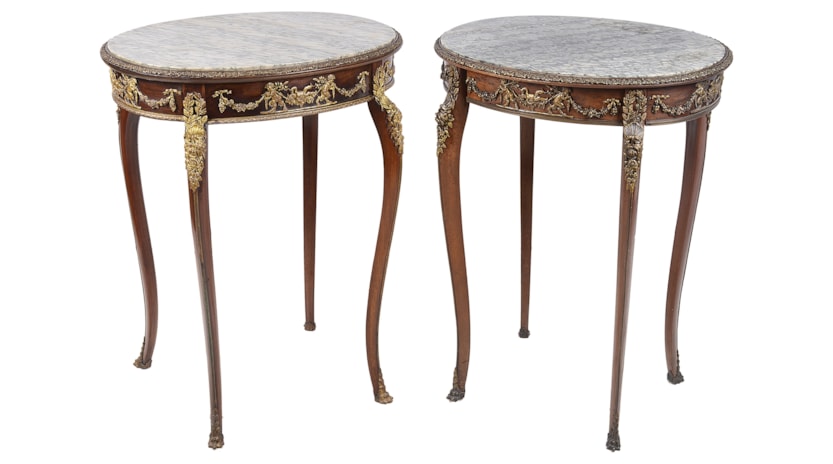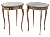 Fine quality near pair French marble topped side tables. In the manner of Linke