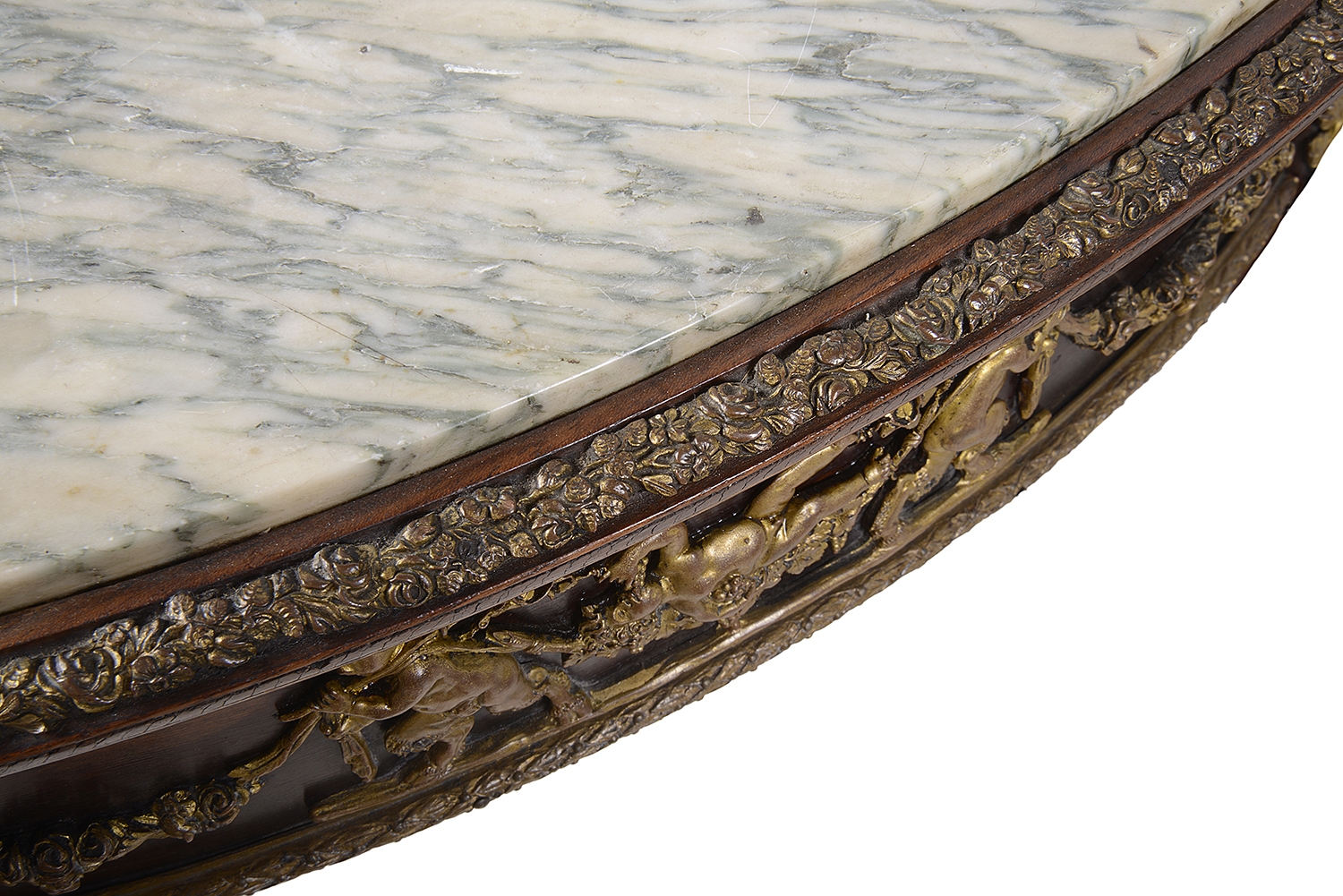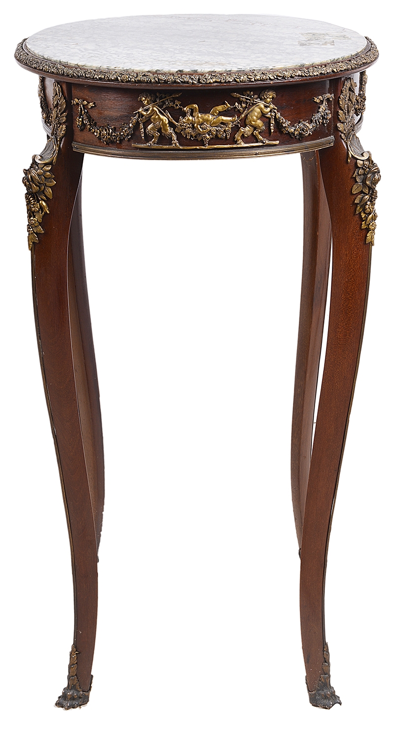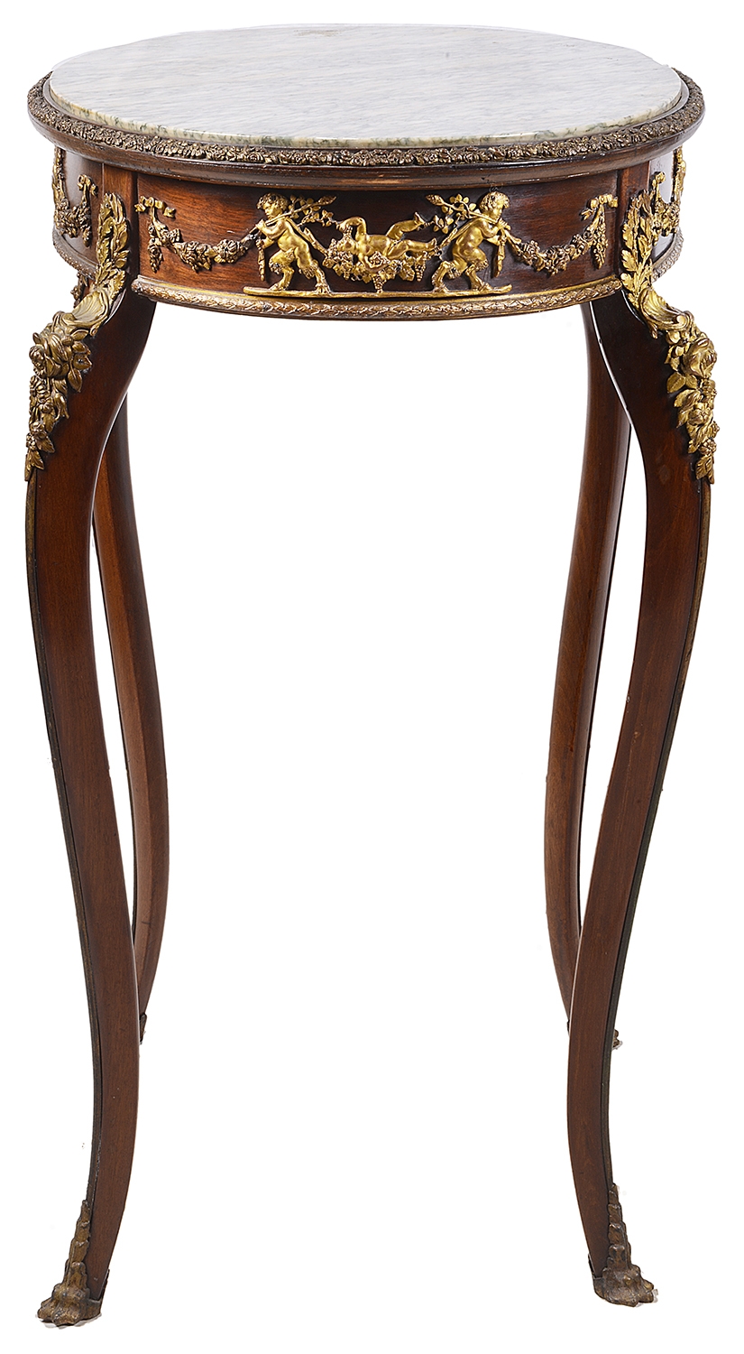 Fine quality near pair French marble topped side tables. In the manner of Linke