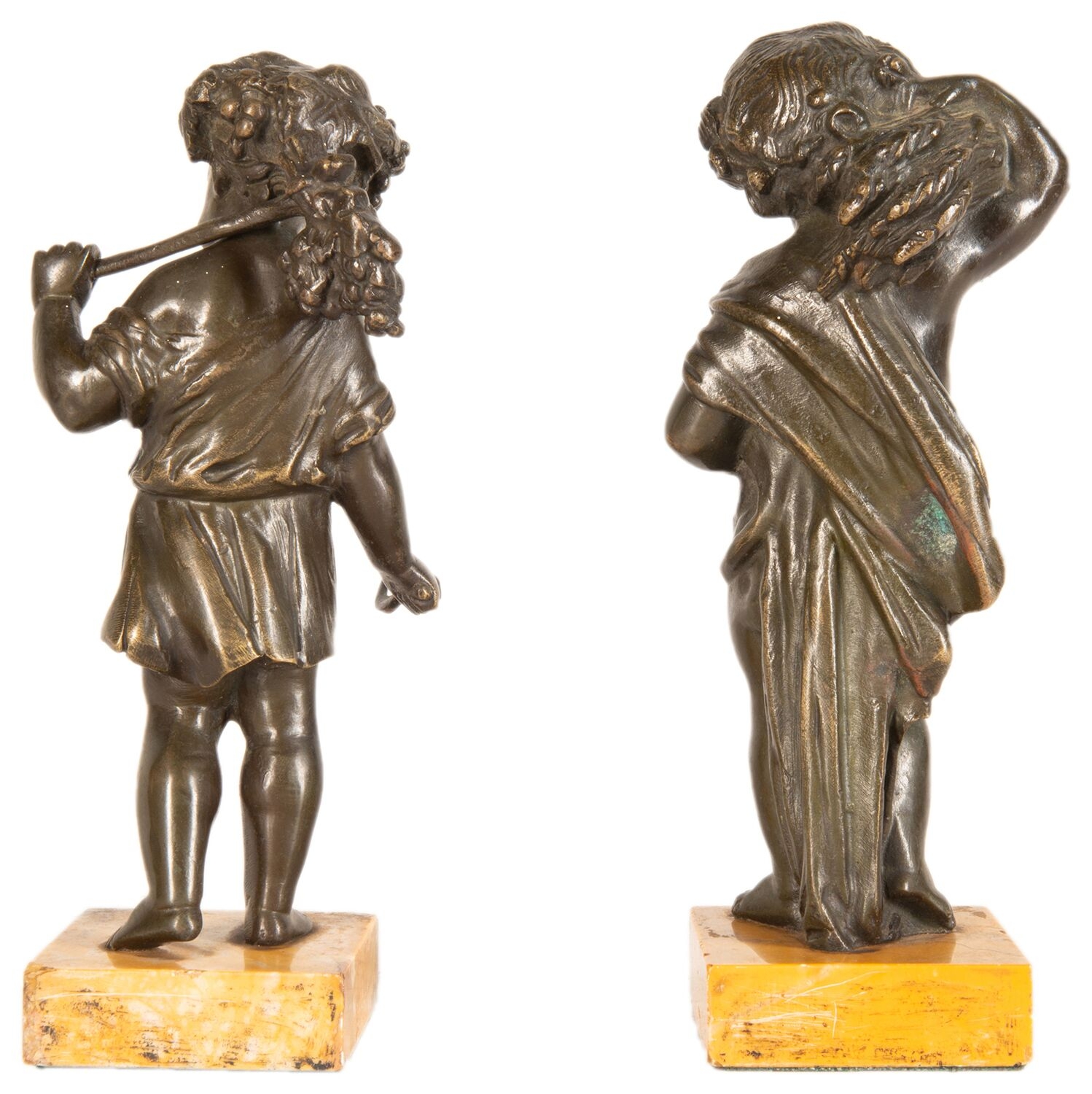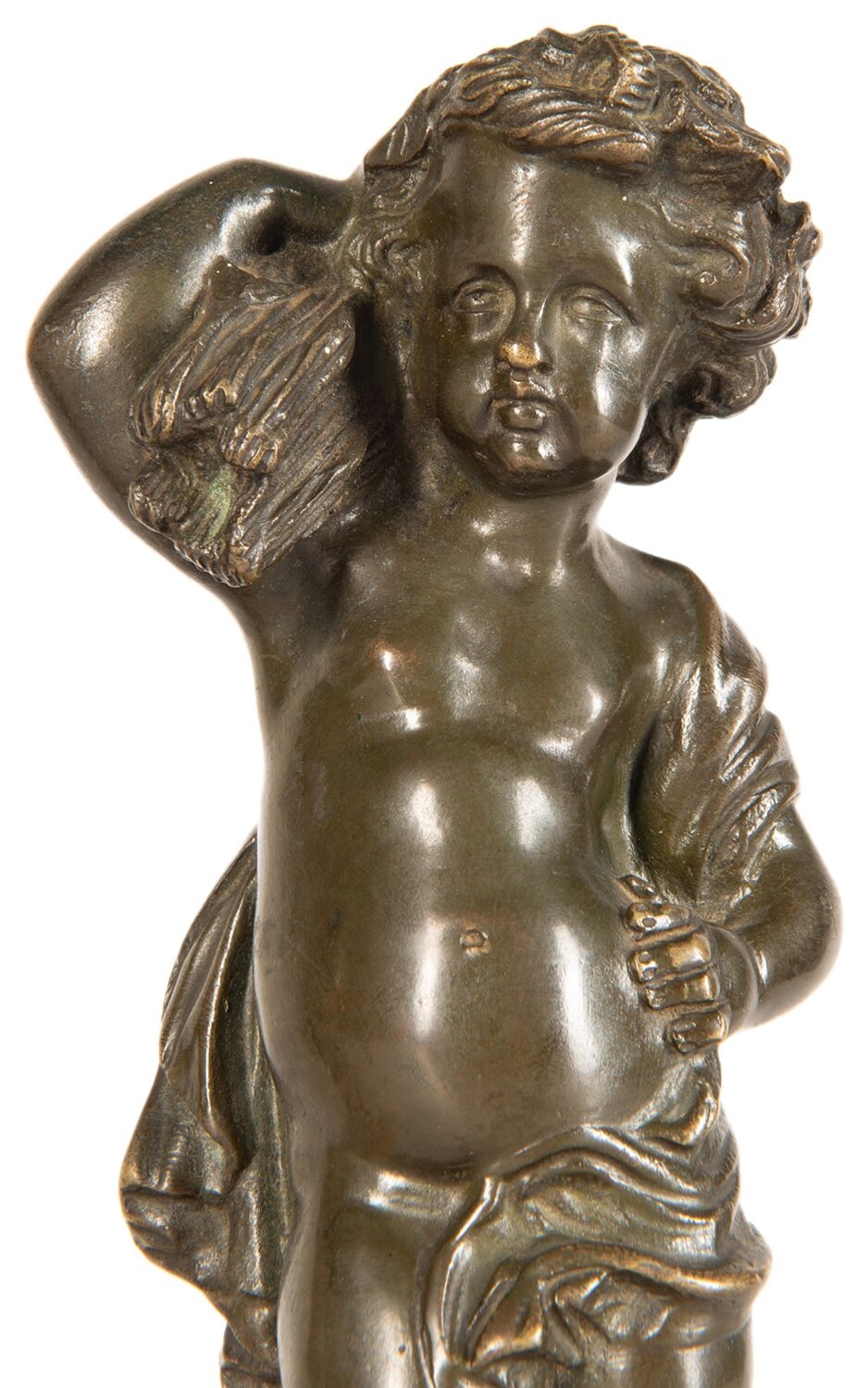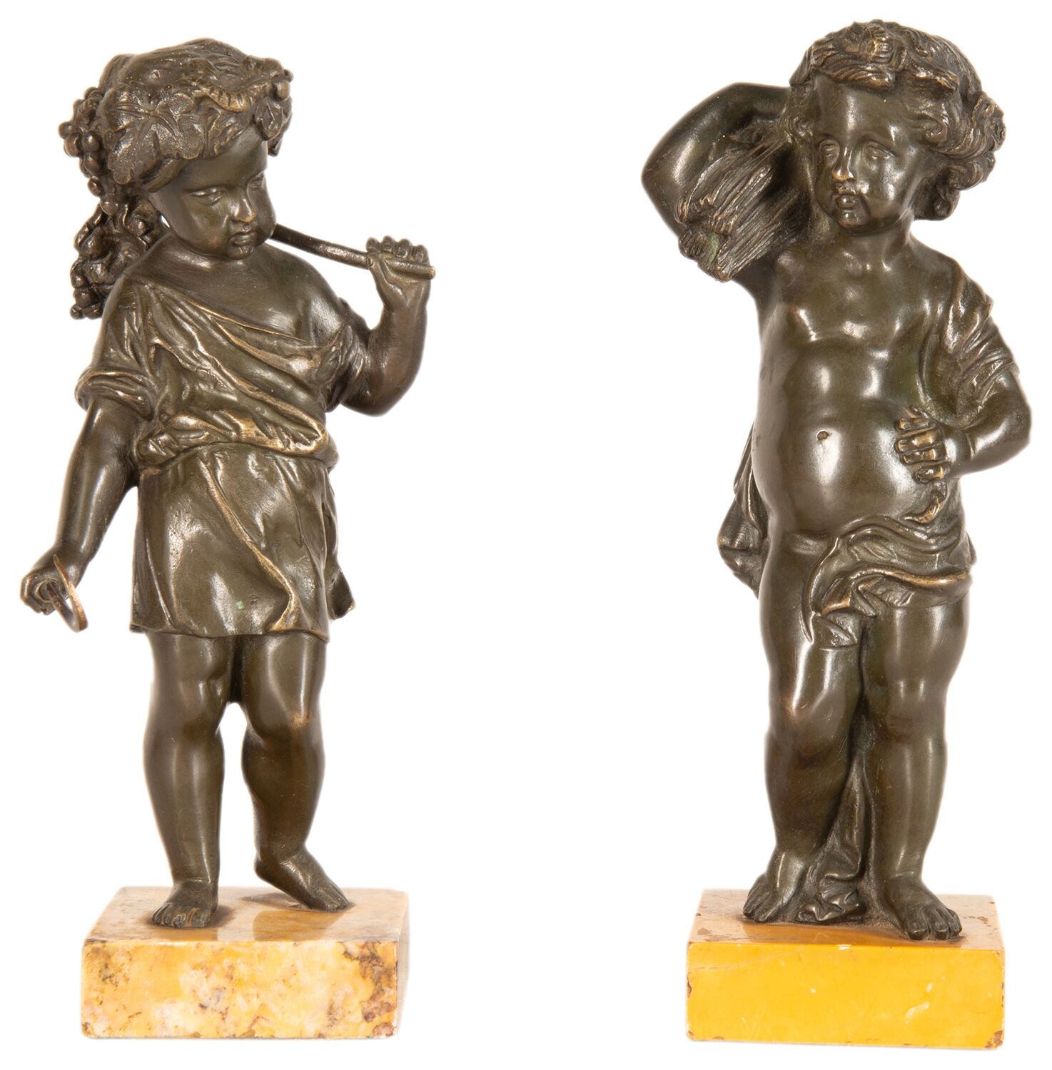 A good quality pair of 19th Century Bronze Cherubs on sand coloured marble bases. Both Cherubs are depict hunting activities.
