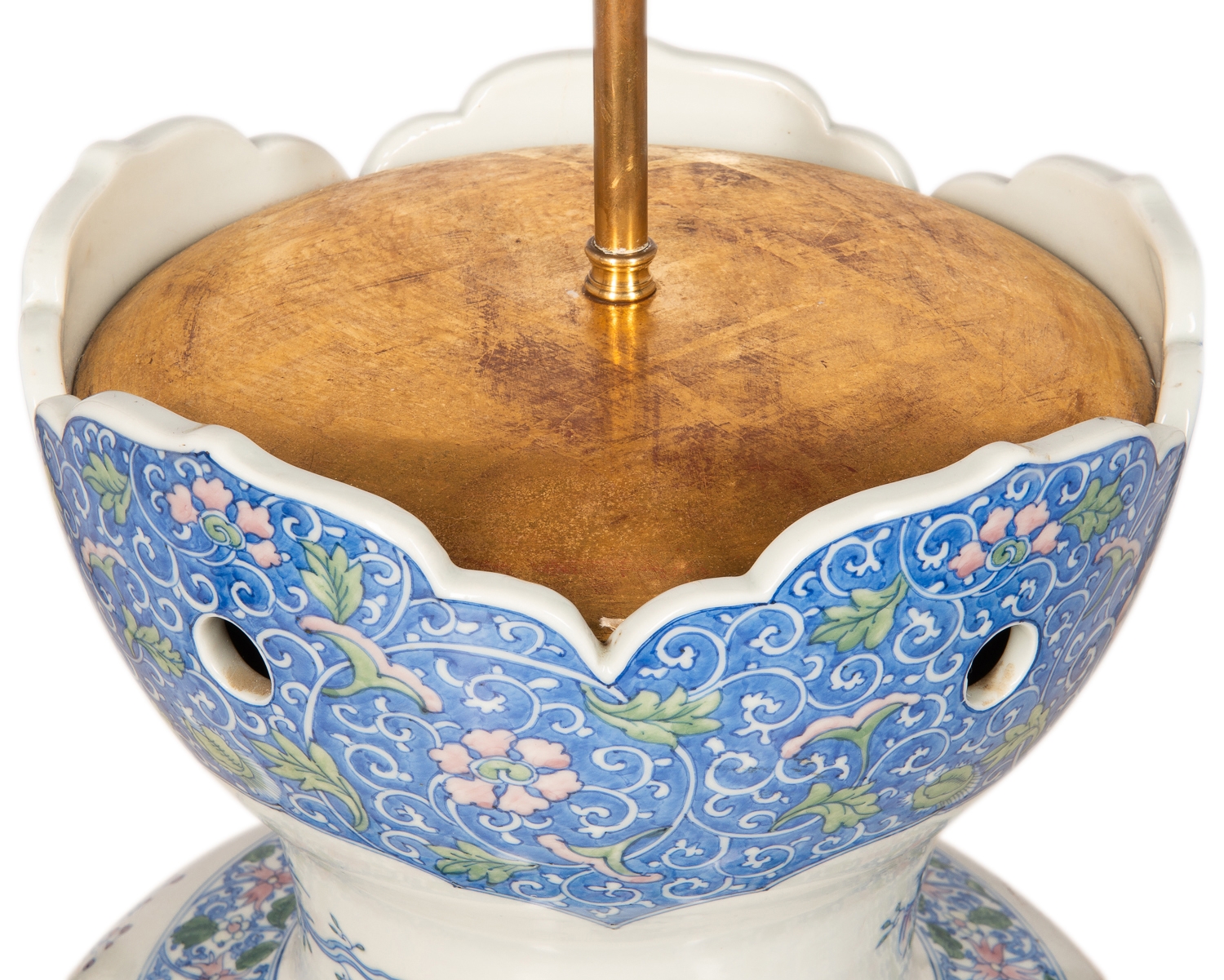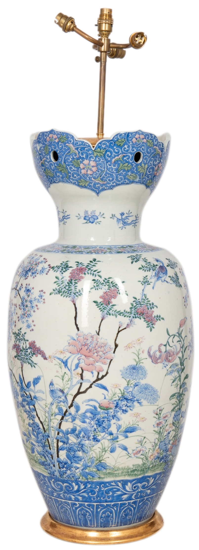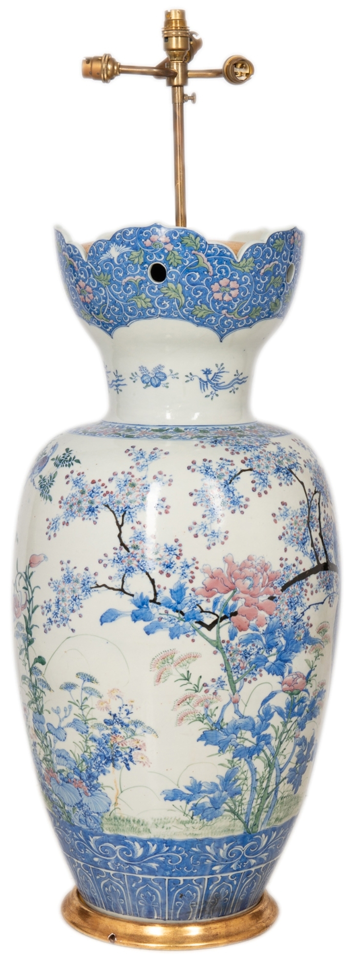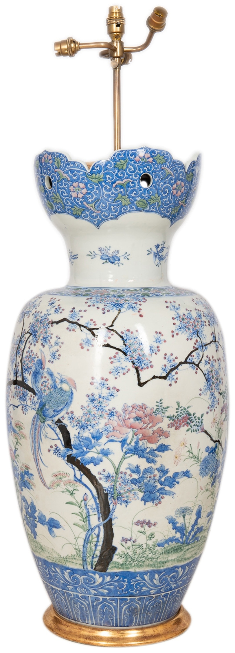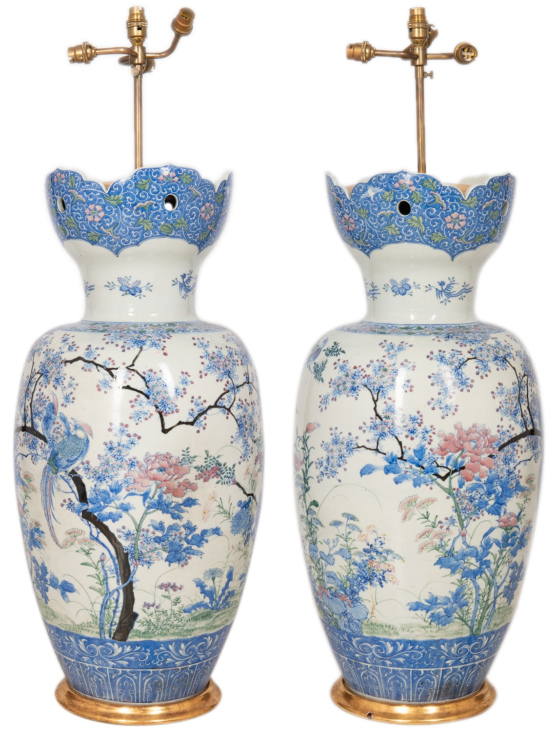 A large good quality pair of early 20th century Japanese Yokohama vases / lamps, each with flared necks, with pierced petal shaping, white ground, blue boarders with classical motif decoration. Wonderful exotic flowers, birds and blossom trees, mounted on gilded bases. Measures: 90 cm (35.5”).