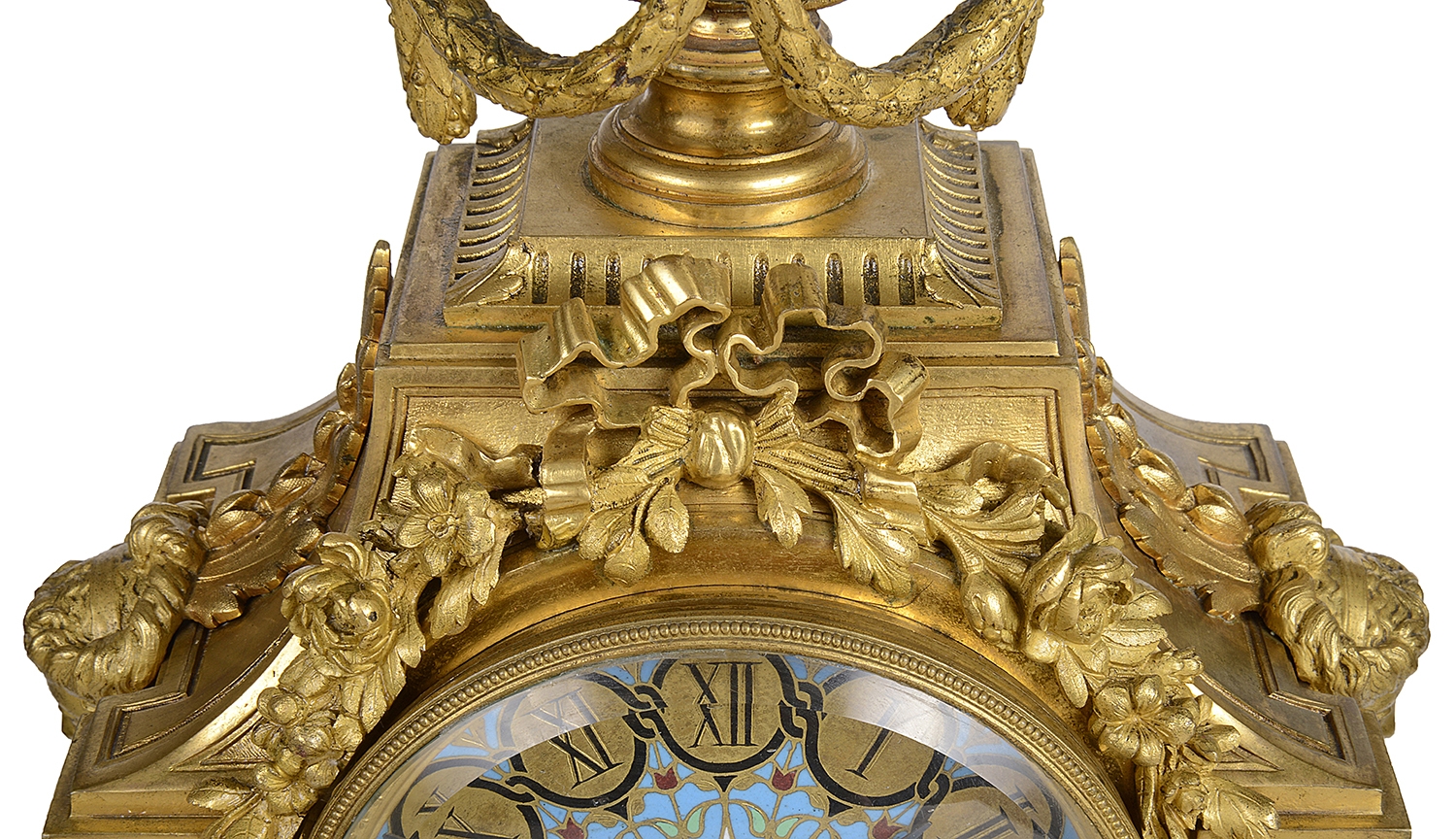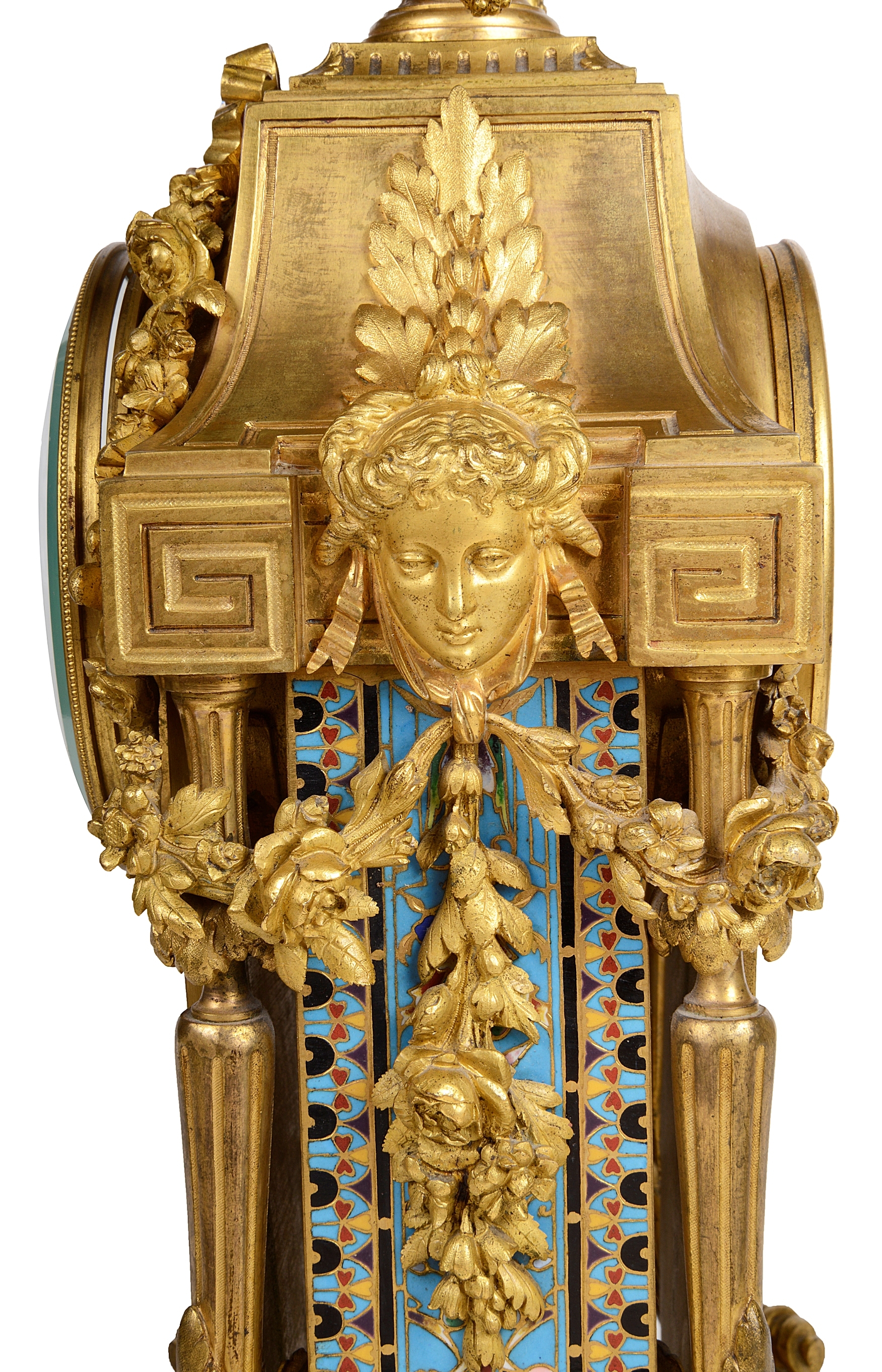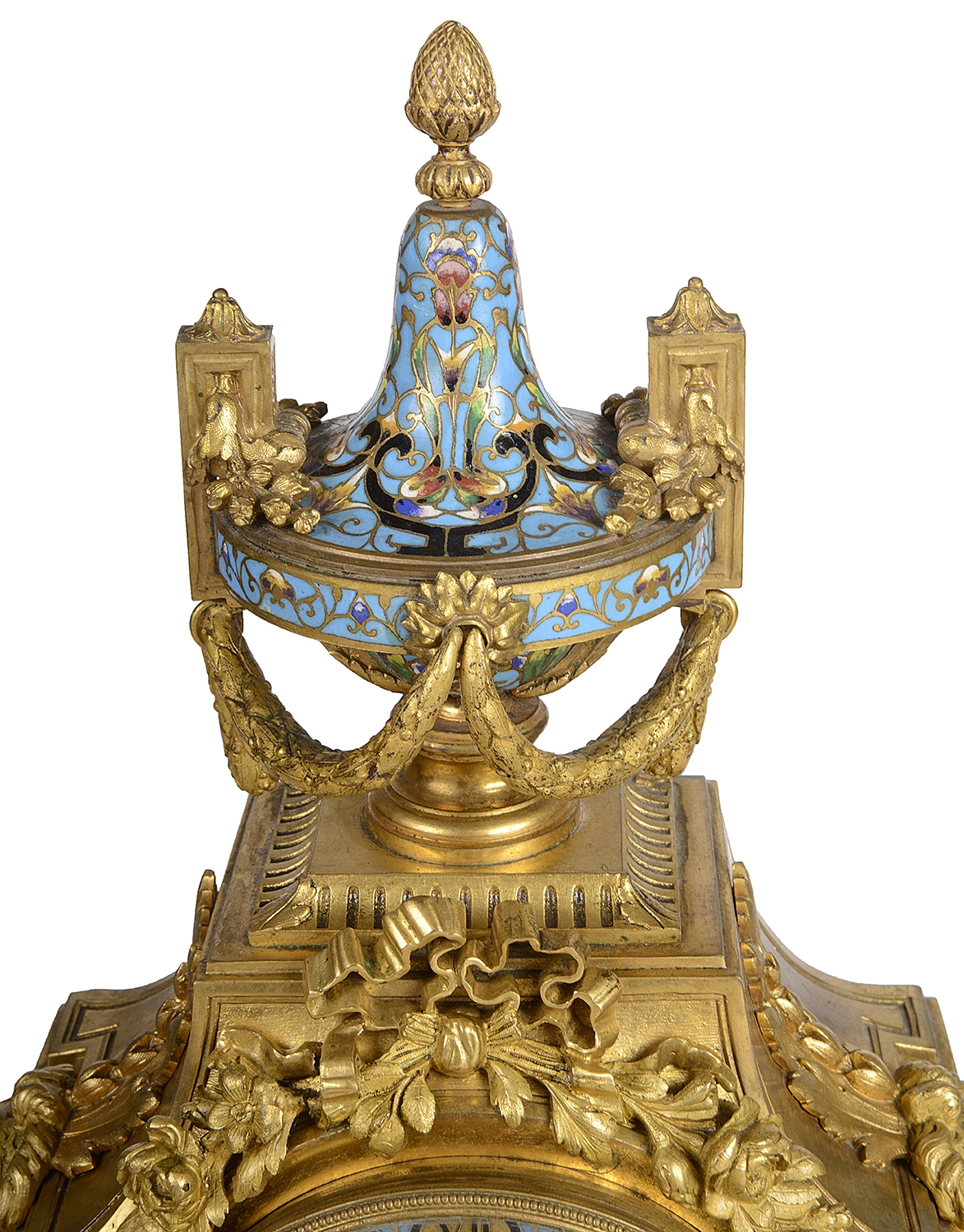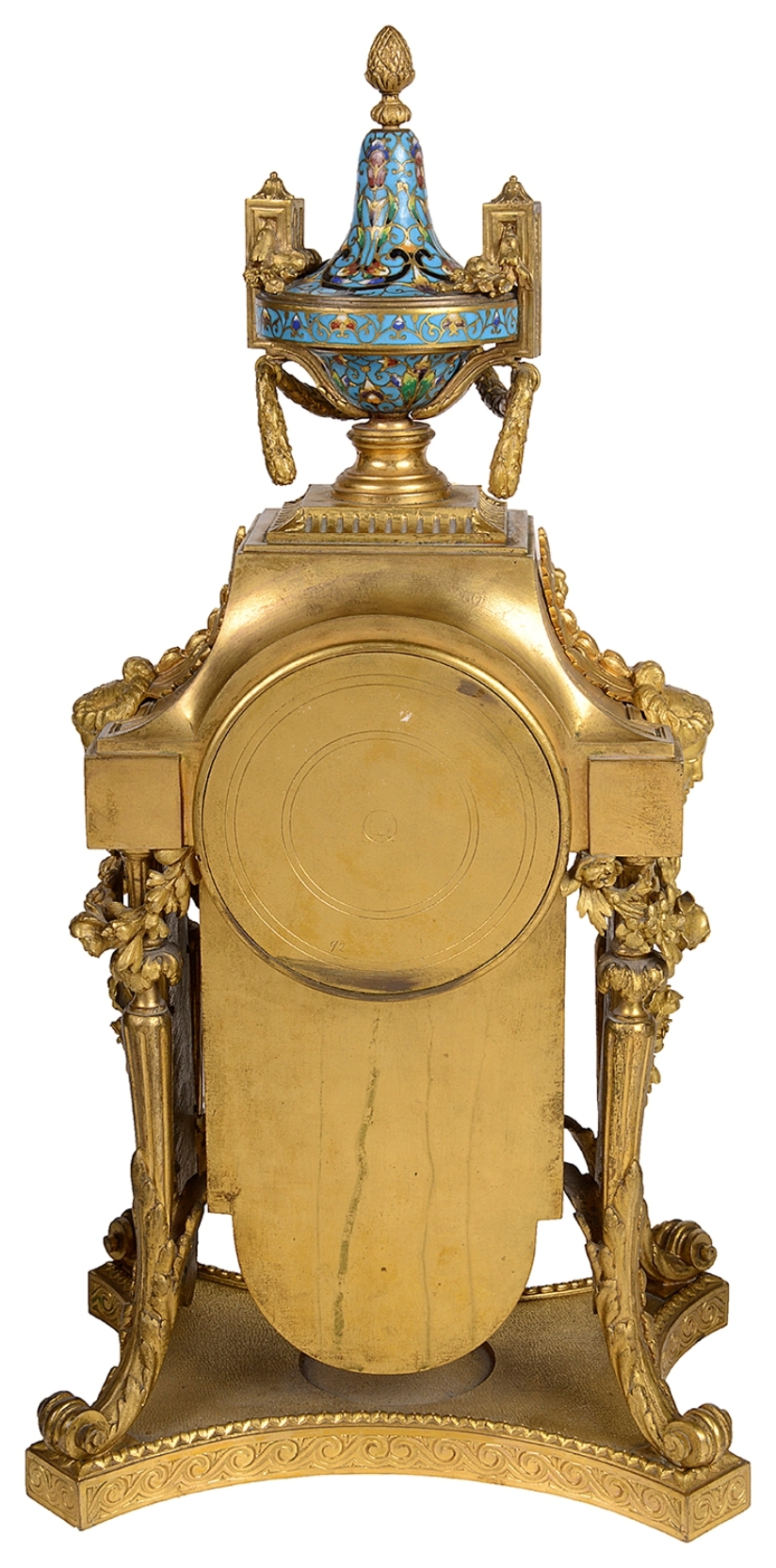 A wonderful quality late 19th century French Louis XVI style gilded ormolu and Champlevé; enamel clock garniture, the clock having a two handled turquoise enamel urn with swags above the floral and ribbon decorated eight day duration hour and half hour chiming clock , again with wonderful enamel decoration, four out swept scrolling leaf supports, an enamel apron and mounted on a plinth base. The pair of classical urns either side, enamel tapering bodies, mounted with female masks with fruit beneath, scrolling supports and plinth bases. Clock ; 48cm (19")high Urns 31cm (12") high