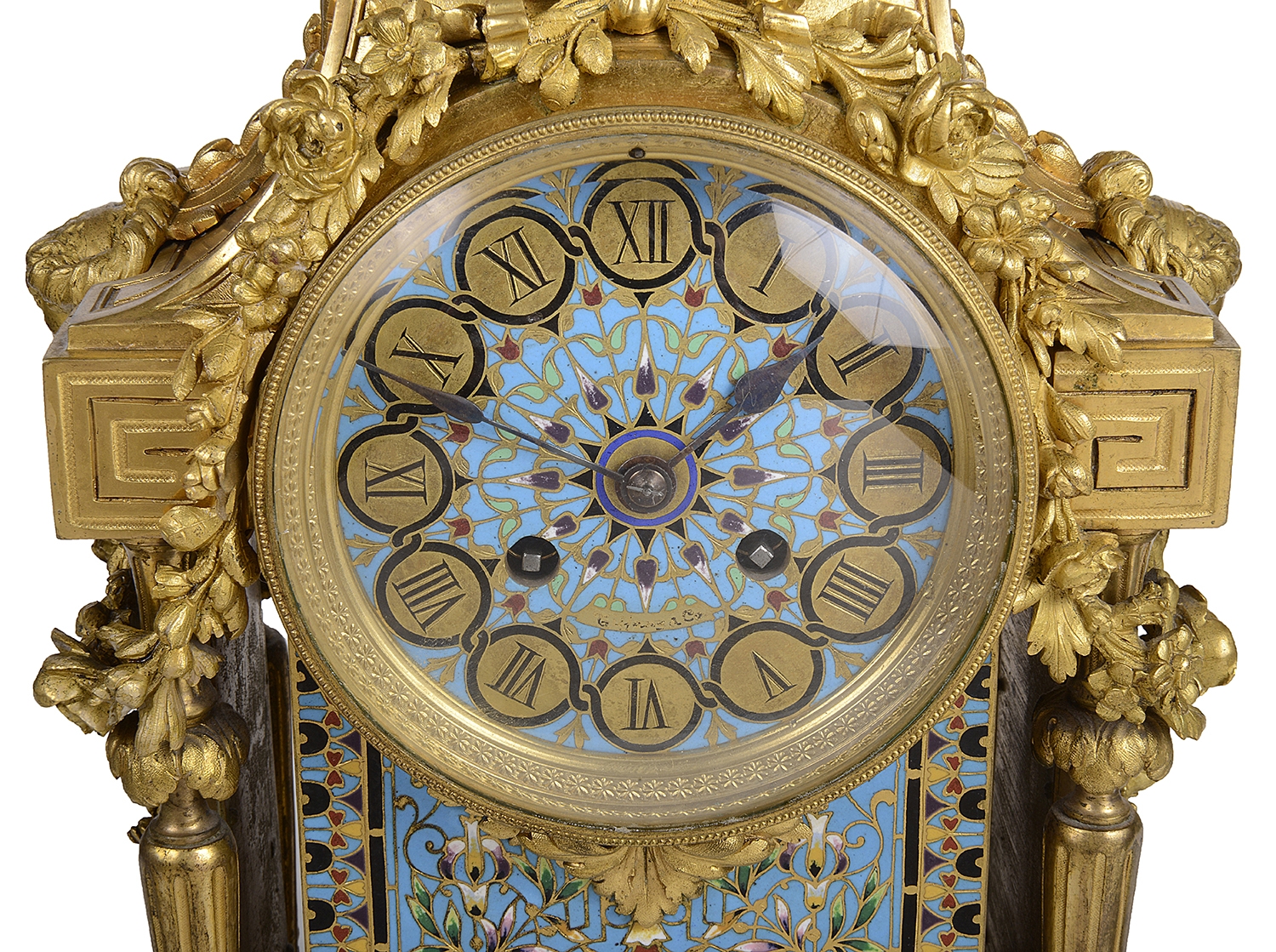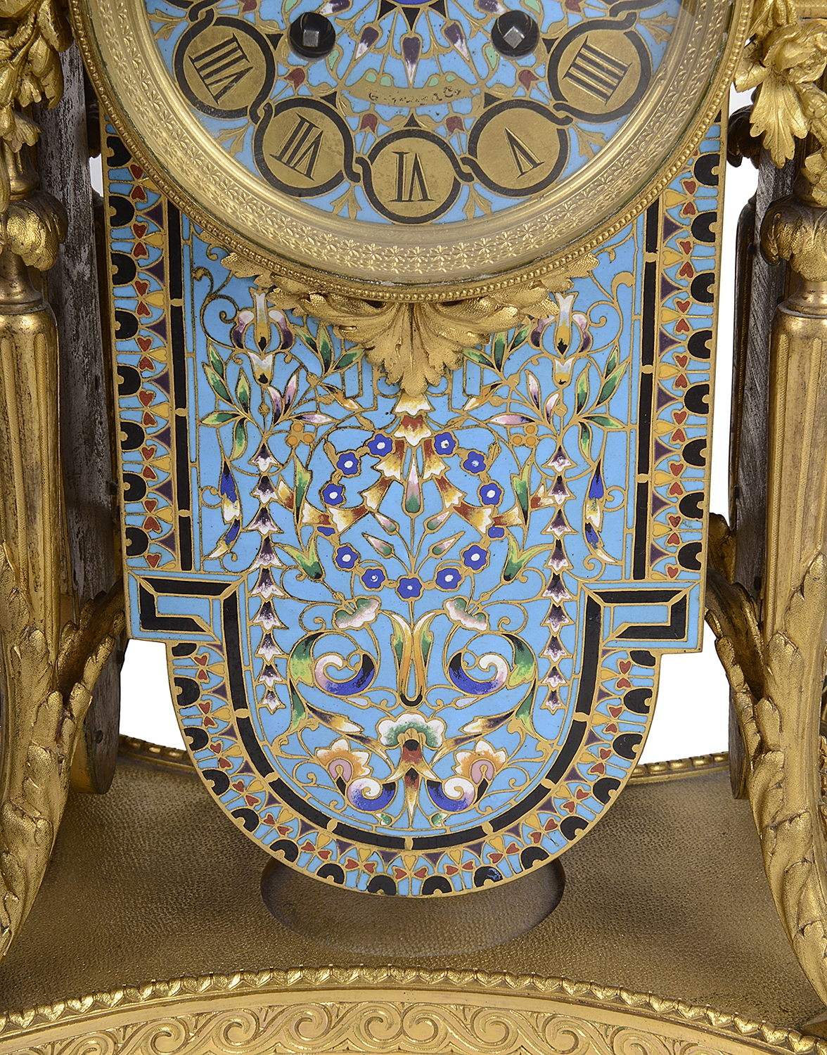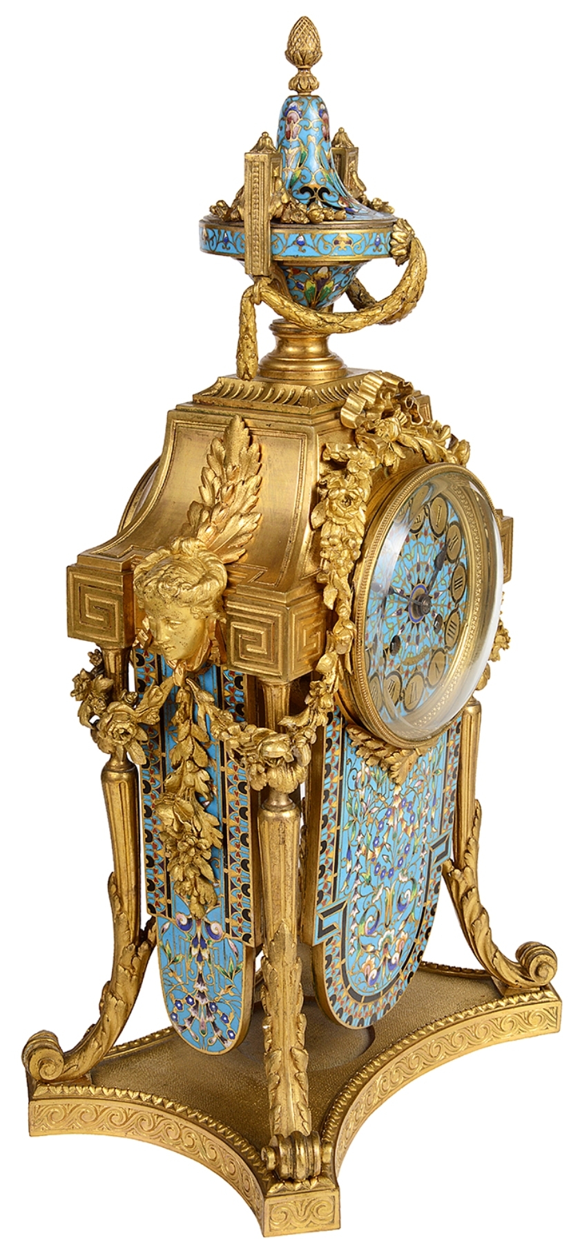 A wonderful quality late 19th century French Louis XVI style gilded ormolu and Champlevé; enamel clock garniture, the clock having a two handled turquoise enamel urn with swags above the floral and ribbon decorated eight day duration hour and half hour chiming clock , again with wonderful enamel decoration, four out swept scrolling leaf supports, an enamel apron and mounted on a plinth base. The pair of classical urns either side, enamel tapering bodies, mounted with female masks with fruit beneath, scrolling supports and plinth bases. Clock ; 48cm (19")high Urns 31cm (12") high