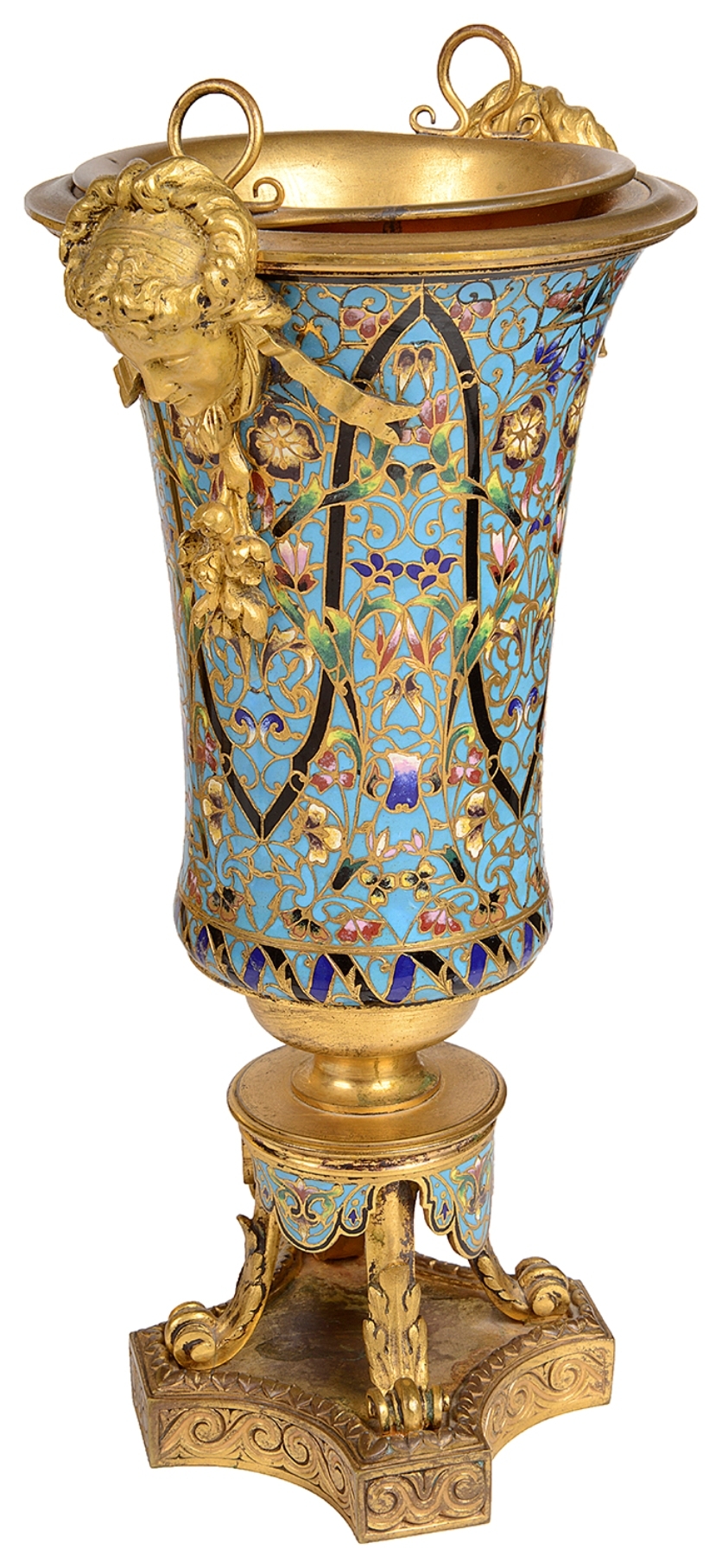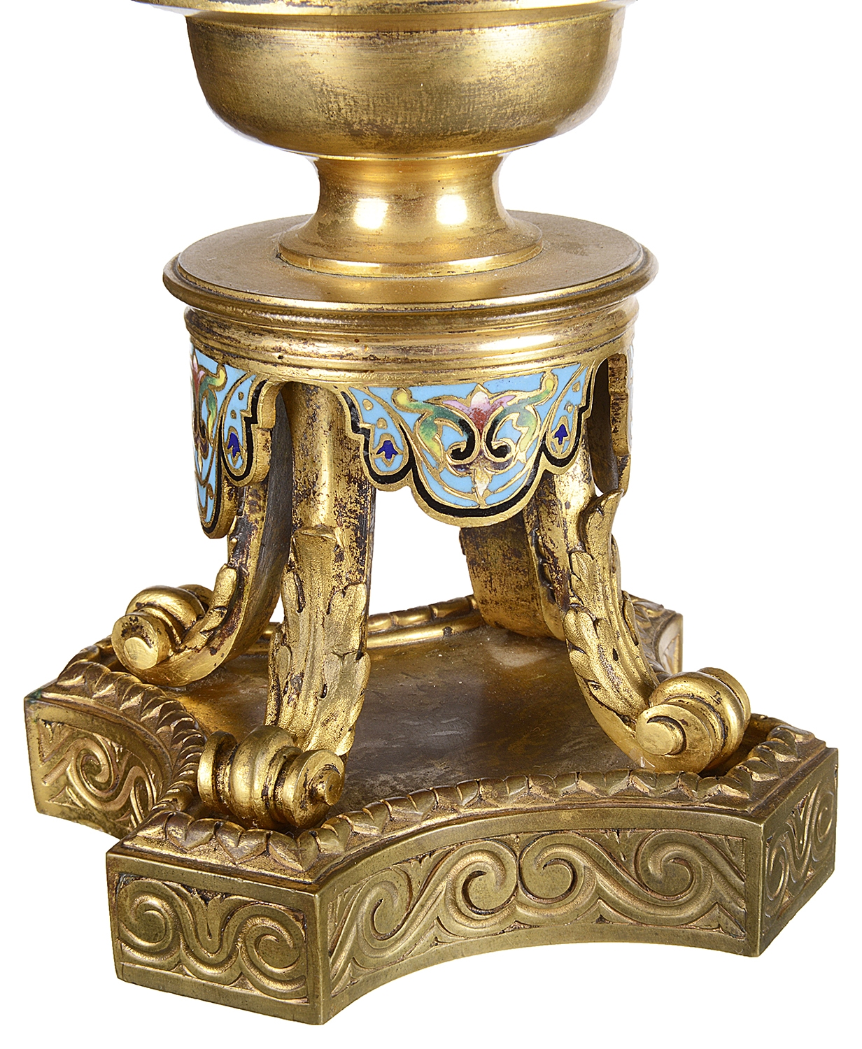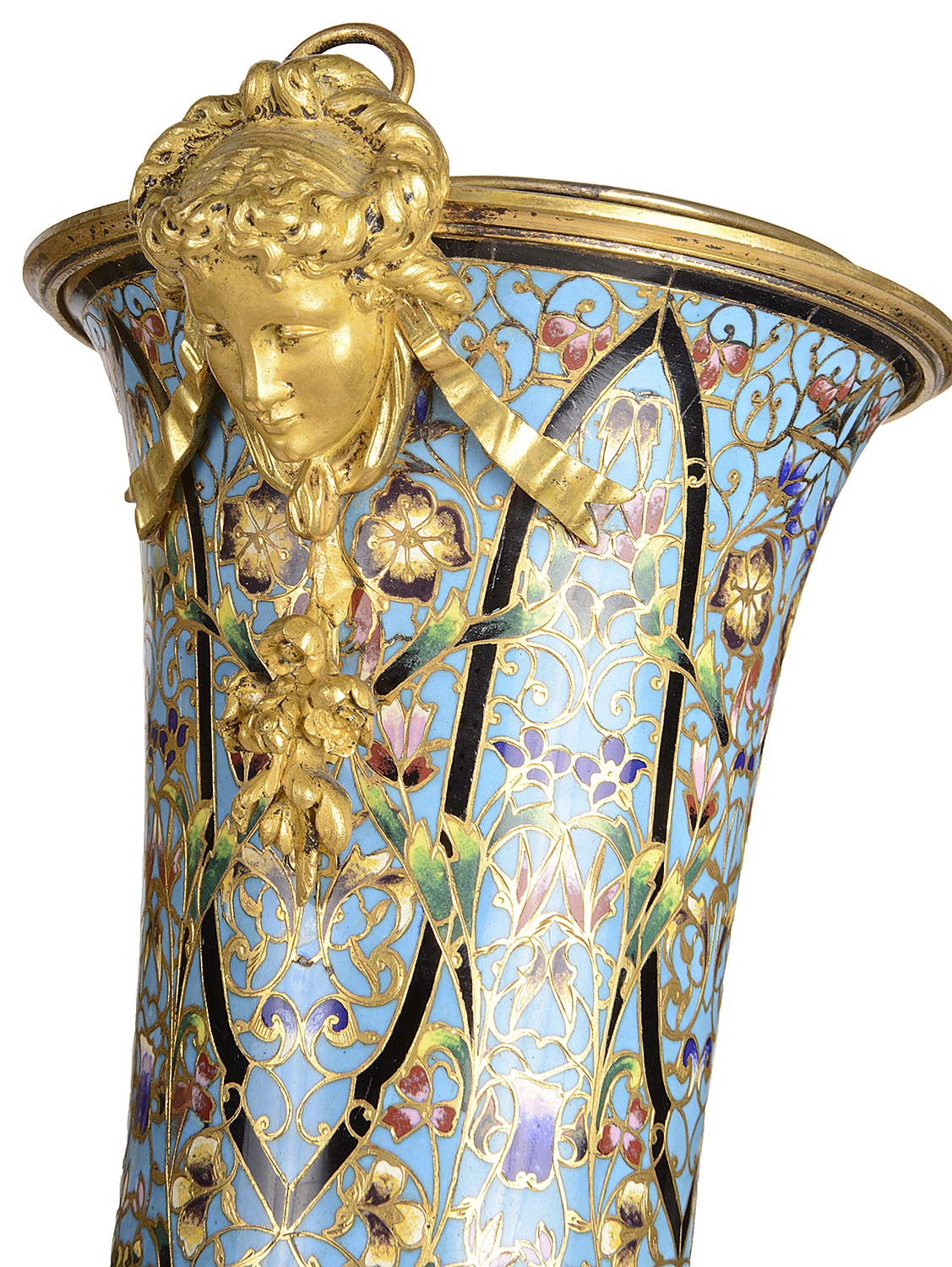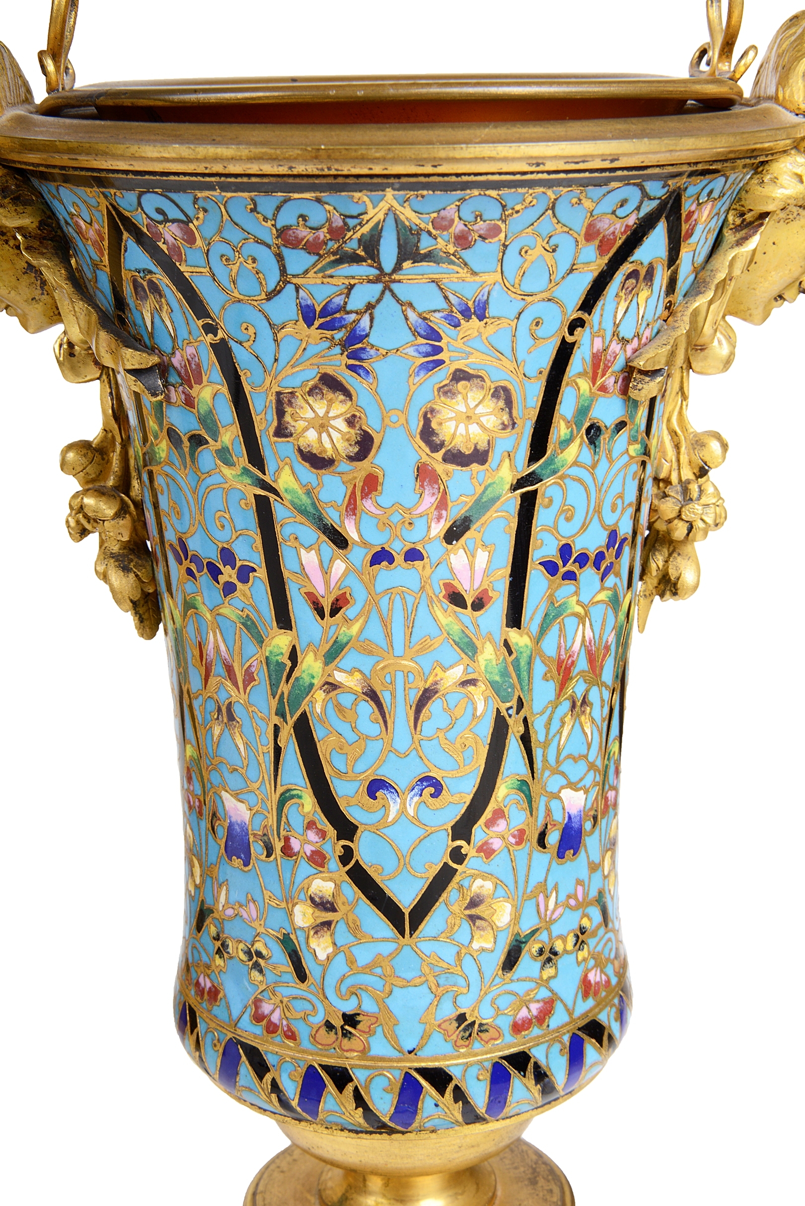 A wonderful quality late 19th century French Louis XVI style gilded ormolu and Champlevé; enamel clock garniture, the clock having a two handled turquoise enamel urn with swags above the floral and ribbon decorated eight day duration hour and half hour chiming clock , again with wonderful enamel decoration, four out swept scrolling leaf supports, an enamel apron and mounted on a plinth base. The pair of classical urns either side, enamel tapering bodies, mounted with female masks with fruit beneath, scrolling supports and plinth bases. Clock ; 48cm (19")high Urns 31cm (12") high