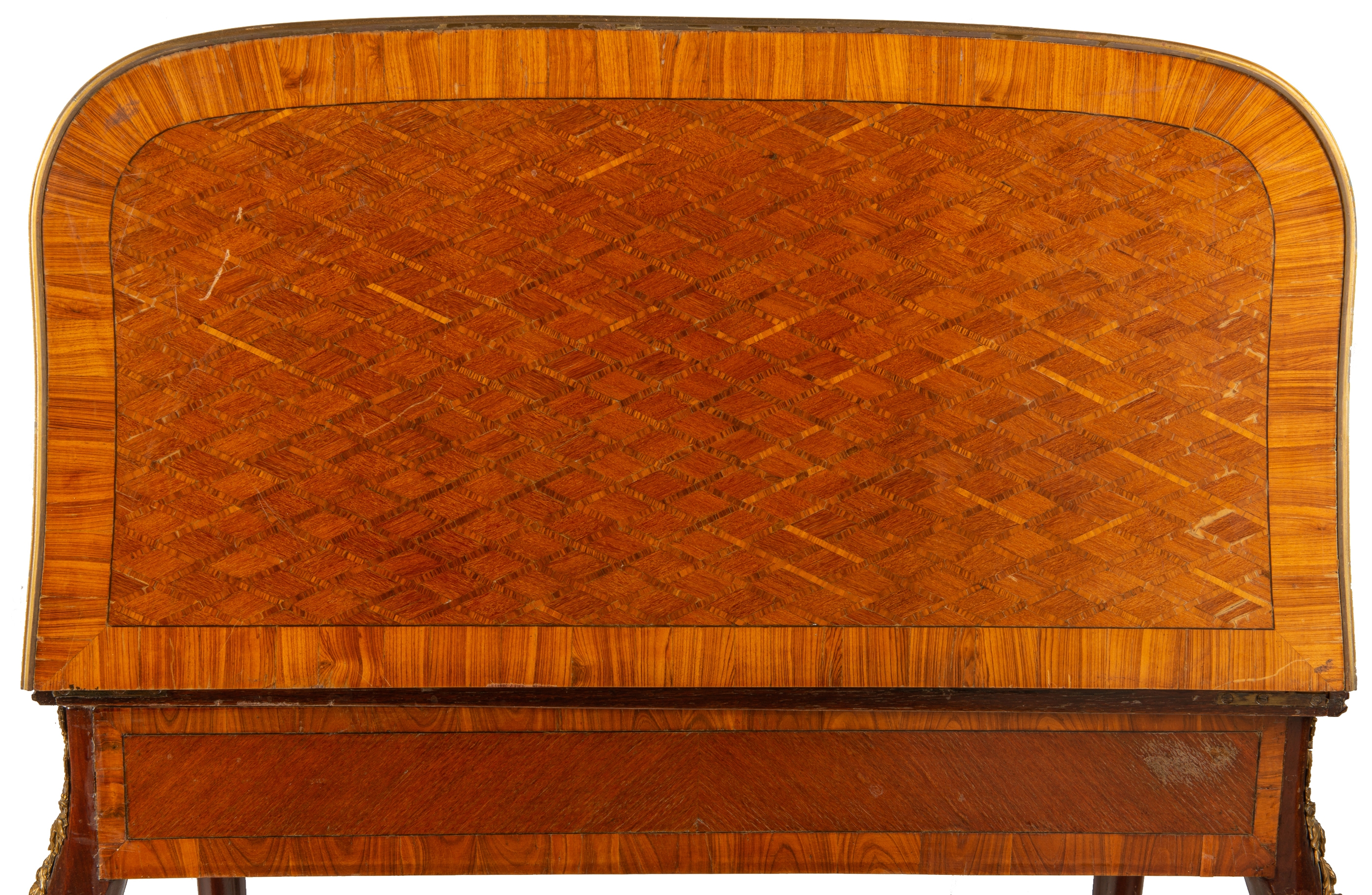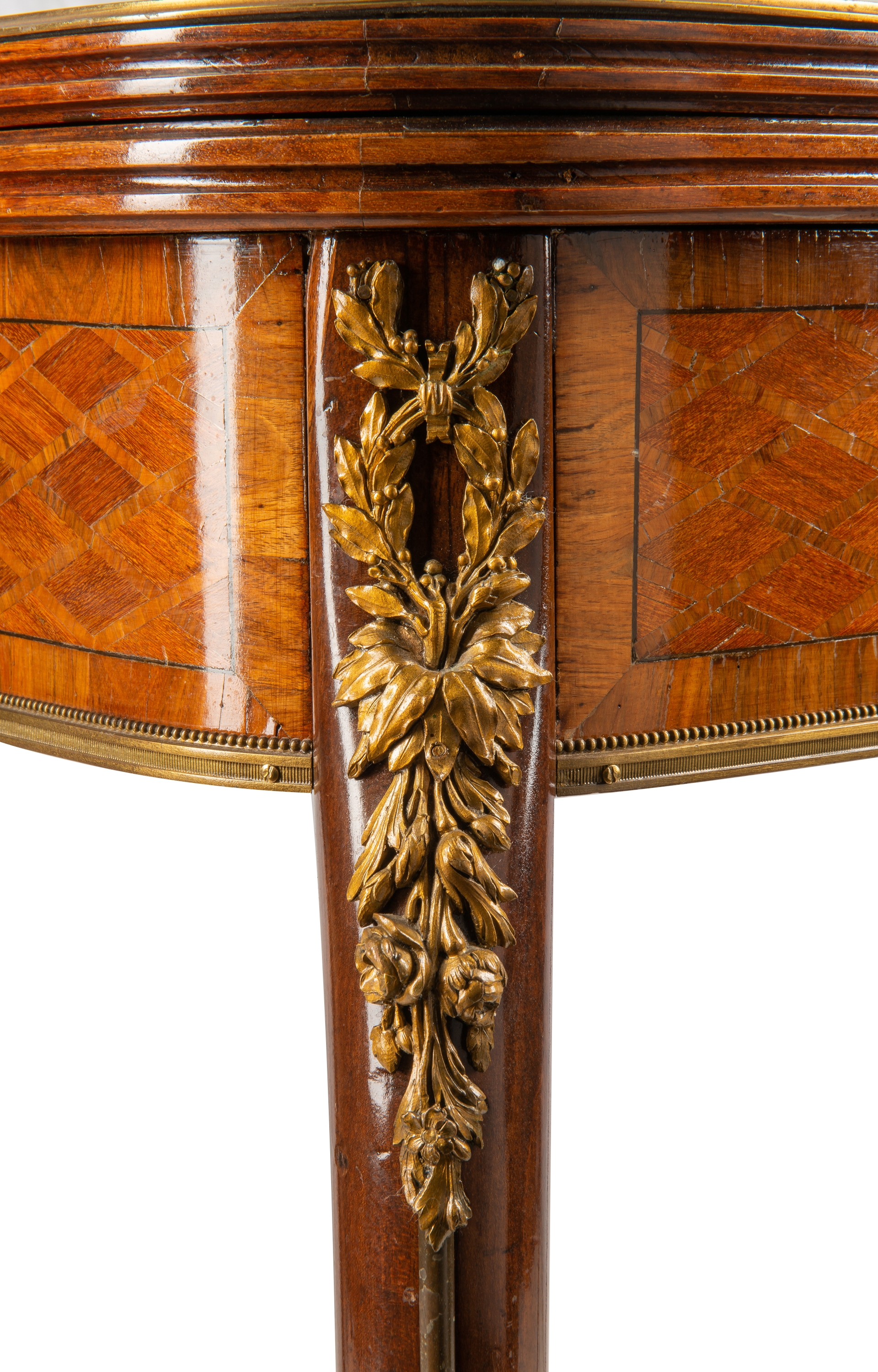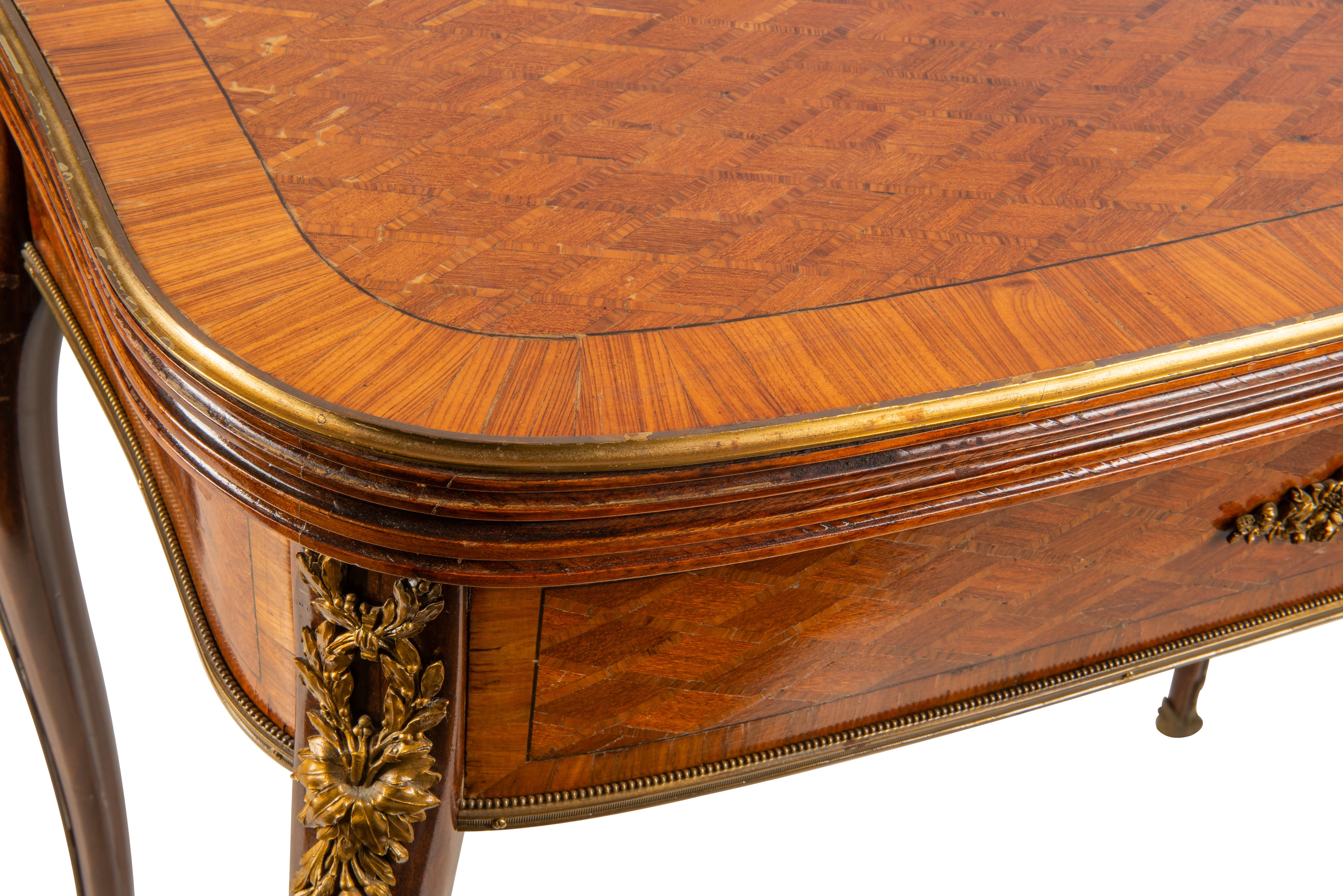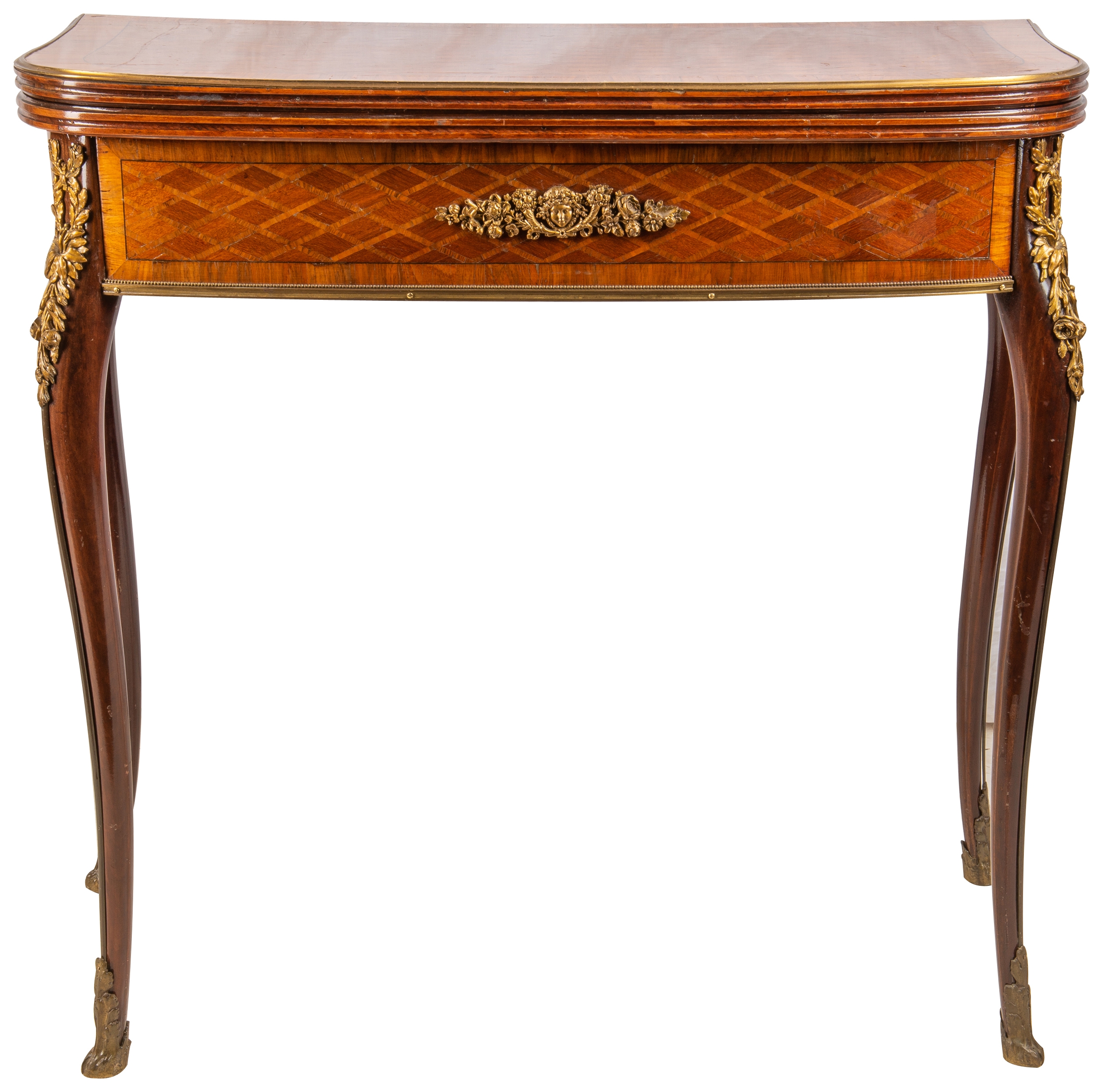 A very good quality late 19th Century French parquetry inlaid folding card table in the Louis XVI style. The top opening to reveal a card table, parquetry inlay also to the frieze, gilded ormolu mounts, and raised on elegant cabriole legs. In the manner of Linke.