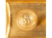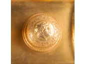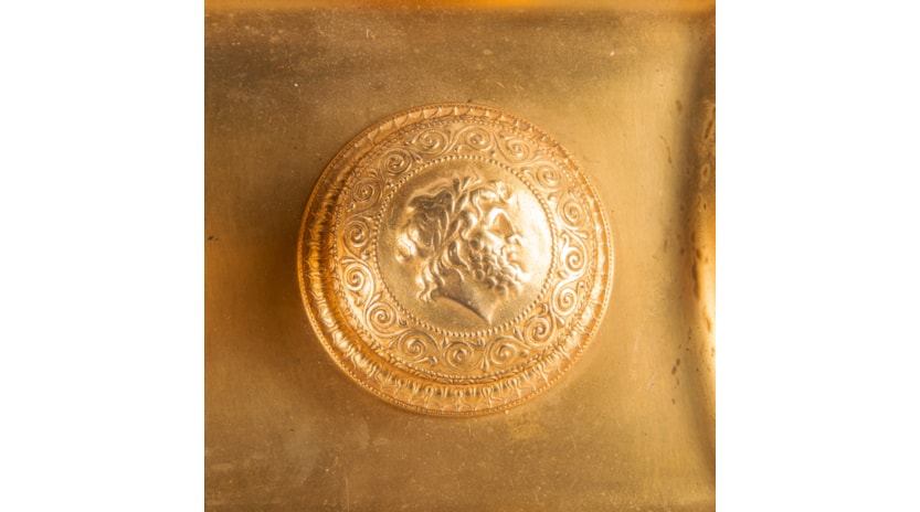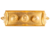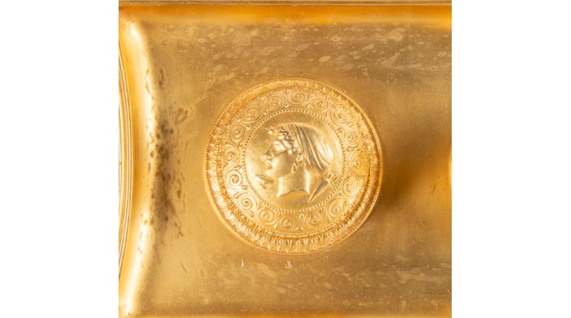 A good quality late 19th Century French gilded ormolu Gran Tour influenced gilded ormolu ink well, having classing motifs and Roman centurion bust embossed to the lids. Stamped; Barbedienne