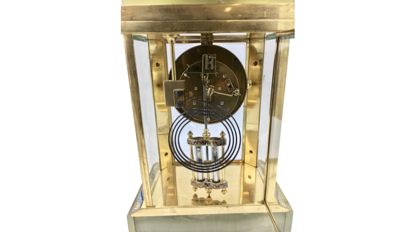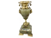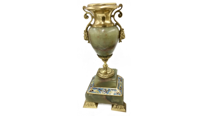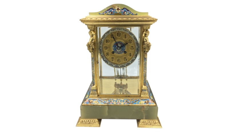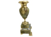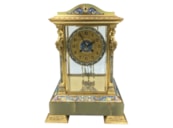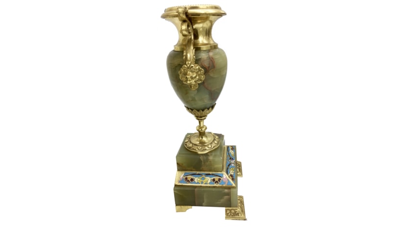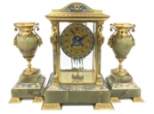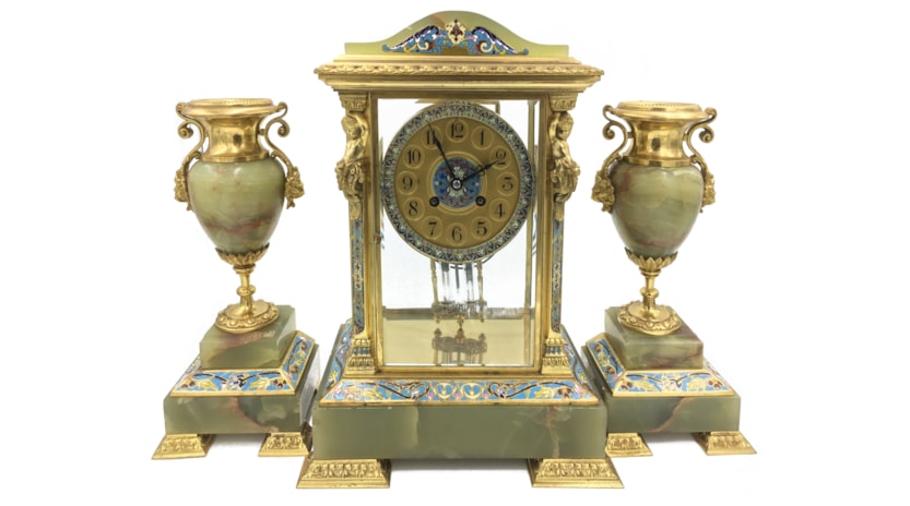 A very good quality late 19th Century French gilded ormolu, Onyx and champlevé; enamel clock garniture. Having a shaped Onyx top, ormolu mouldings, caryatid supports with enamel panels beneath, the gilded clock face having an eight day duration movement that chimes on the hour and half hour. A pair of matching Onyx urns with scrolling gilded ormolu handles and Lion masks set on stepped bases.