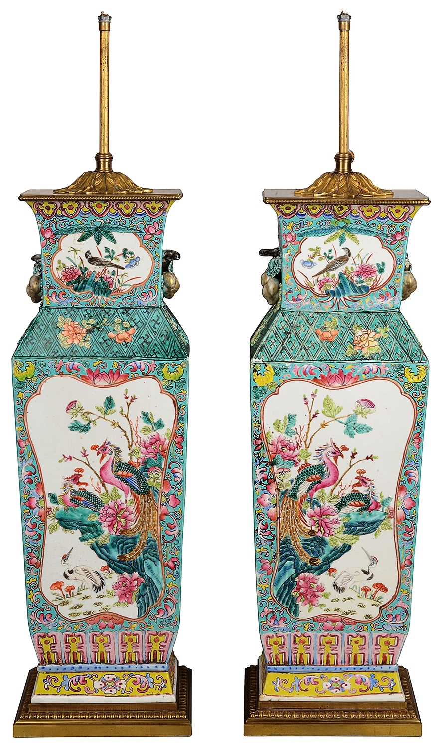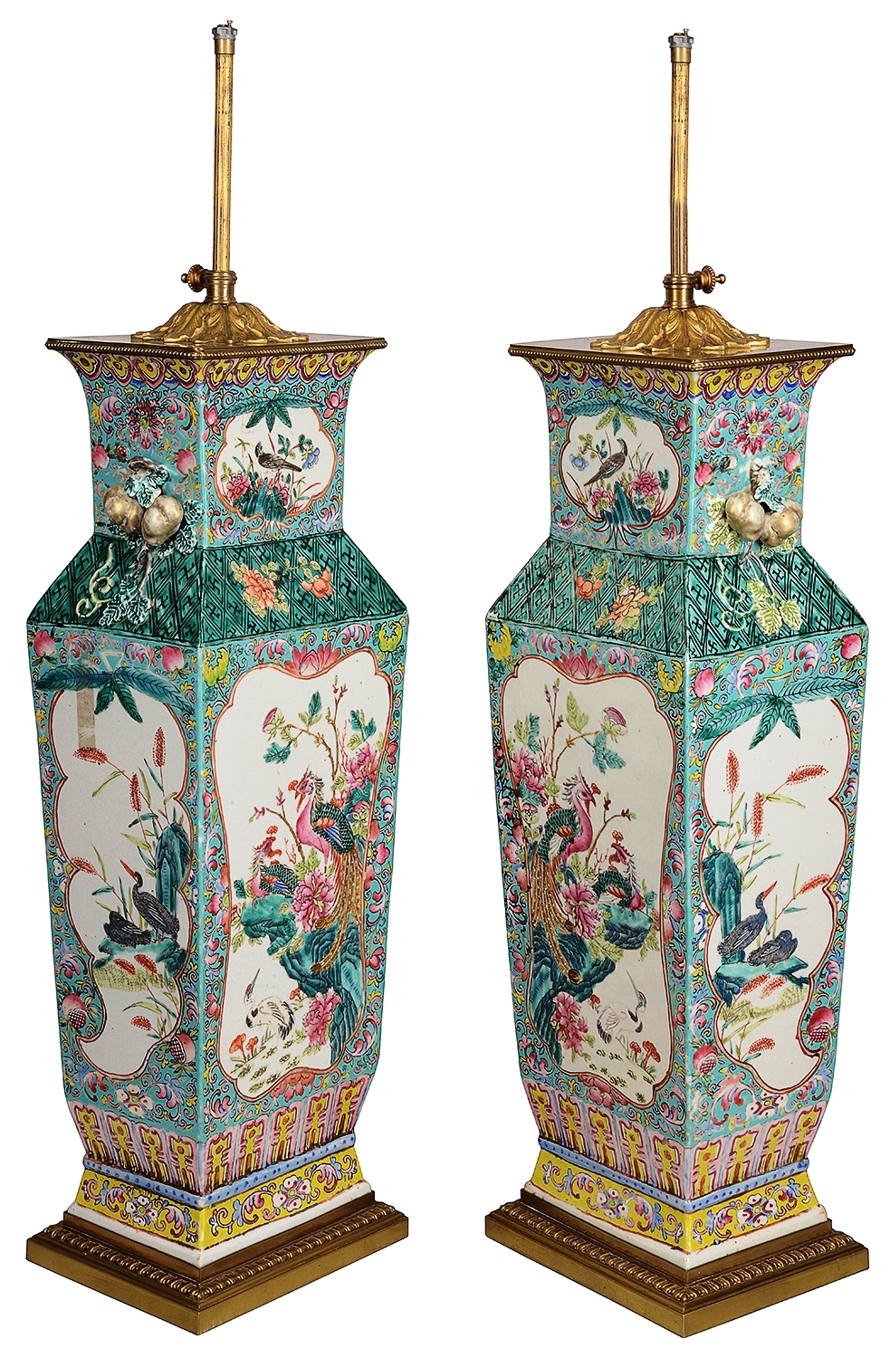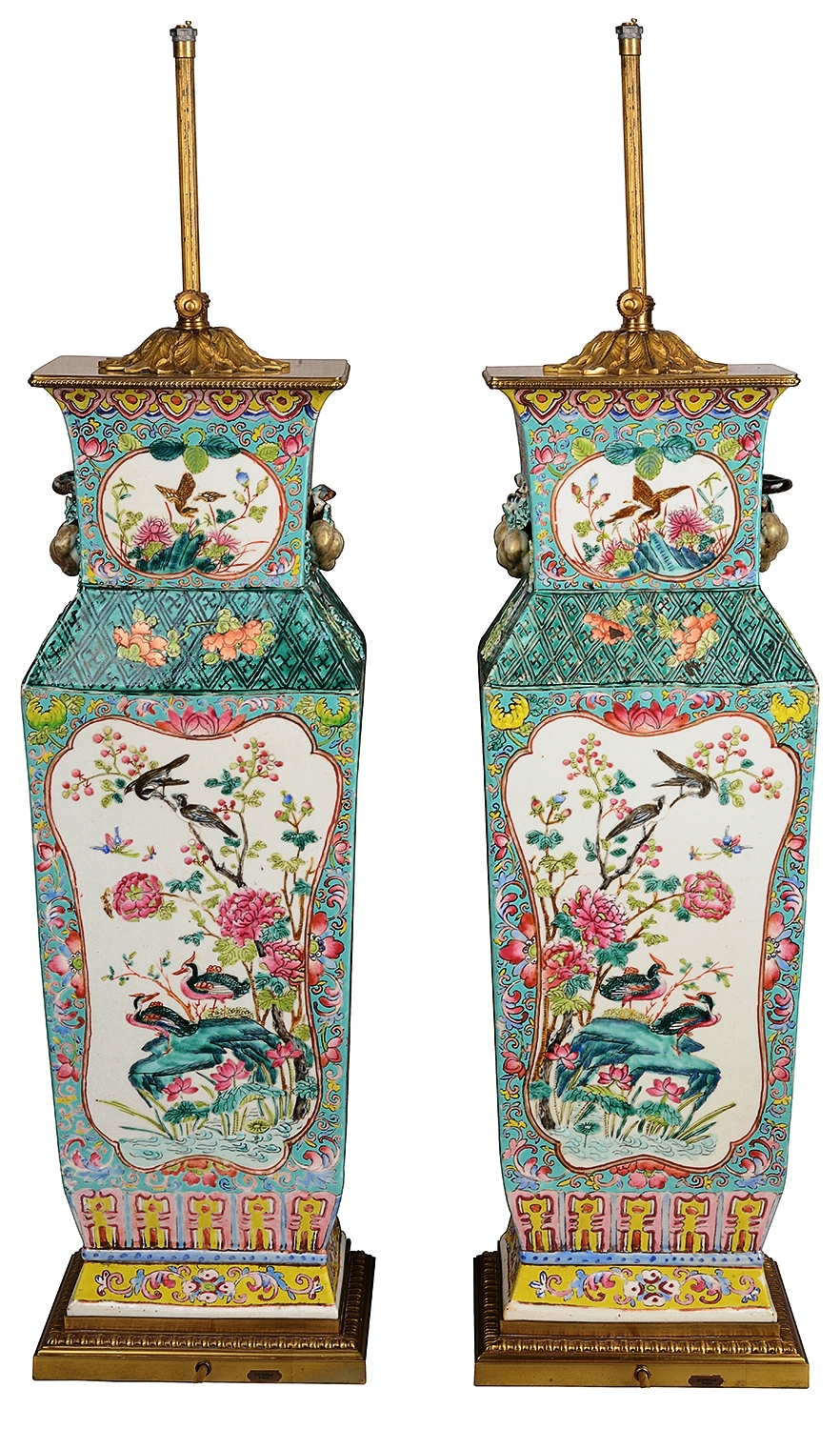 A very good quality pair of Chinese Famille Rose vases / lamps. Each with Turquoise ground, stylized fruit handles on either side, inset hand painted panels depicting exotic Peacocks and Ducks among flowers and rocks. Set on gilded ormolu bases and tops with leaf decoration.