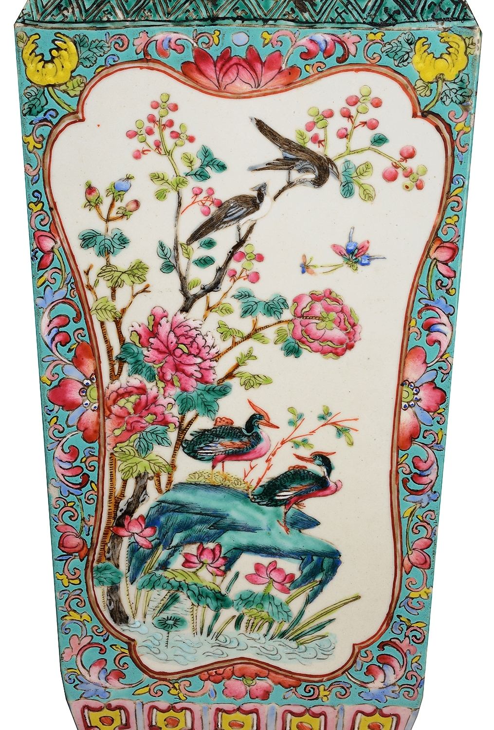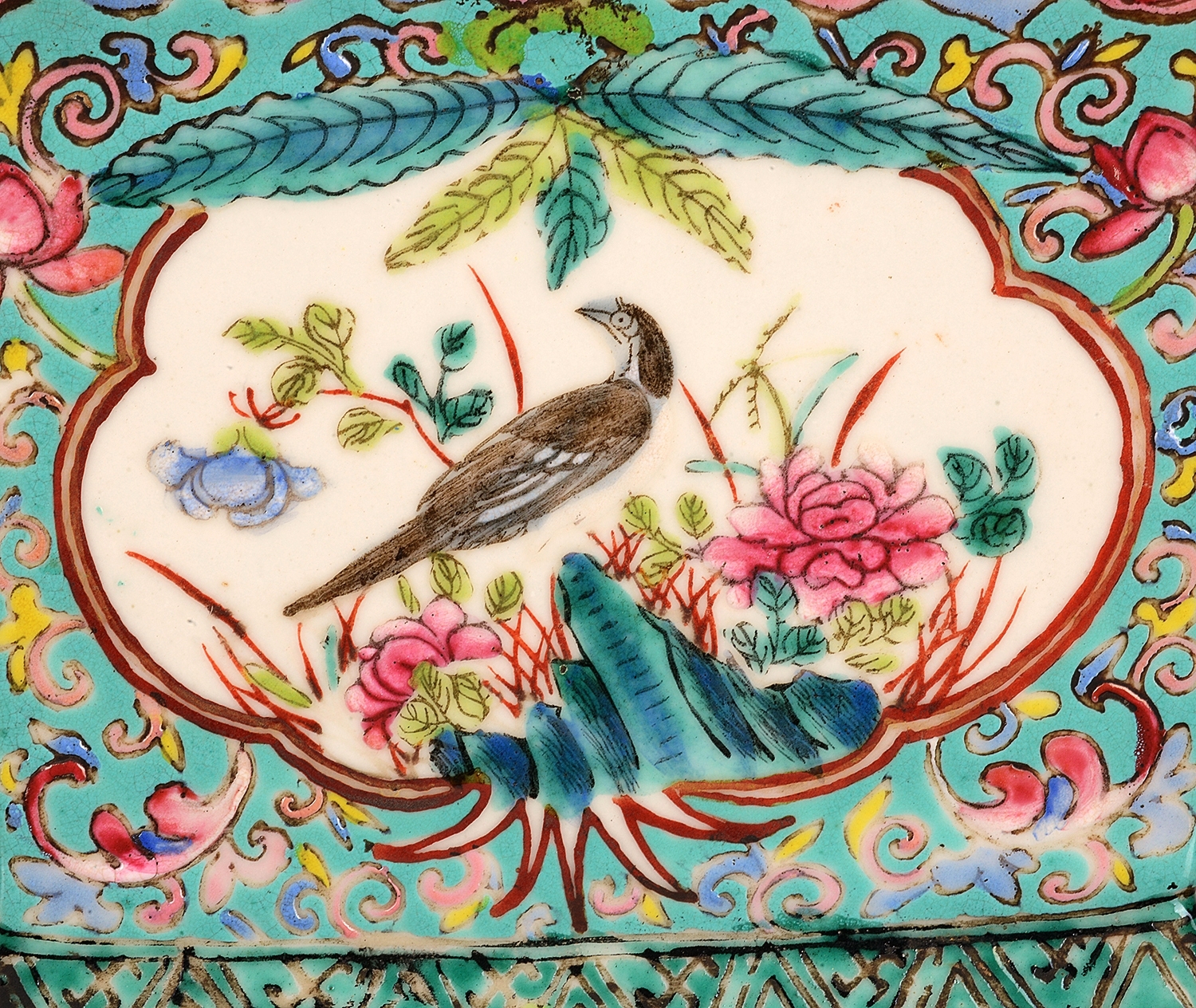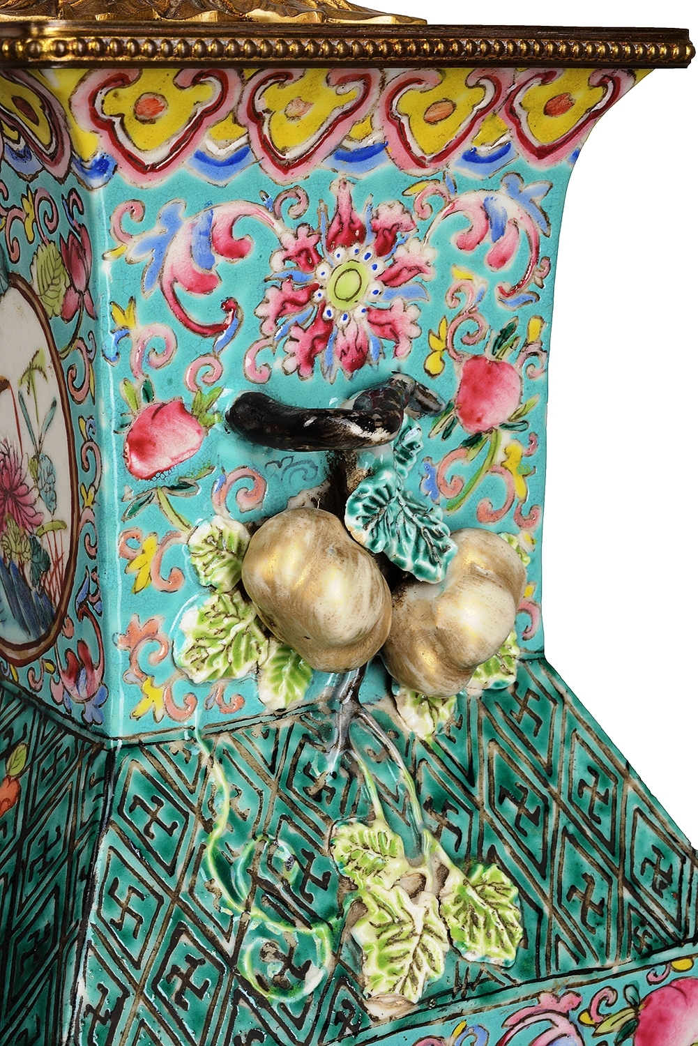 A very good quality pair of Chinese Famille Rose vases / lamps. Each with Turquoise ground, stylized fruit handles on either side, inset hand painted panels depicting exotic Peacocks and Ducks among flowers and rocks. Set on gilded ormolu bases and tops with leaf decoration.