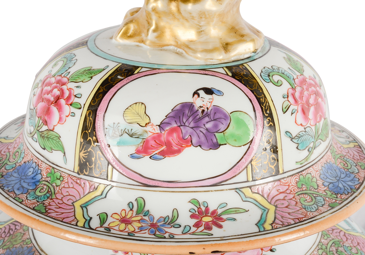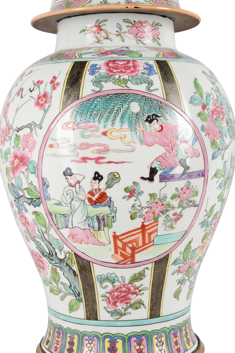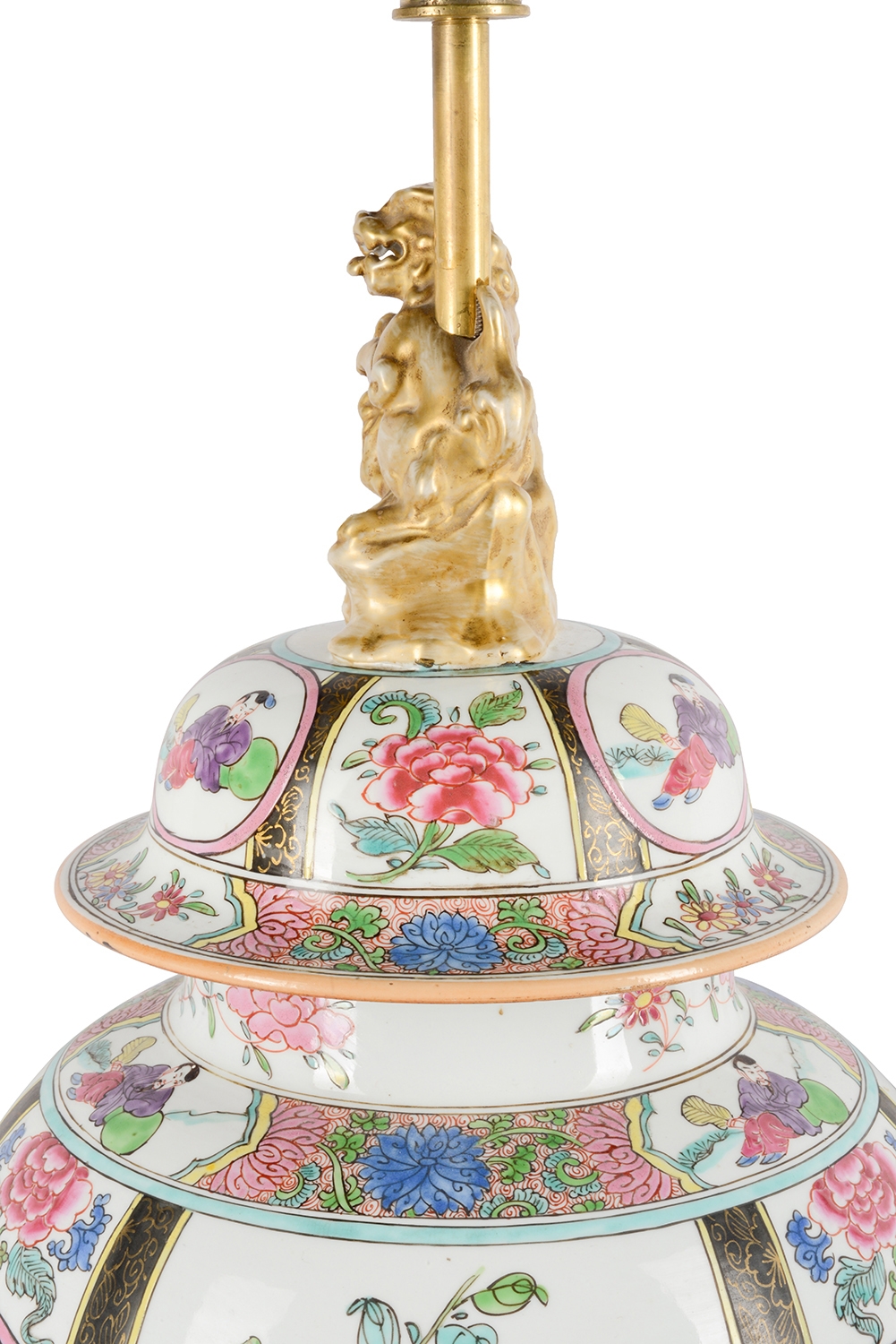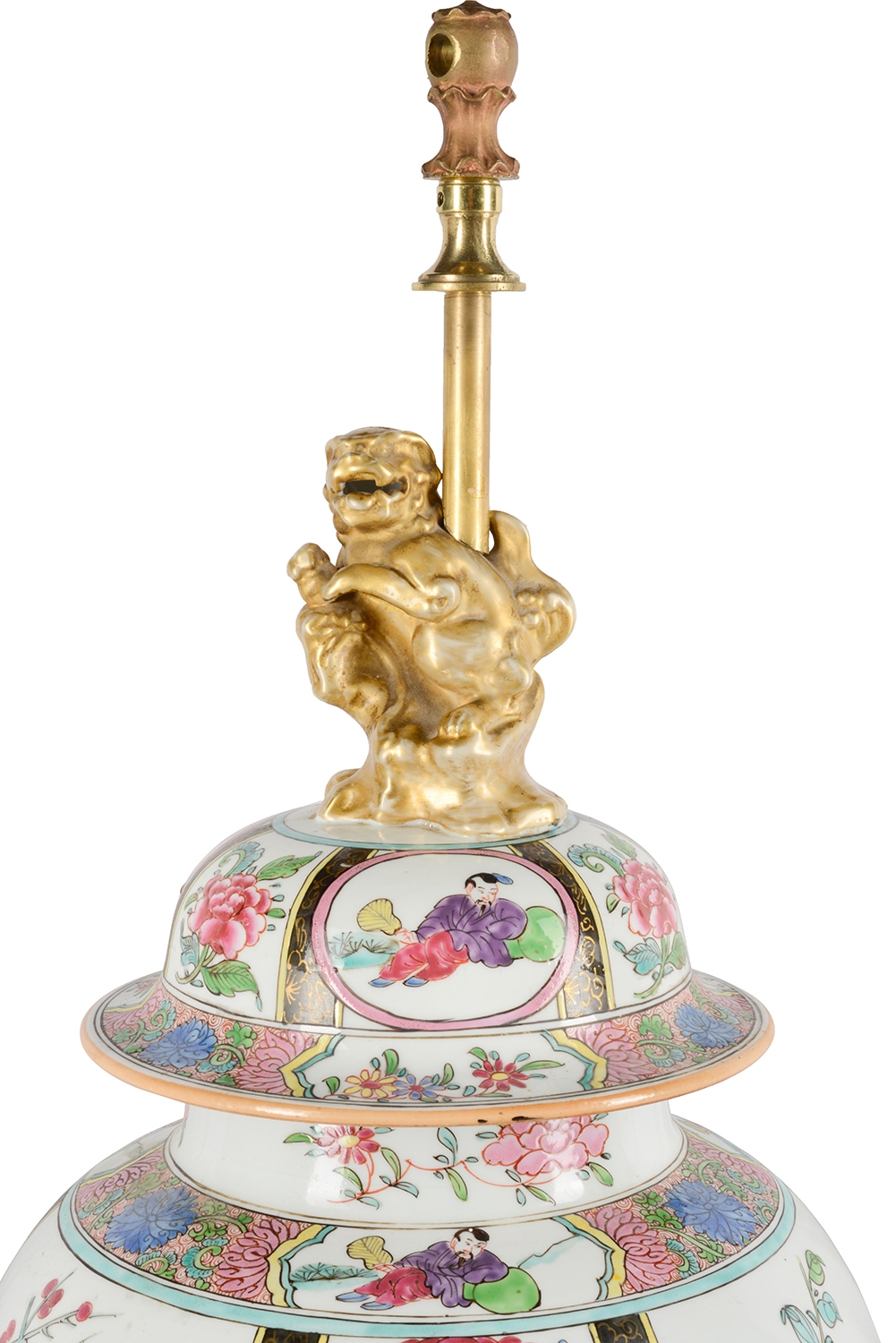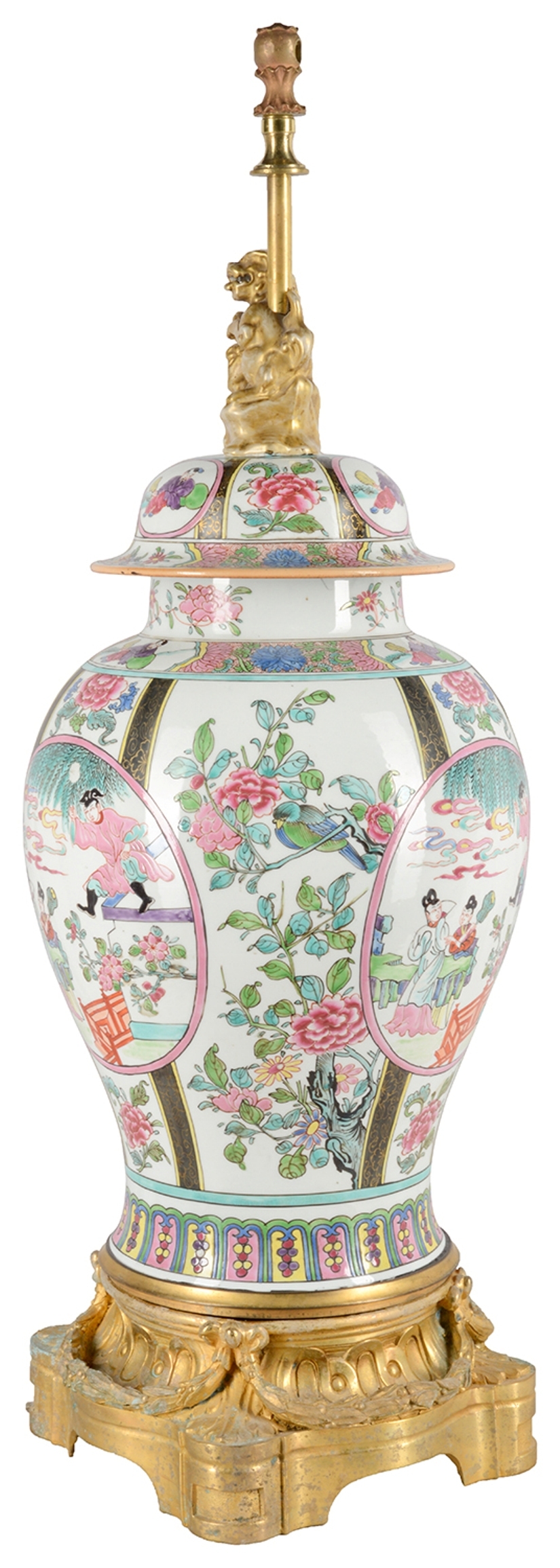 A very good quality late 19th Century Famille Rose style Samson porcelain lidded vase / lamp. Having classical oriental scenes with flowers, folate and motif decoration, inset painted panels of figures, gilded dog of faux finial, mounted on a wonderful gilded ormolu base with swag mounts. Similar to two other vases / lamps we have in stock.
