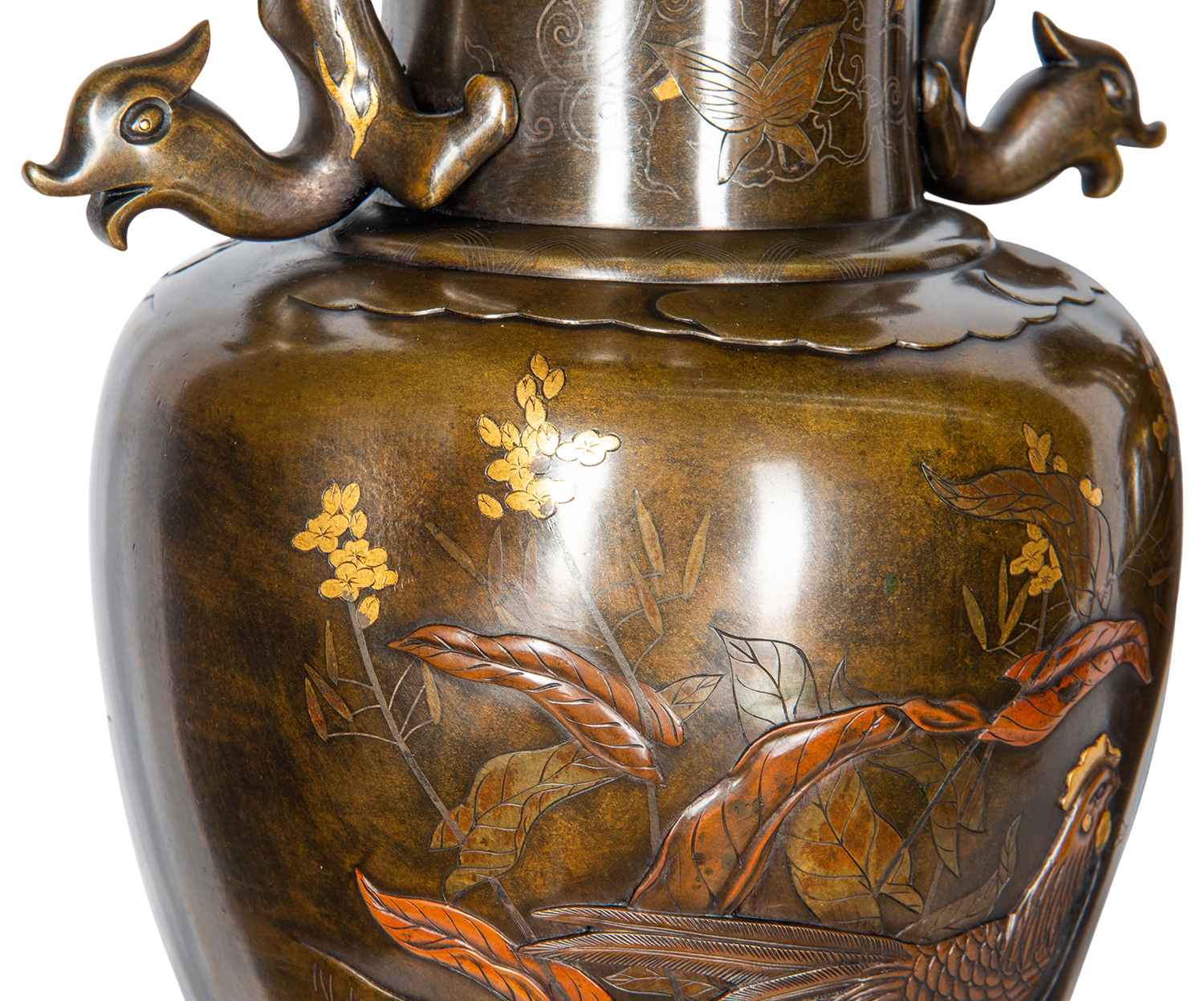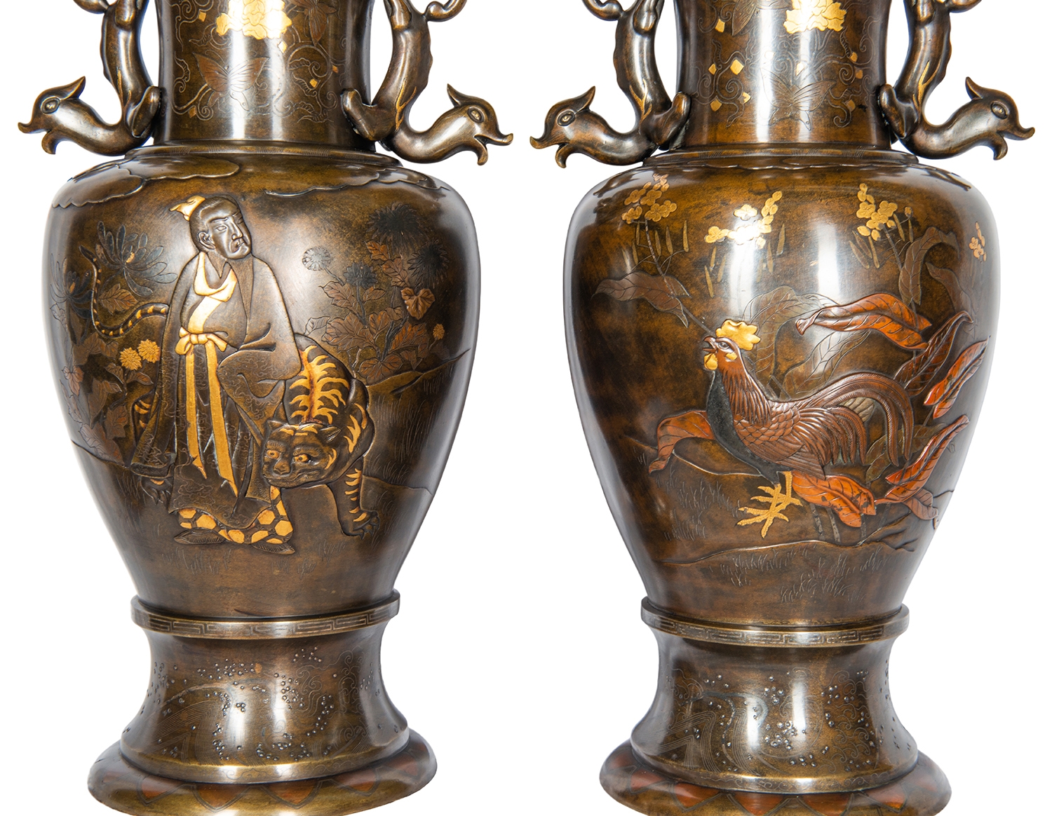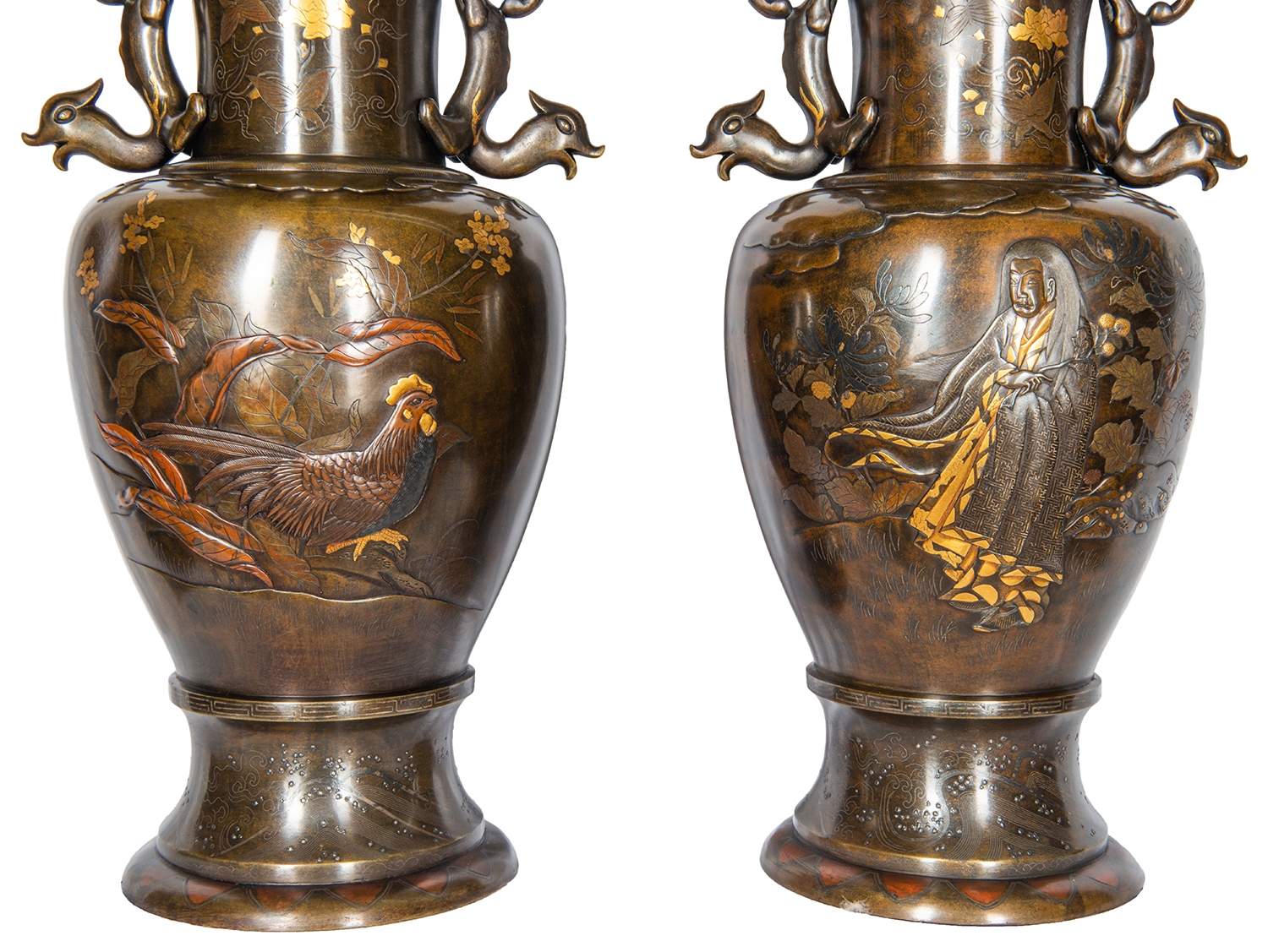 Pair Japanese Miyao style Bronze engraved vases, late C19th. 36cm(14") high