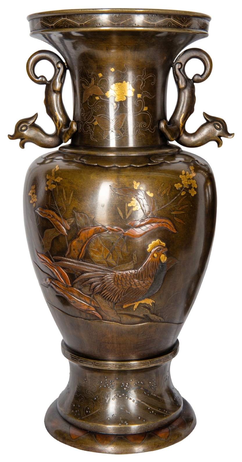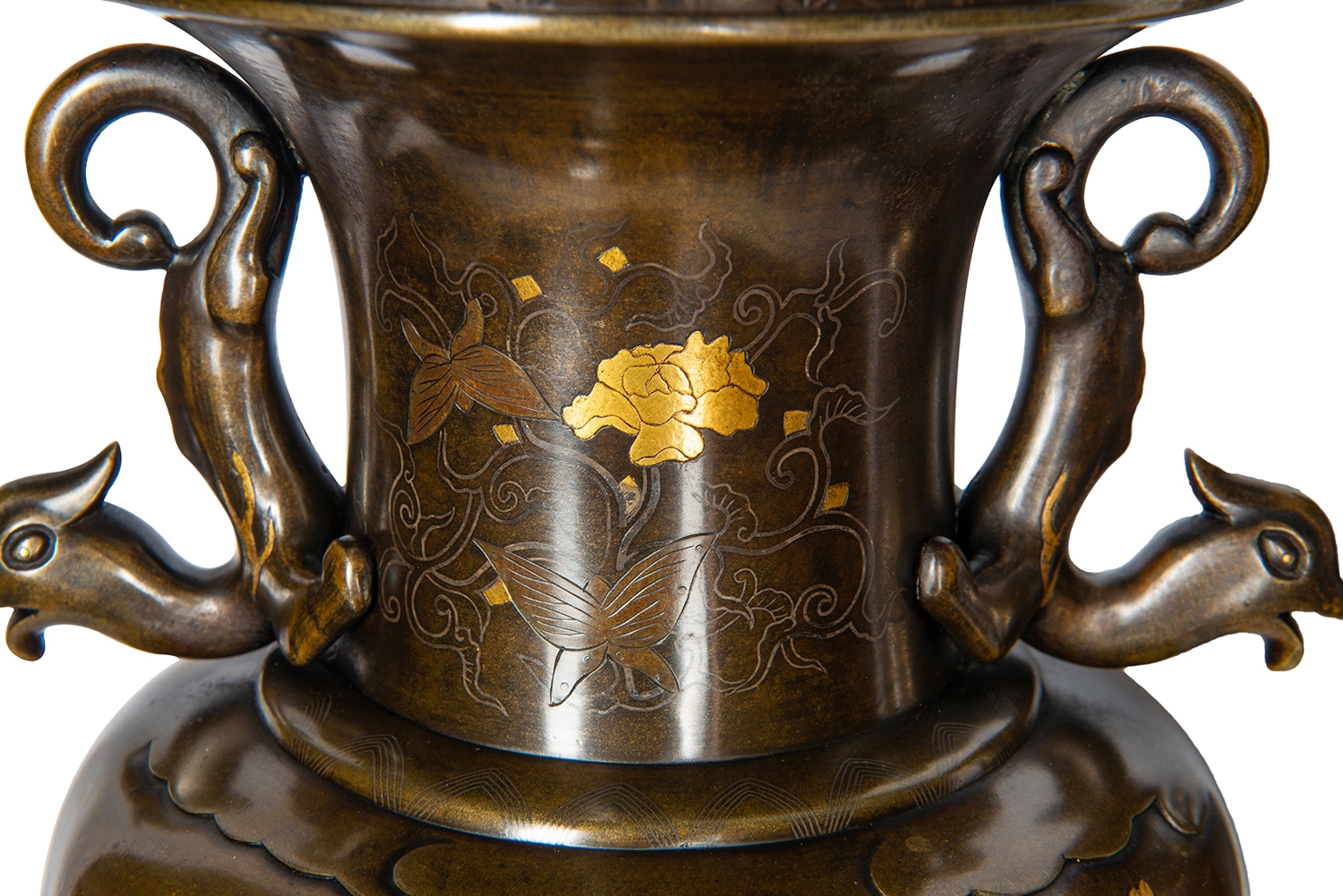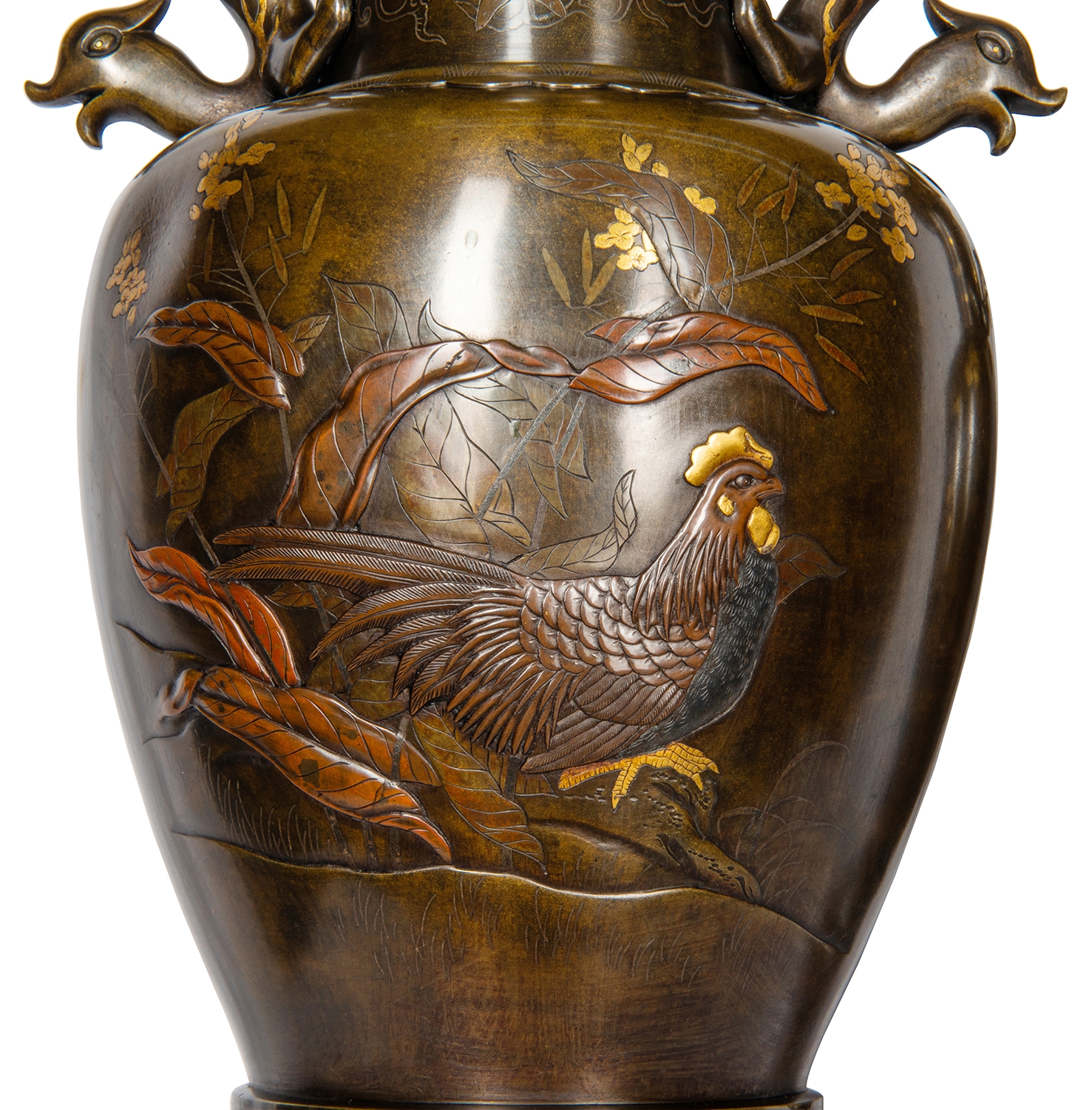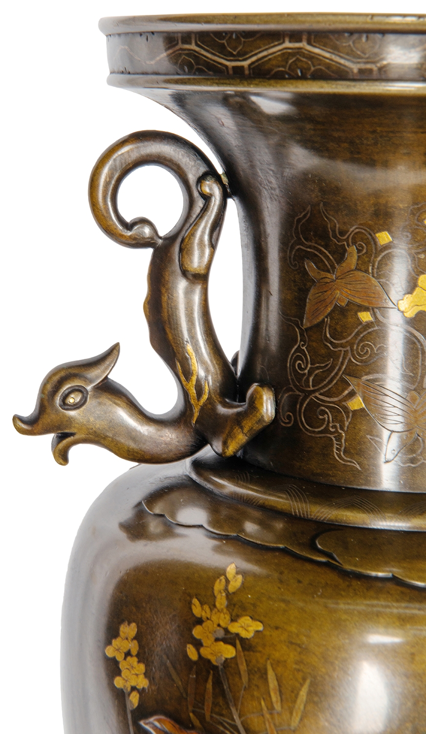 Pair Japanese Miyao style Bronze engraved vases, late C19th. 36cm(14") high