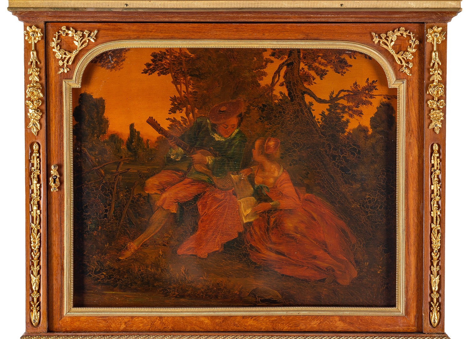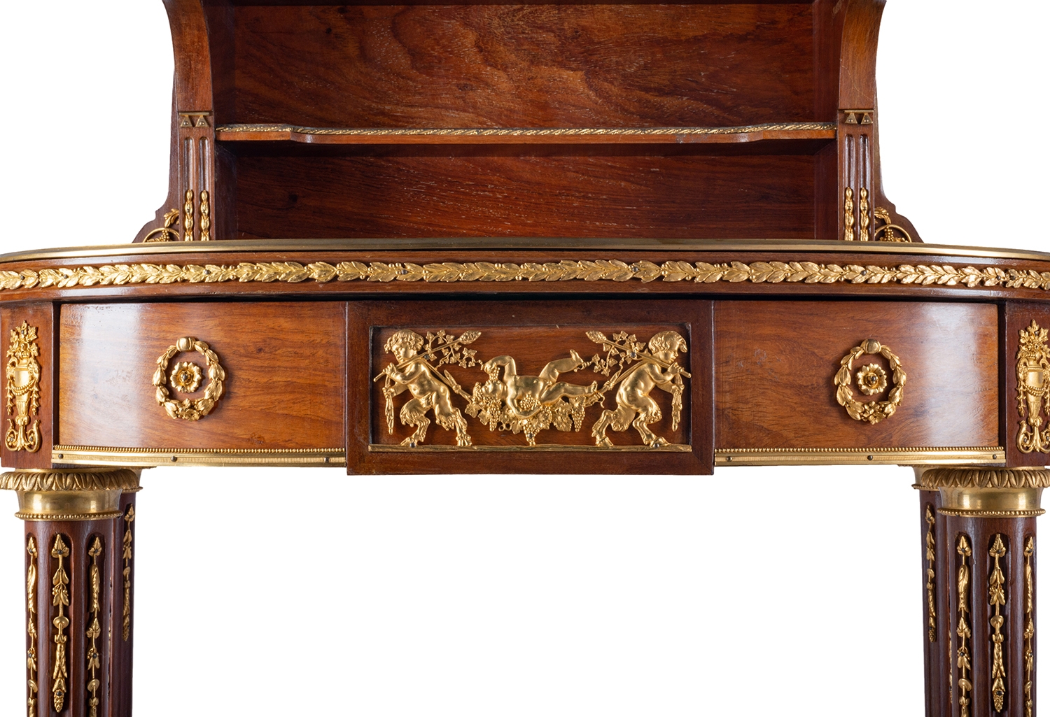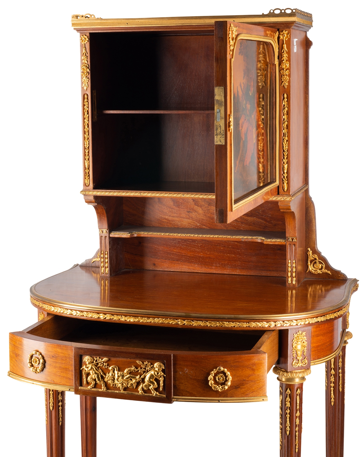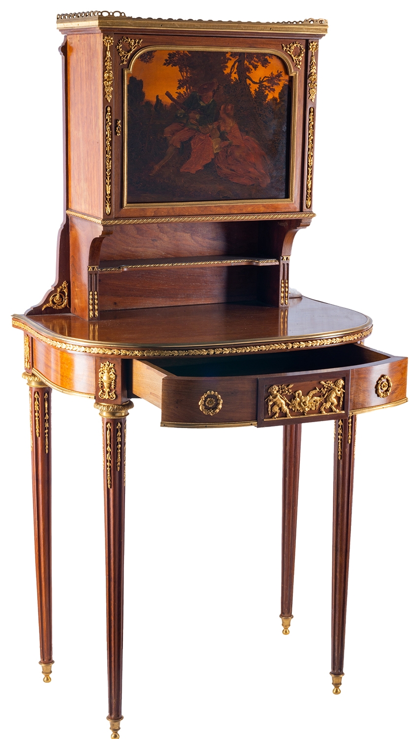 A very good quality late 19th Century French Louis XVI style Mahogany Bonheur du joer, having a wonderful quality Verni Matin hand painted panel of a romantic scene of seated lovers, above shelves, a single frieze drawer with fine quality gilded ormolu mounts, the central mount depicting amusing cloven hoofed putti carrying a third eating grapes. Raised on turned tapering fluted legs terminating on ormolu bucket feet. In the manner of Francoise Linke.