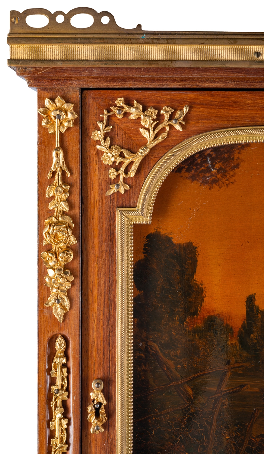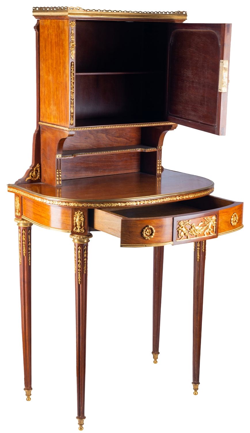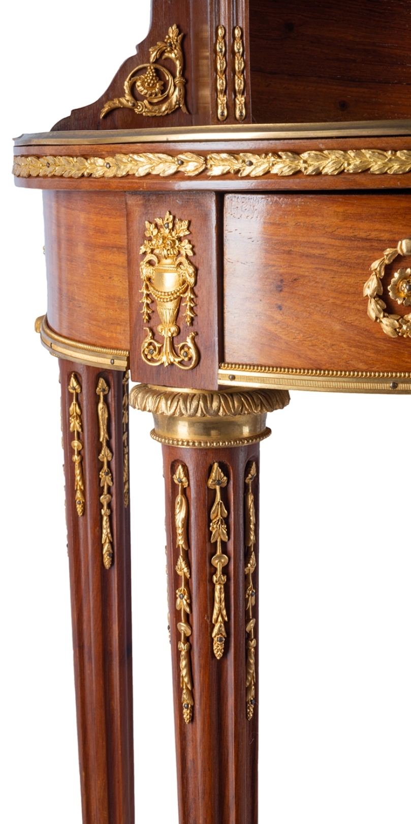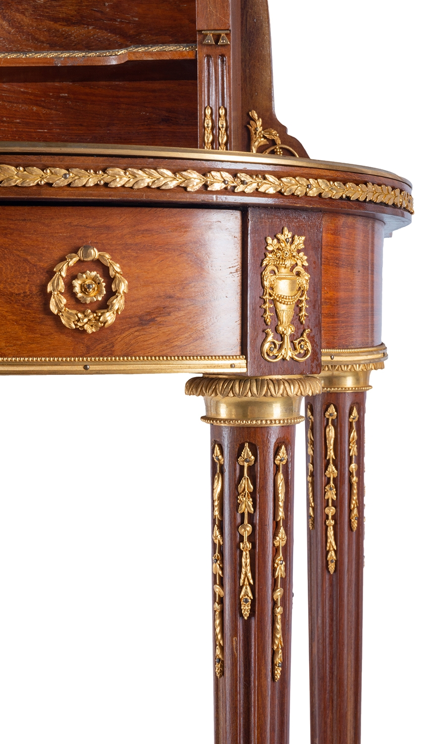 A very good quality late 19th Century French Louis XVI style Mahogany Bonheur du joer, having a wonderful quality Verni Matin hand painted panel of a romantic scene of seated lovers, above shelves, a single frieze drawer with fine quality gilded ormolu mounts, the central mount depicting amusing cloven hoofed putti carrying a third eating grapes. Raised on turned tapering fluted legs terminating on ormolu bucket feet. In the manner of Francoise Linke.