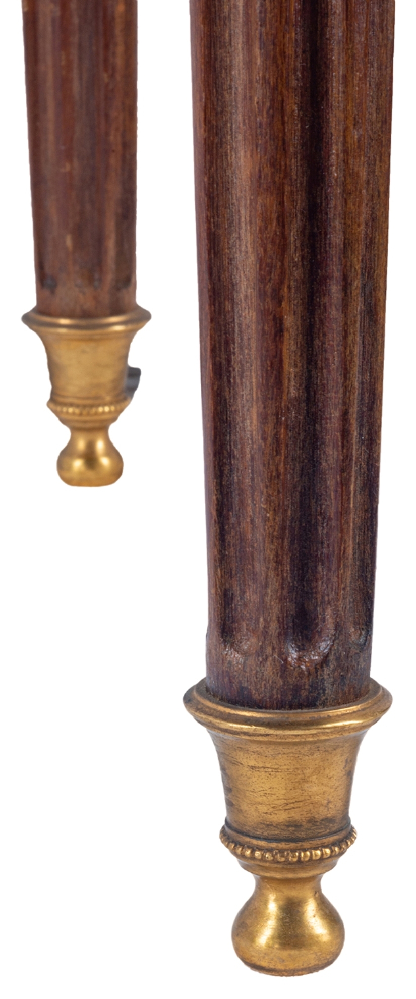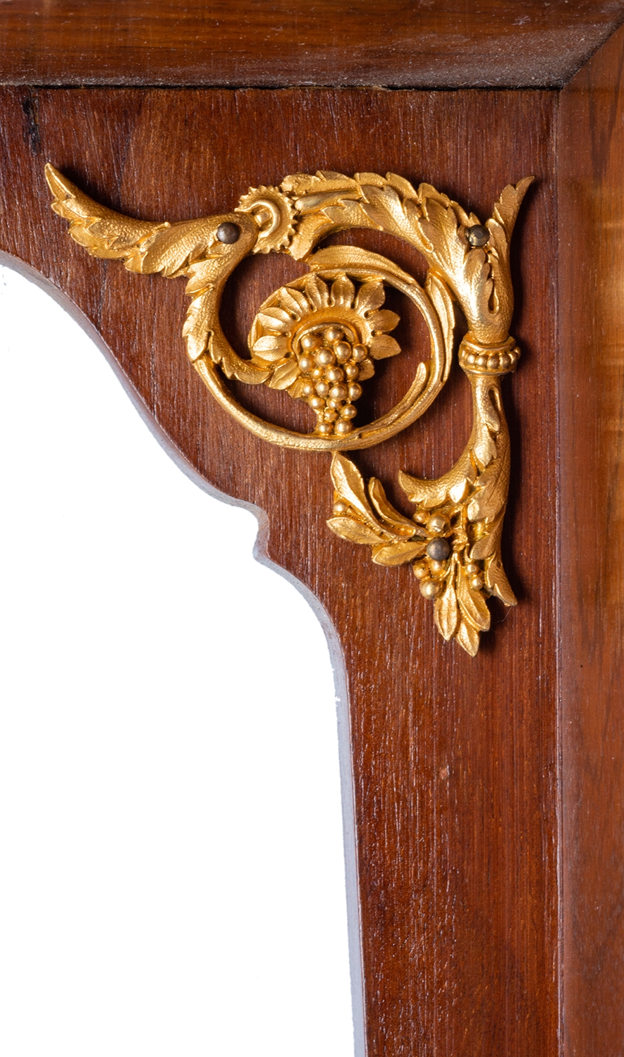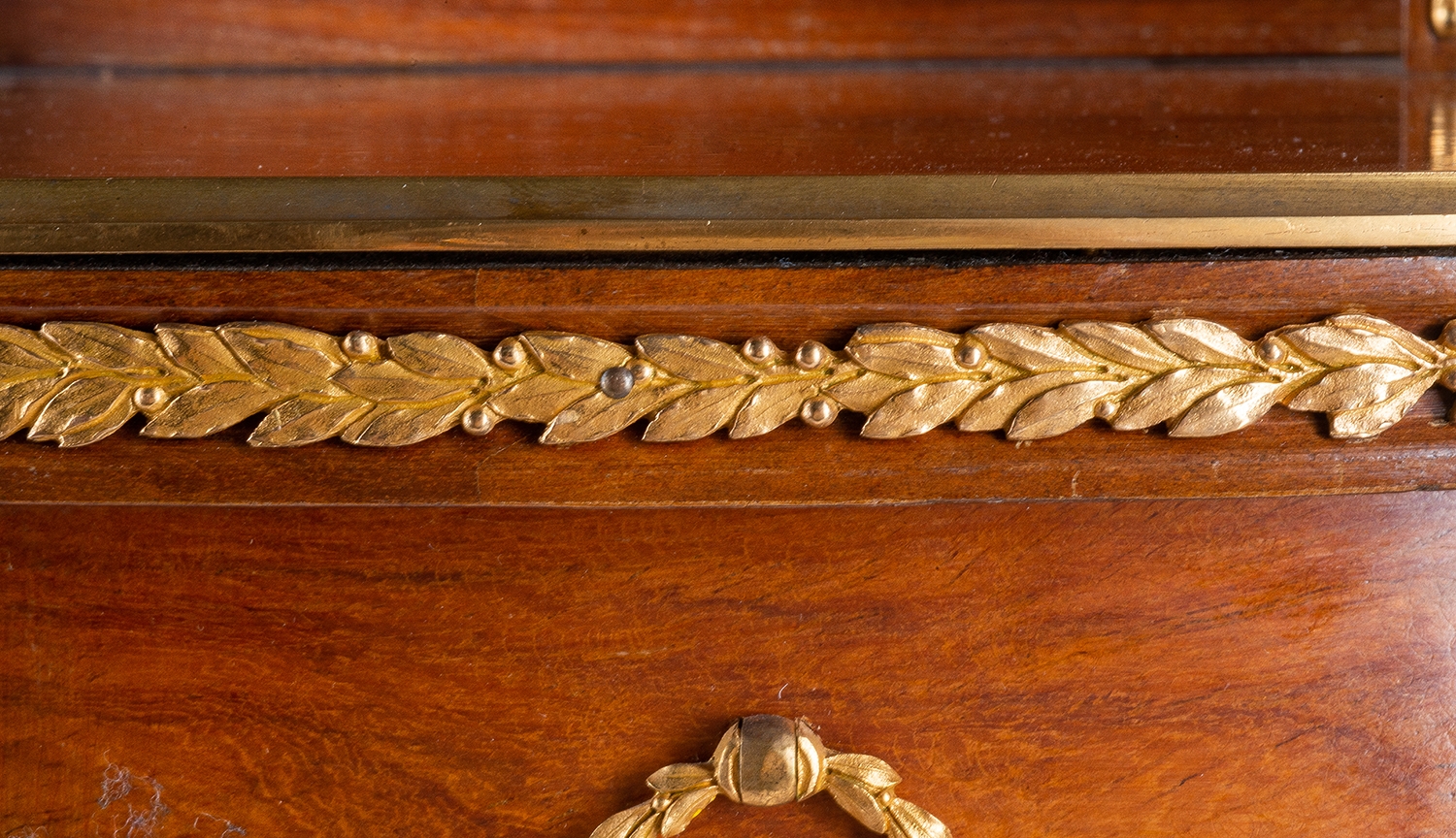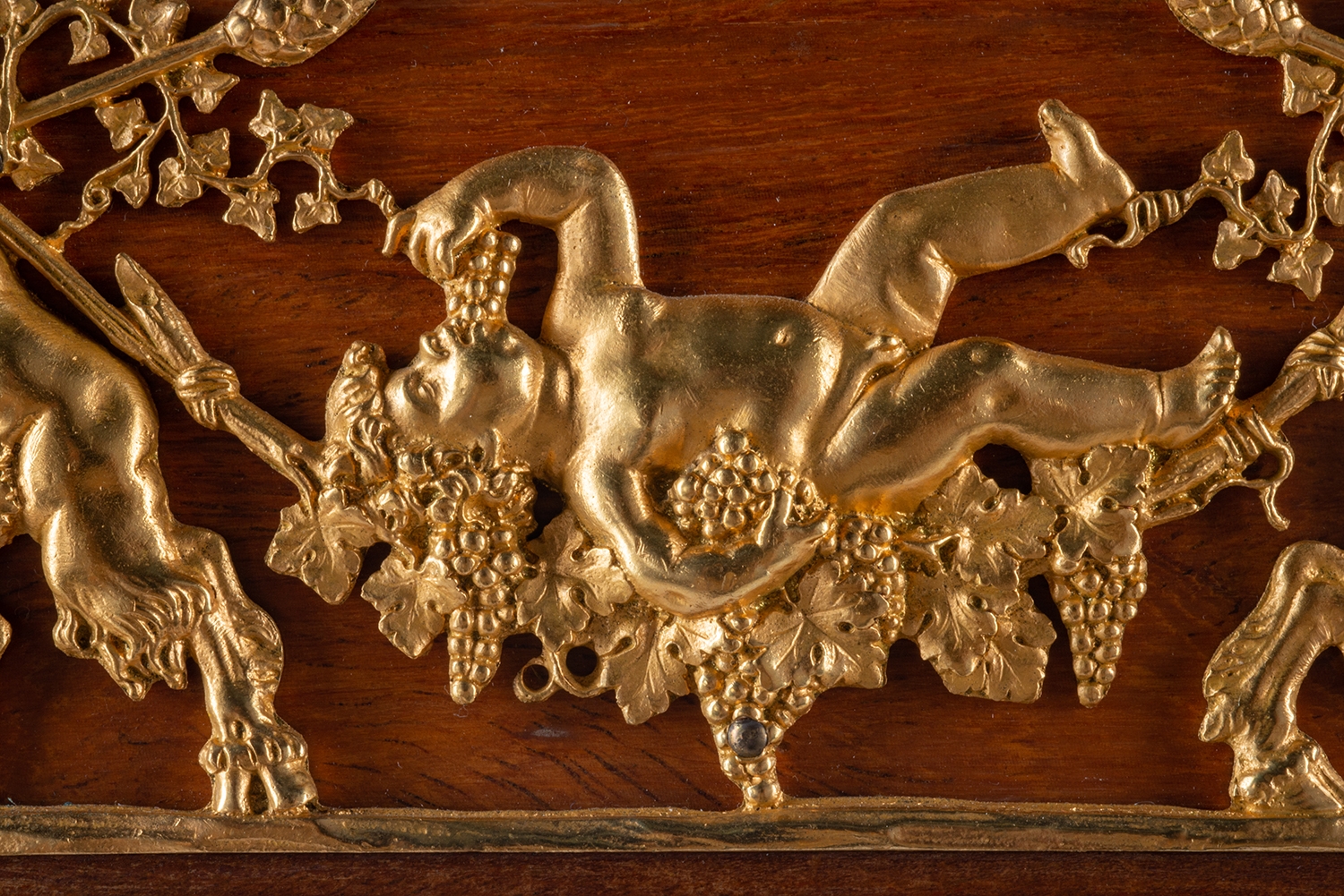 A very good quality late 19th Century French Louis XVI style Mahogany Bonheur du joer, having a wonderful quality Verni Matin hand painted panel of a romantic scene of seated lovers, above shelves, a single frieze drawer with fine quality gilded ormolu mounts, the central mount depicting amusing cloven hoofed putti carrying a third eating grapes. Raised on turned tapering fluted legs terminating on ormolu bucket feet. In the manner of Francoise Linke.