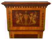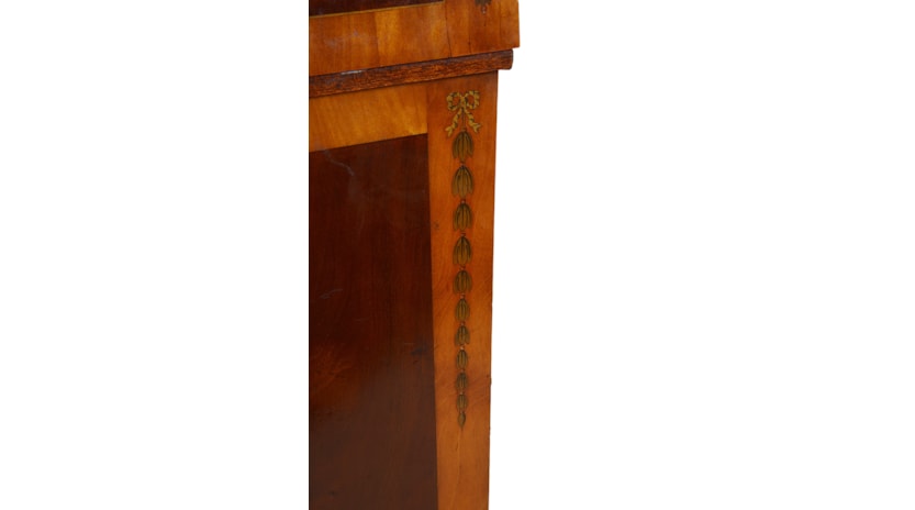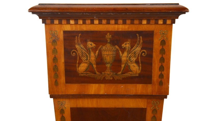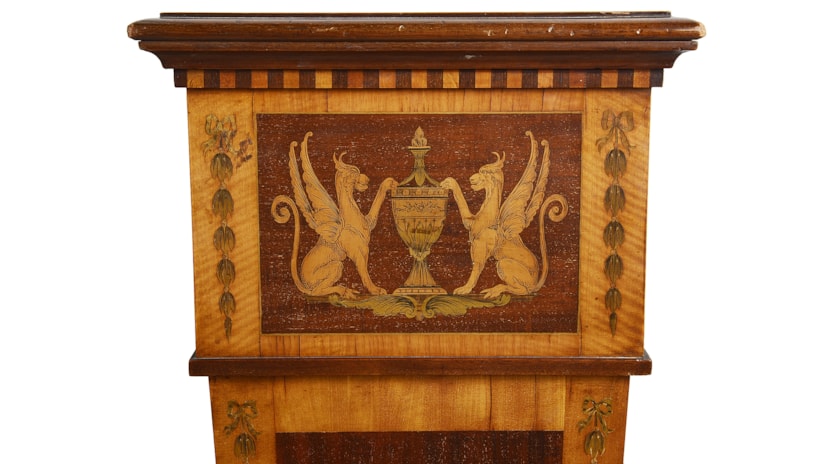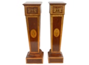 A good quality pair of late 19th Century Sheraton revival classical Mahogany pedestals, each having Satinwood inlay and crossbanding. Panels with Winged griffens, urns and foliage.