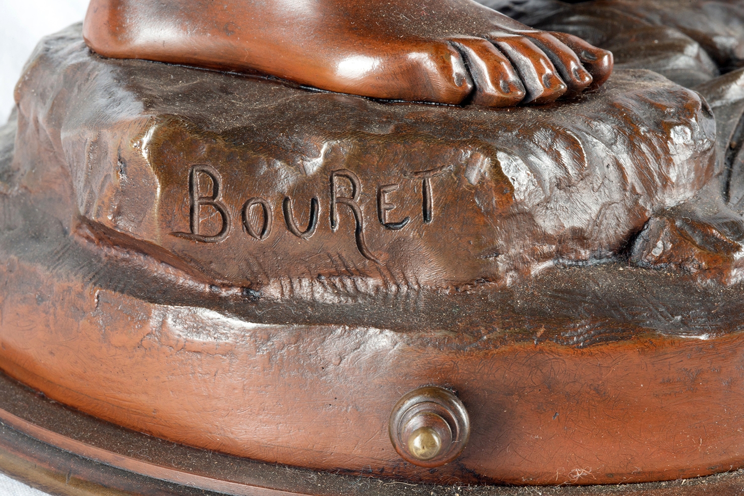 A very good quality 19th Century Patinated bronze statue of a Gypsy girl 'Tuning the Mandolin' Signed; Bouret. Eutrope Bouret (16 April 1833 in Paris – 1906) was a 19th-century French sculptor. Eutrope Bouret was a student of Louis Buhot. He exhibited at the Salon from 1875 to 1903. He worked in conventional materials: marble, plaster, terracotta and bronze.