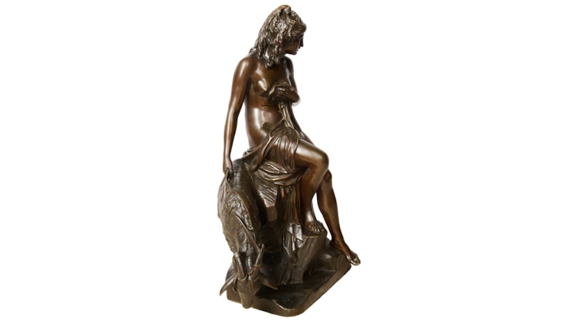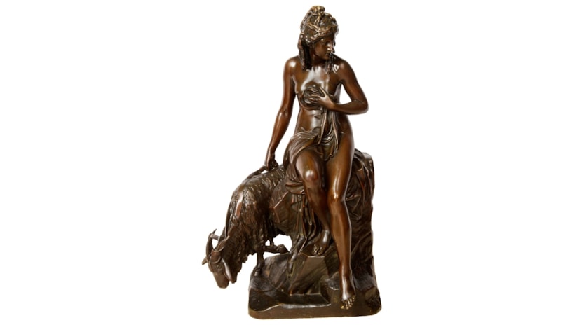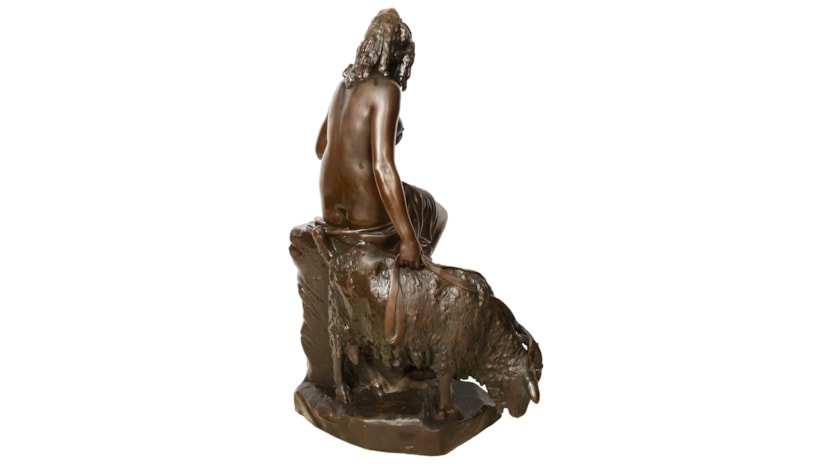 There were different traditions regarding Amaltheia.[3] Amaltheia is sometimes represented as the goat who nurtured the infant-god in a cave in Cretan Mount Aigaion ("Goat Mountain"),[4] sometimes as a goat-tending nymph[5] of uncertain parentage (the daughter of Oceanus,[6] Helios,[7] Haemonius,[8] or—according to Lactantius—Melisseus[9]).[10] The possession of multiple and uncertain mythological parents indicates wide worship of a deity in many cultures having varying local traditions. Other names, like Adrasteia, Ide, the nymph of Mount Ida, or Adamanthea, which appear in mythology handbooks,[11] are simply duplicates of Amaltheia.
