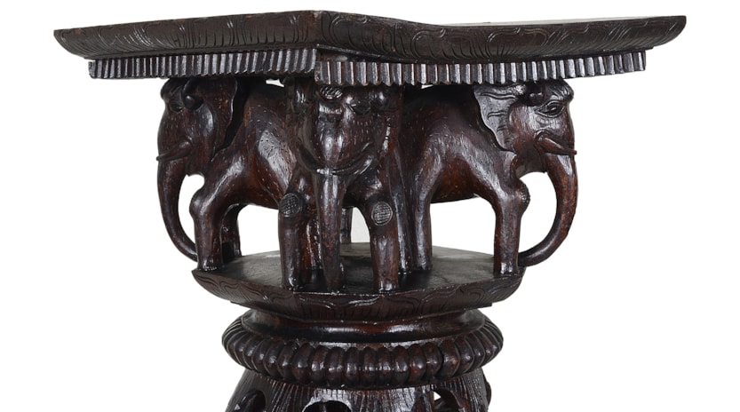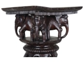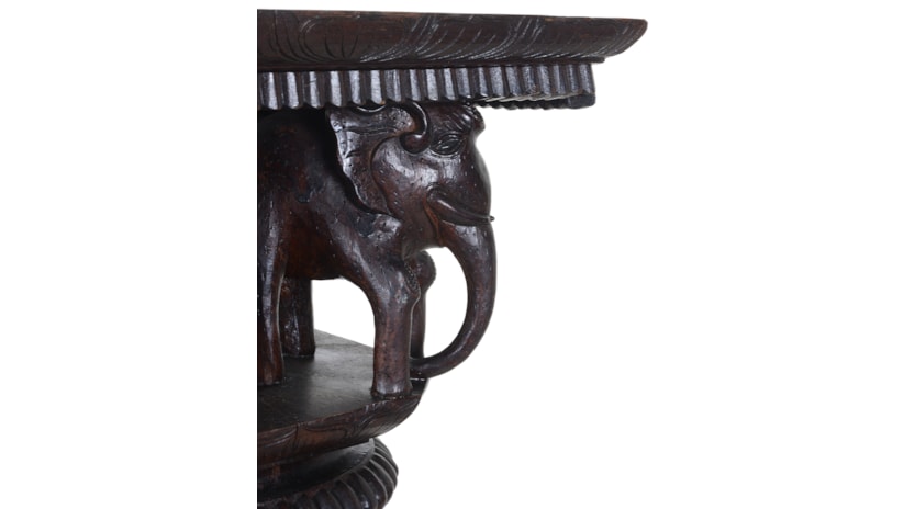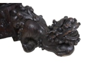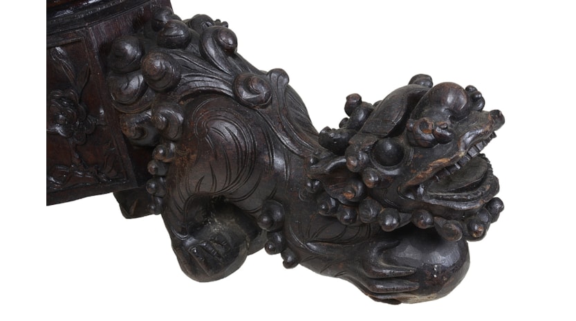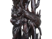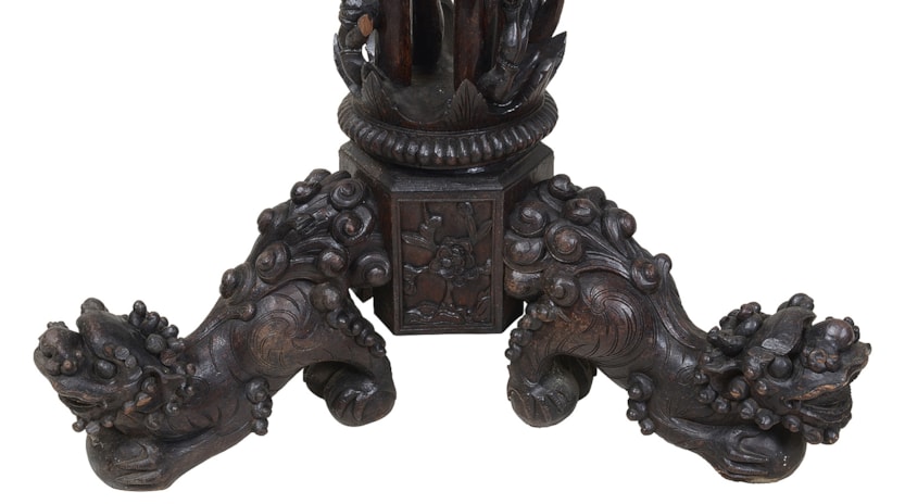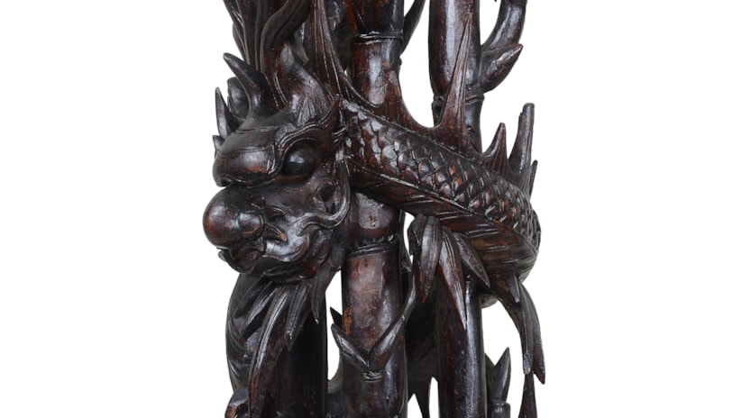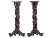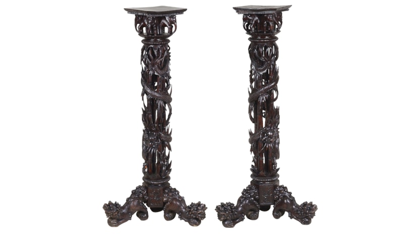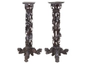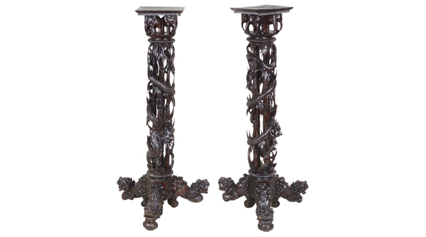 A pair of 19th century Chinese carved torchas, each with elephants, serpent like dragons around bamboo and raised on mythical dogs of faux.