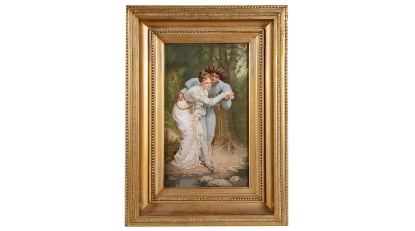 A very good quality 19th century KPM porcelain plaque depicting lovers crossing a river. Mounted in a gilded gesso picture frame.
