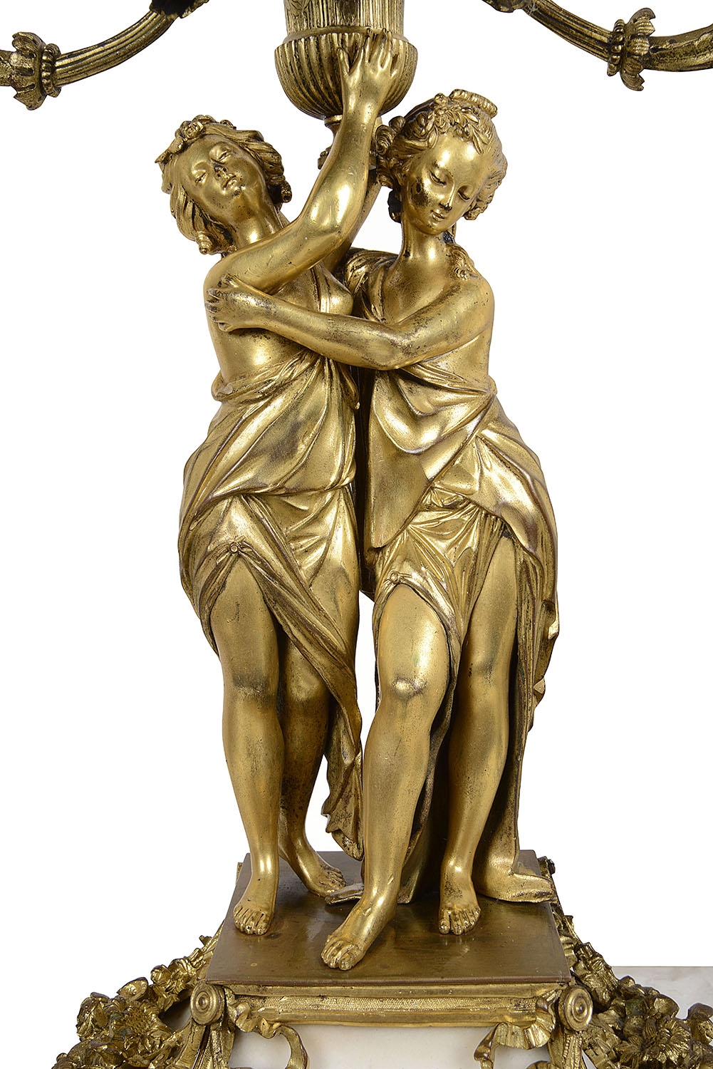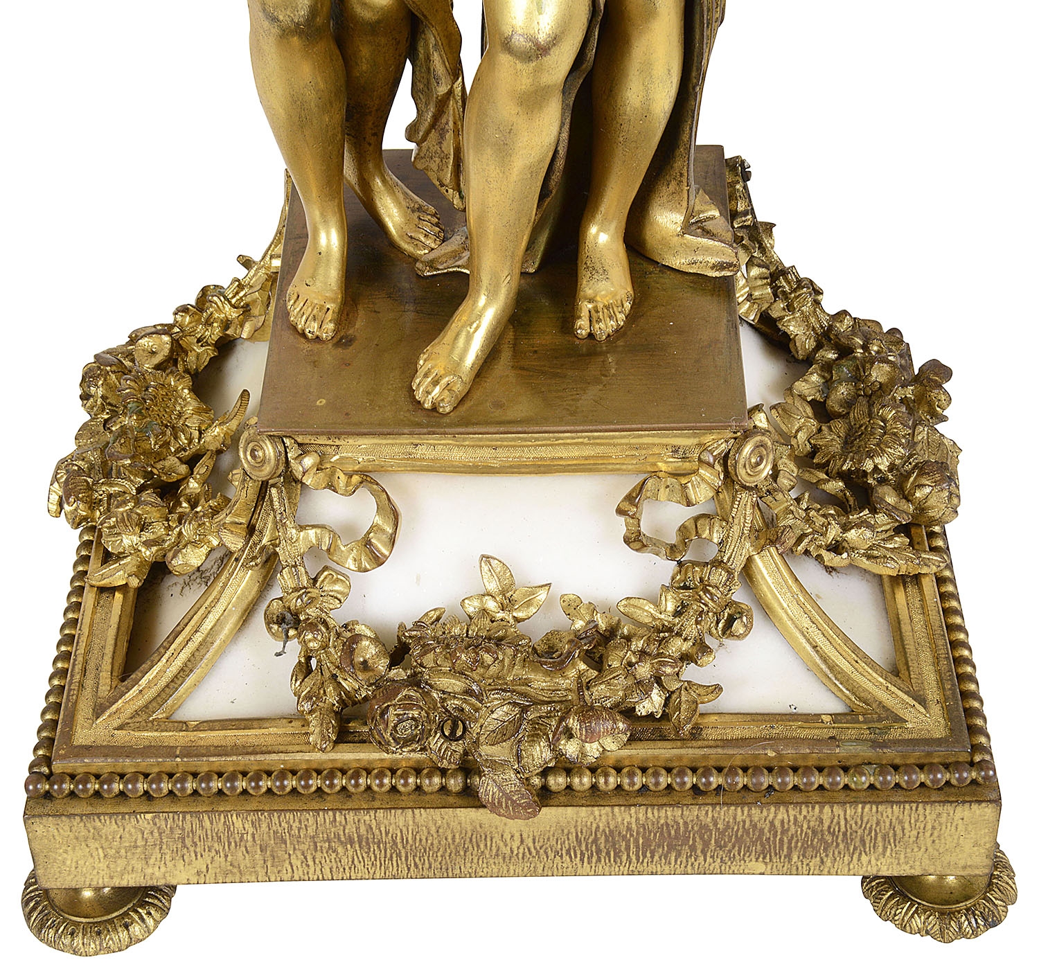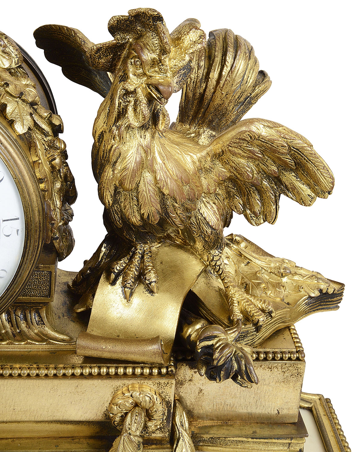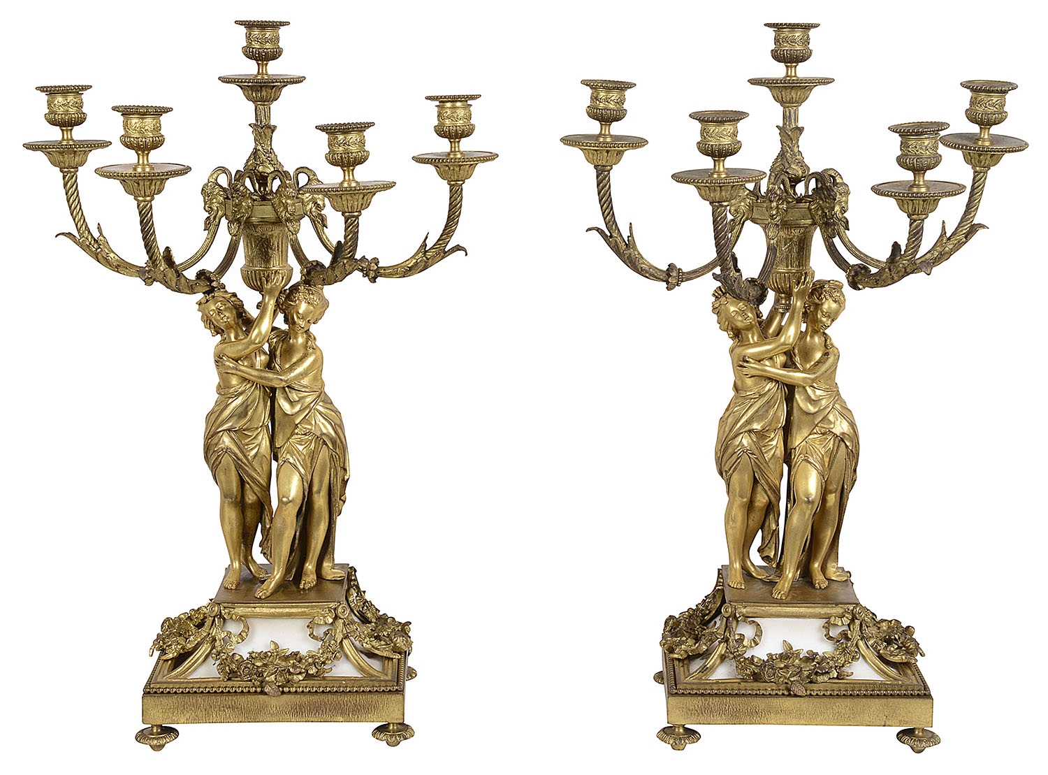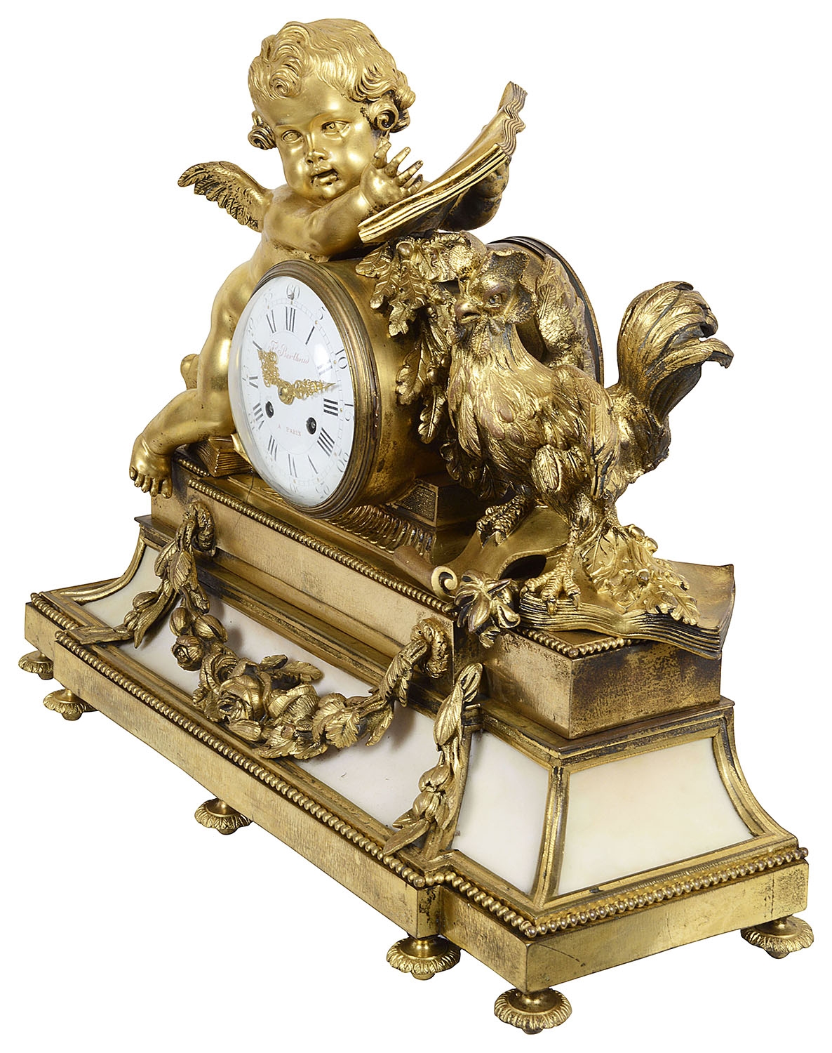 A very impressive and good quality 19th Century Gilded ormolu Louis XVI style clock garniture. The pair of five branch candelabra supported by a pair of classical semi clad females , raised on white marble bases with garlands of flowers. The clock having a cherub reading a book, the clock with an enamel face, Roman numerals, an eight day duration clock that strikes on the hour and half hour. A Cockerel to the right with further books, raised above a white marble base with ormolu floral drapes, raised on turned gilded feet.
