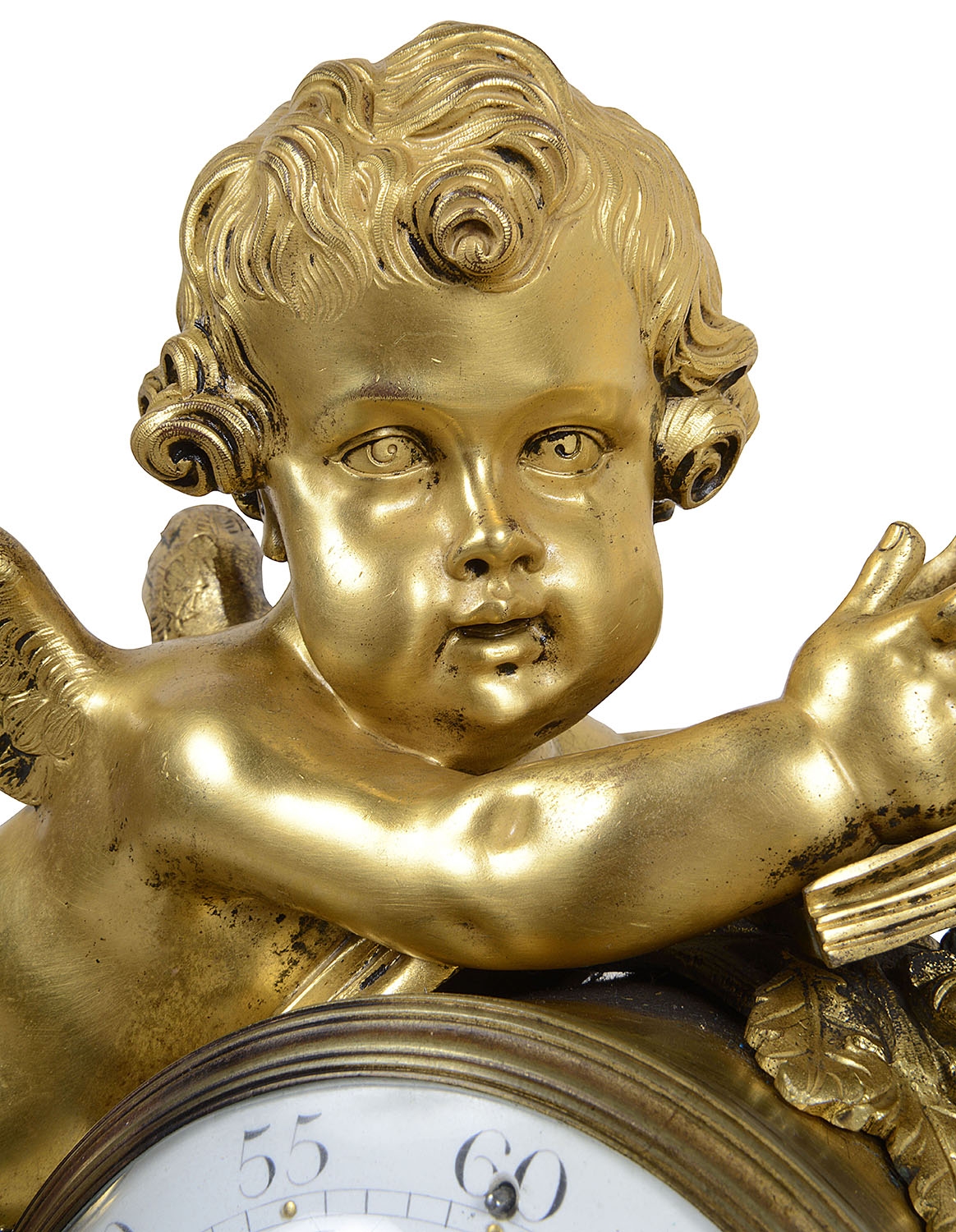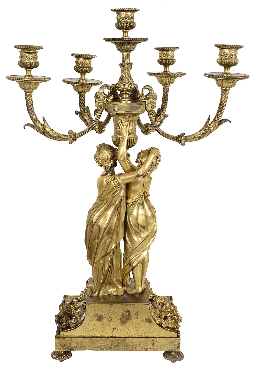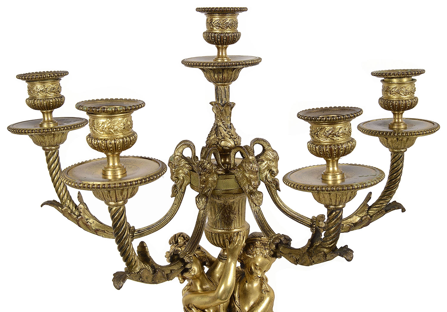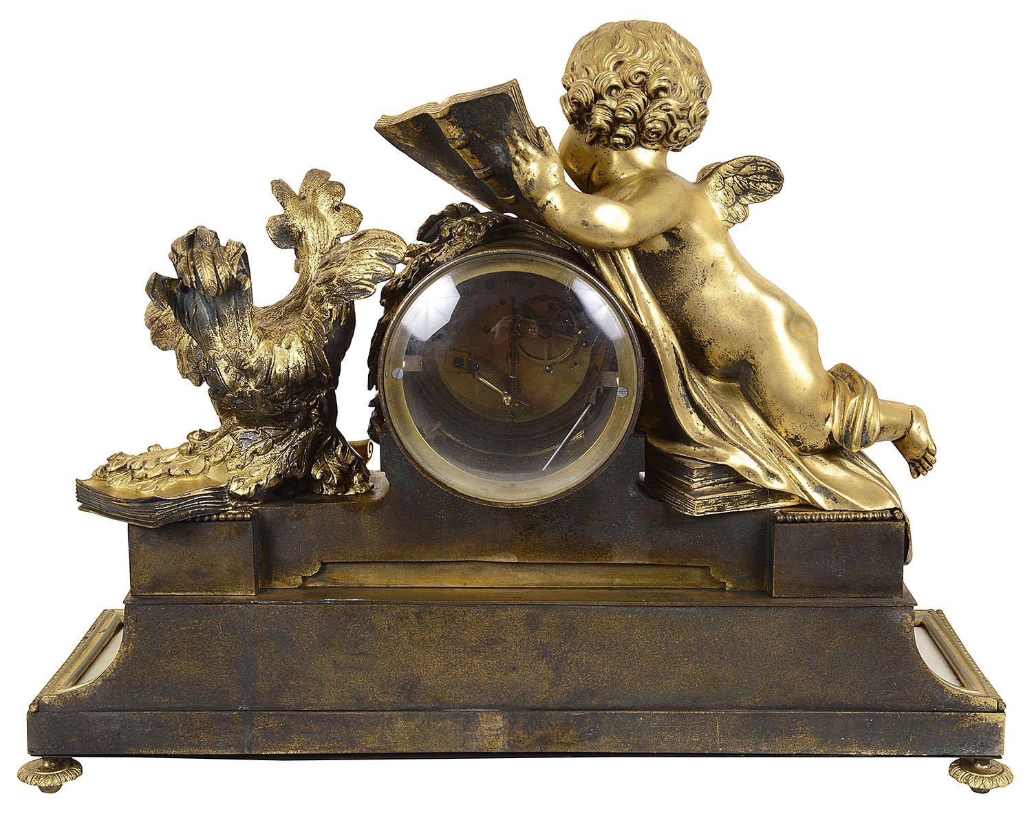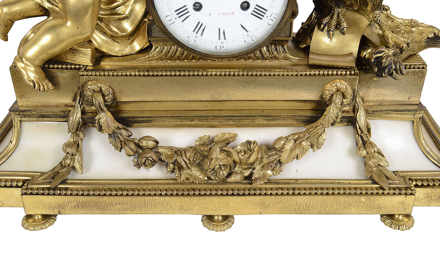 A very impressive and good quality 19th Century Gilded ormolu Louis XVI style clock garniture. The pair of five branch candelabra supported by a pair of classical semi clad females , raised on white marble bases with garlands of flowers. The clock having a cherub reading a book, the clock with an enamel face, Roman numerals, an eight day duration clock that strikes on the hour and half hour. A Cockerel to the right with further books, raised above a white marble base with ormolu floral drapes, raised on turned gilded feet.