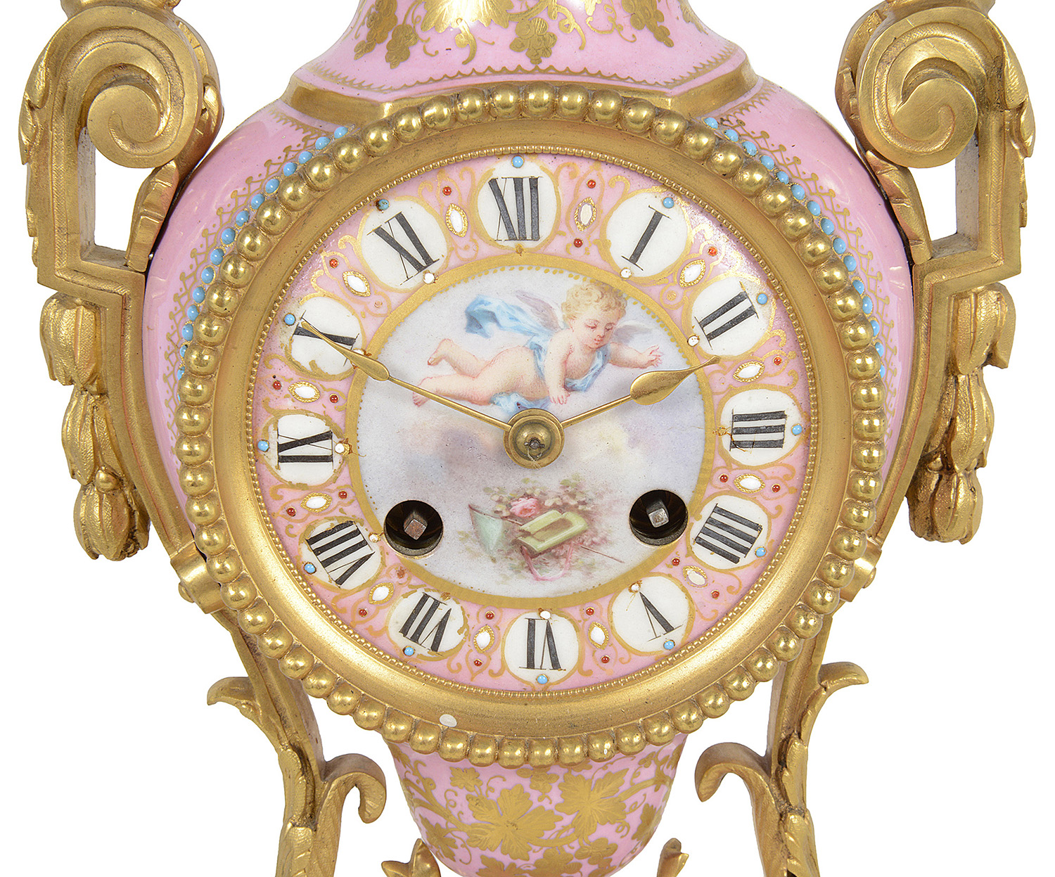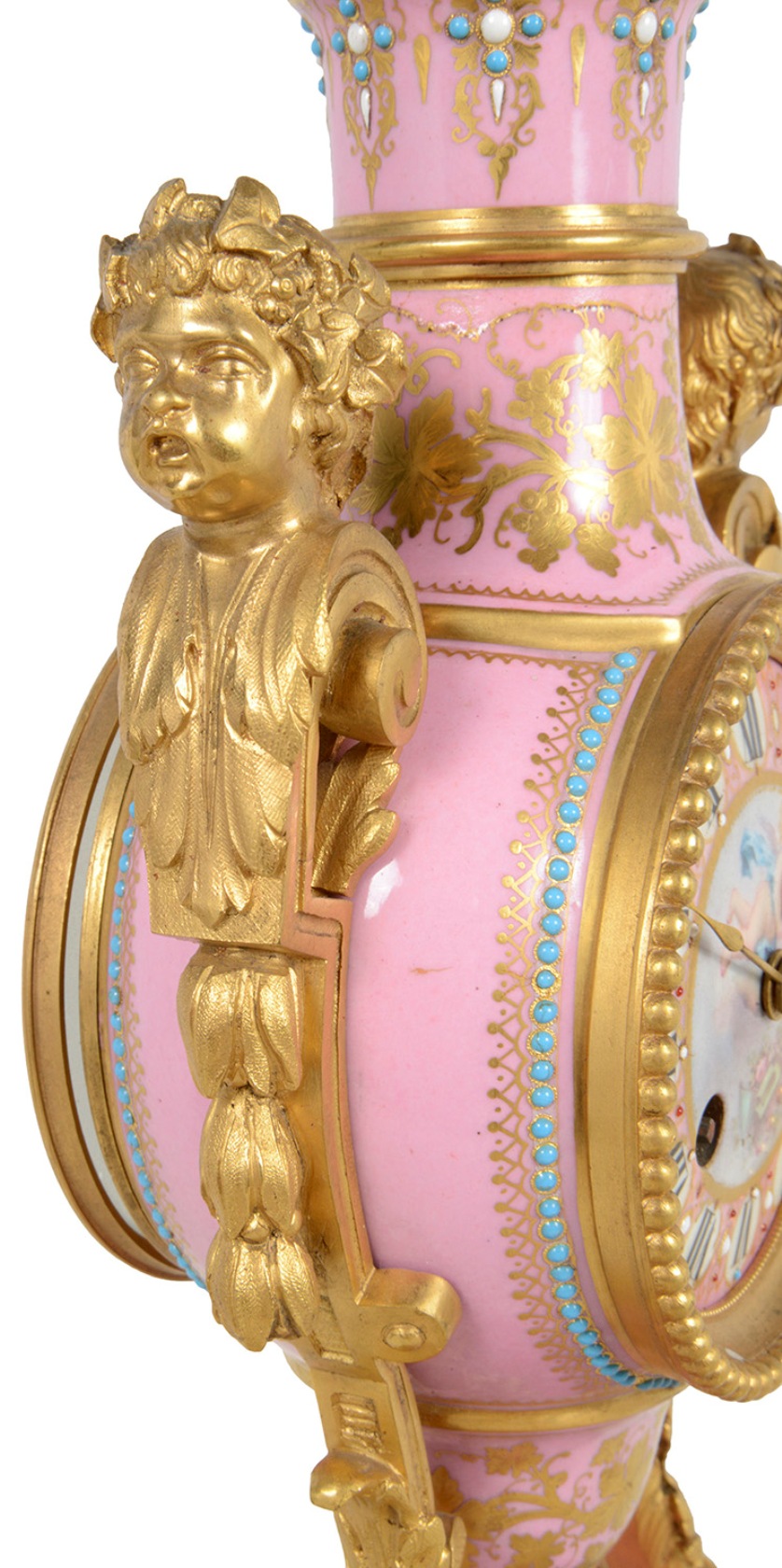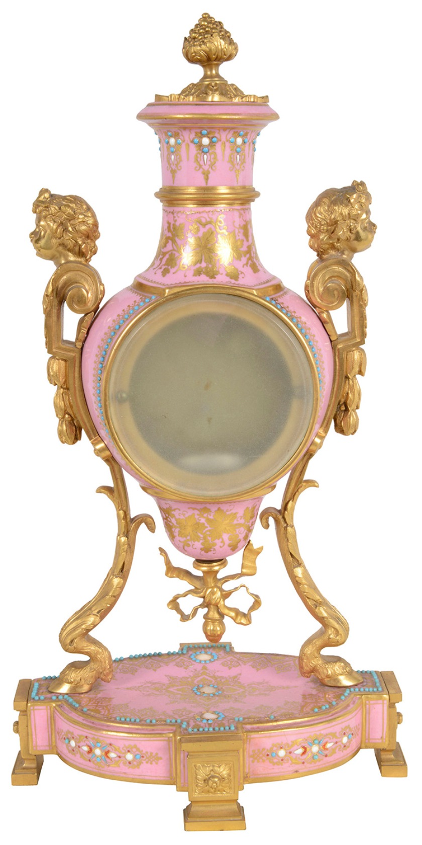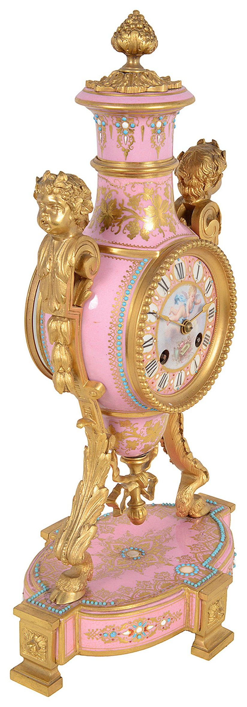 A very good quality French 19th Century Louis XVI style gilded ormolu and 'Severs' style pink porcelain mantel clock. In the form of a vase with an inset clock face, an eight day duration, striking on the hour and half hour. Gilded ormolu children's bust mounts to either side, classical ribbon and hoof feet supports and raised on a porcelain plinth base and ormolu feet.