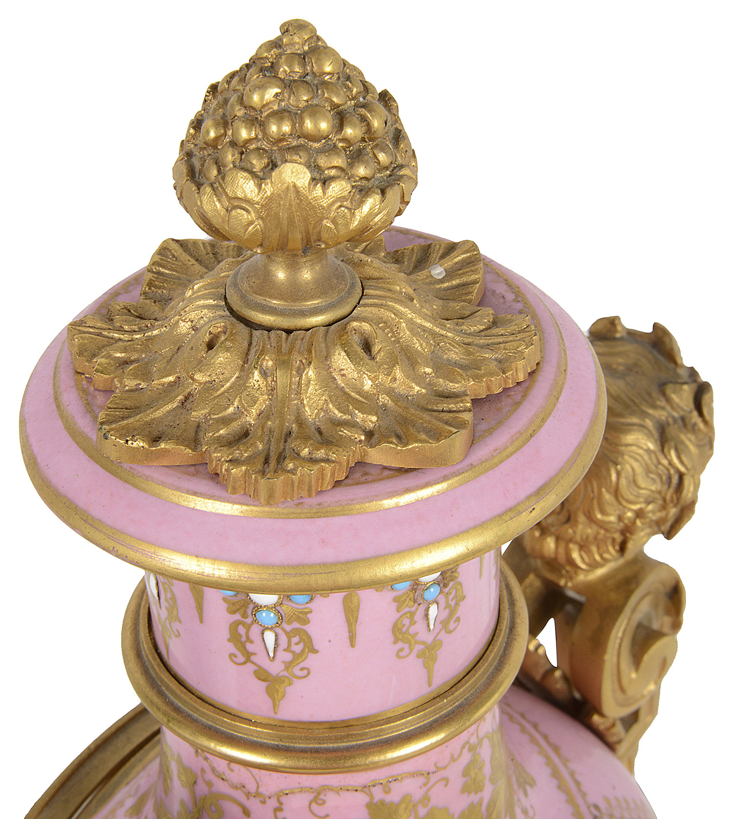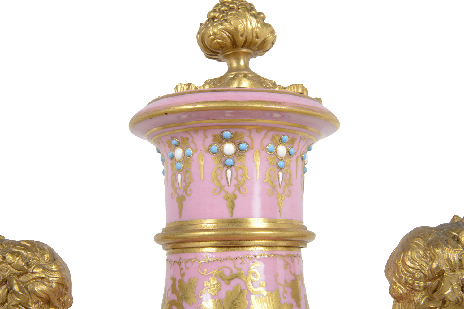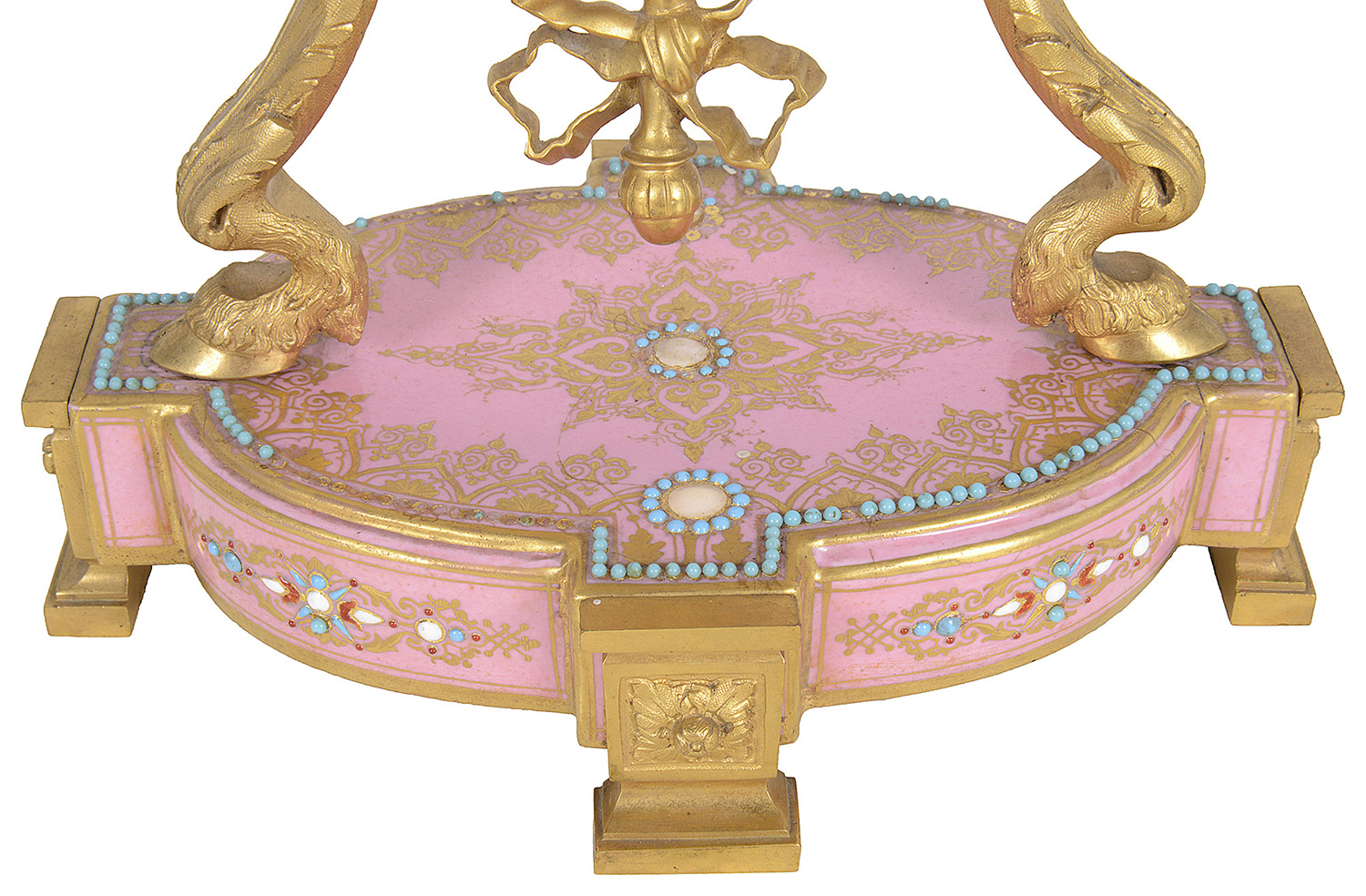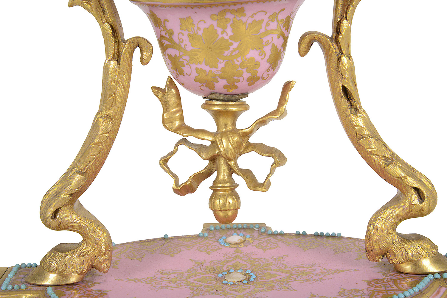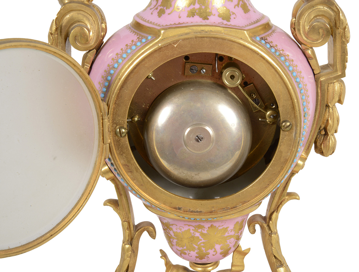 A very good quality French 19th Century Louis XVI style gilded ormolu and 'Severs' style pink porcelain mantel clock. In the form of a vase with an inset clock face, an eight day duration, striking on the hour and half hour. Gilded ormolu children's bust mounts to either side, classical ribbon and hoof feet supports and raised on a porcelain plinth base and ormolu feet.
