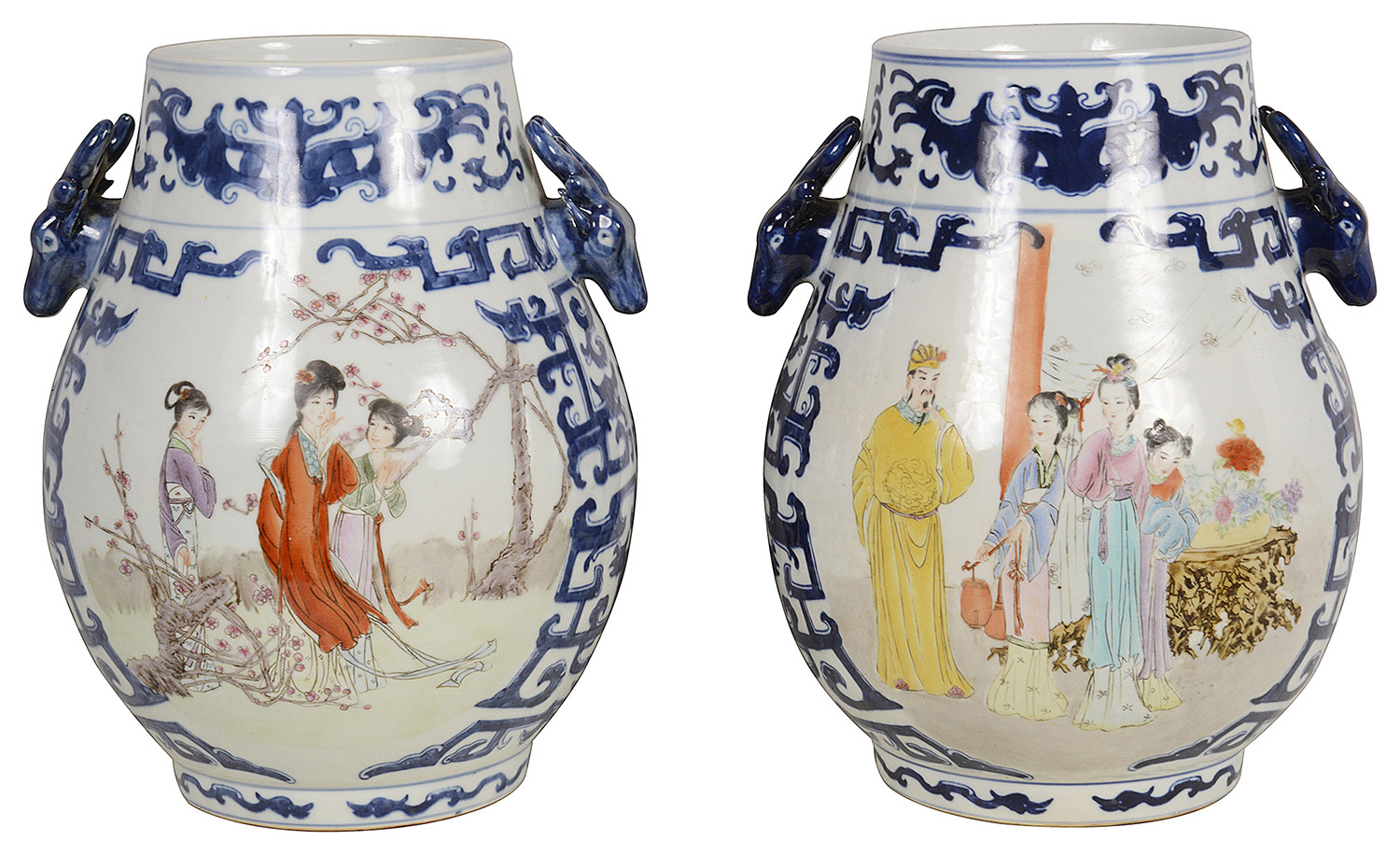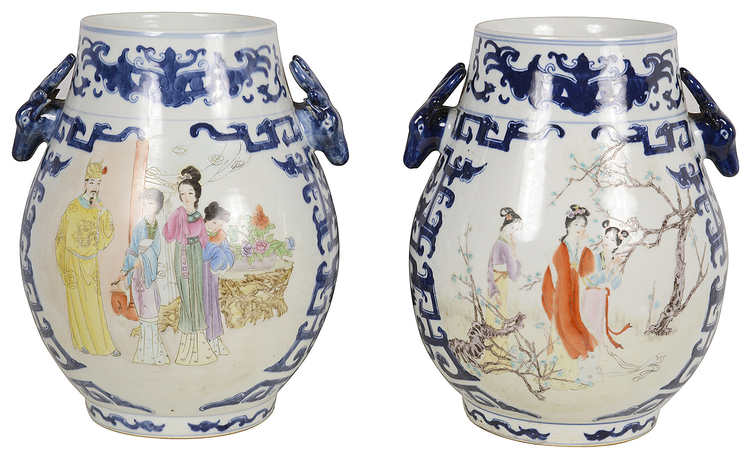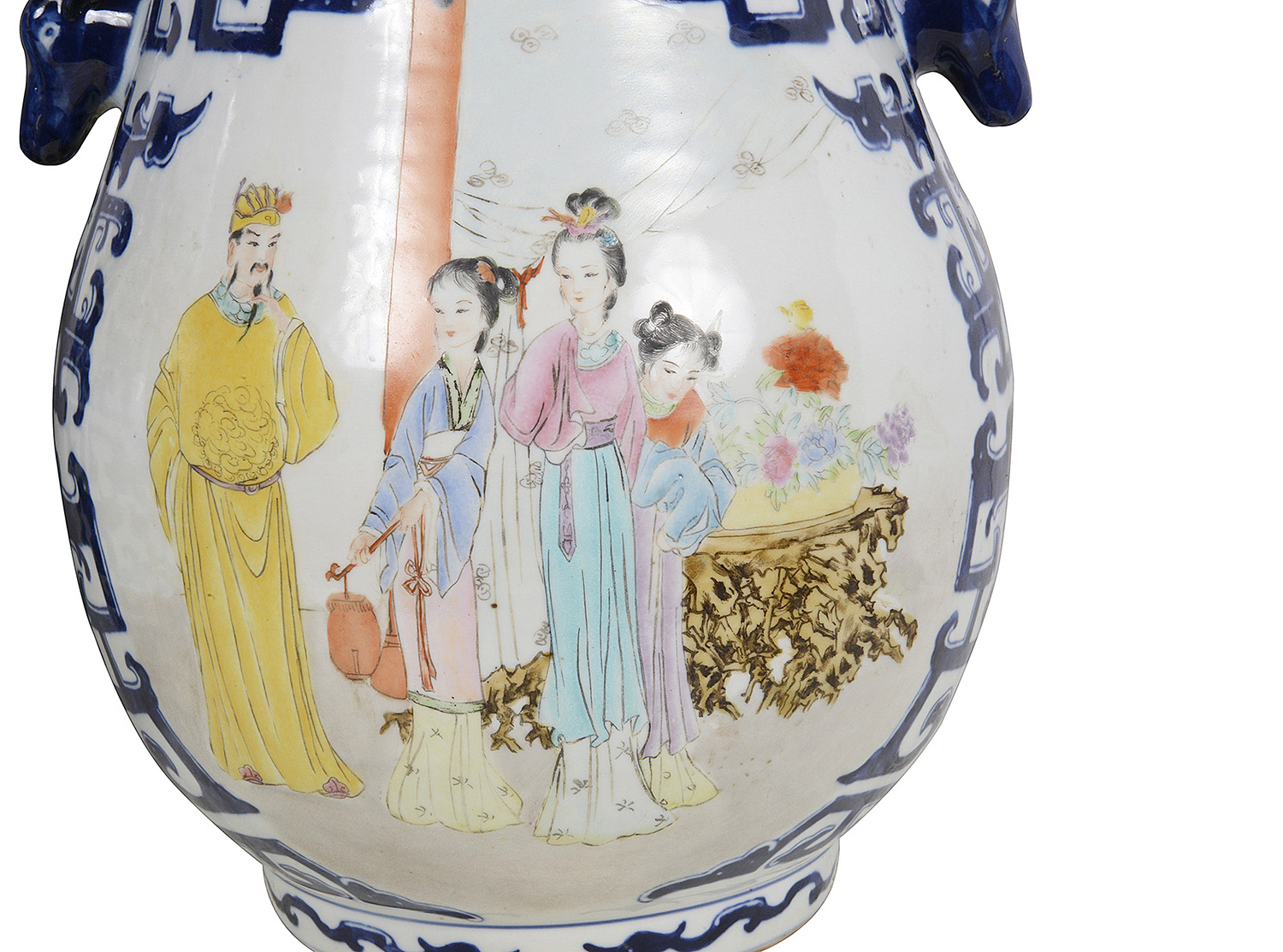 A very decorative pair of 20th Century Chinese porcelain vases / lamps. Each with blue coloured classical motif decoration boarders and Deer head handles, inset hand painted panels depicting females in attendants among flowers and gardens. Converted later to lamps.