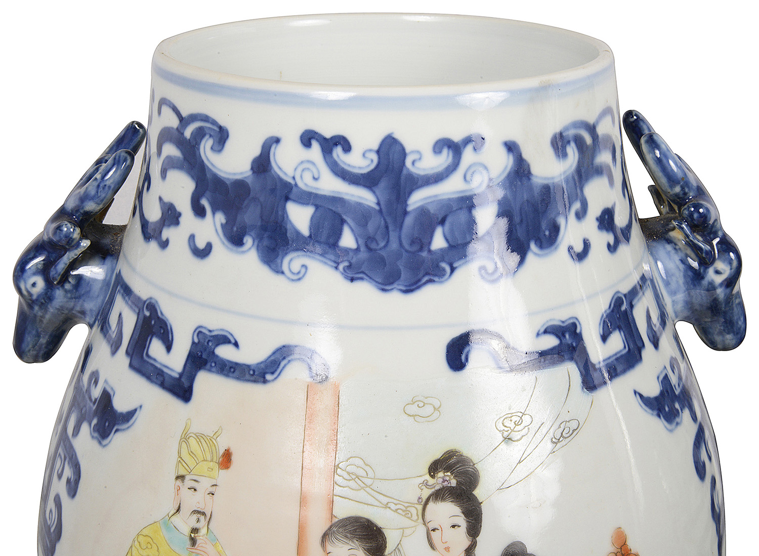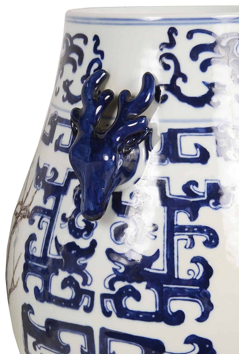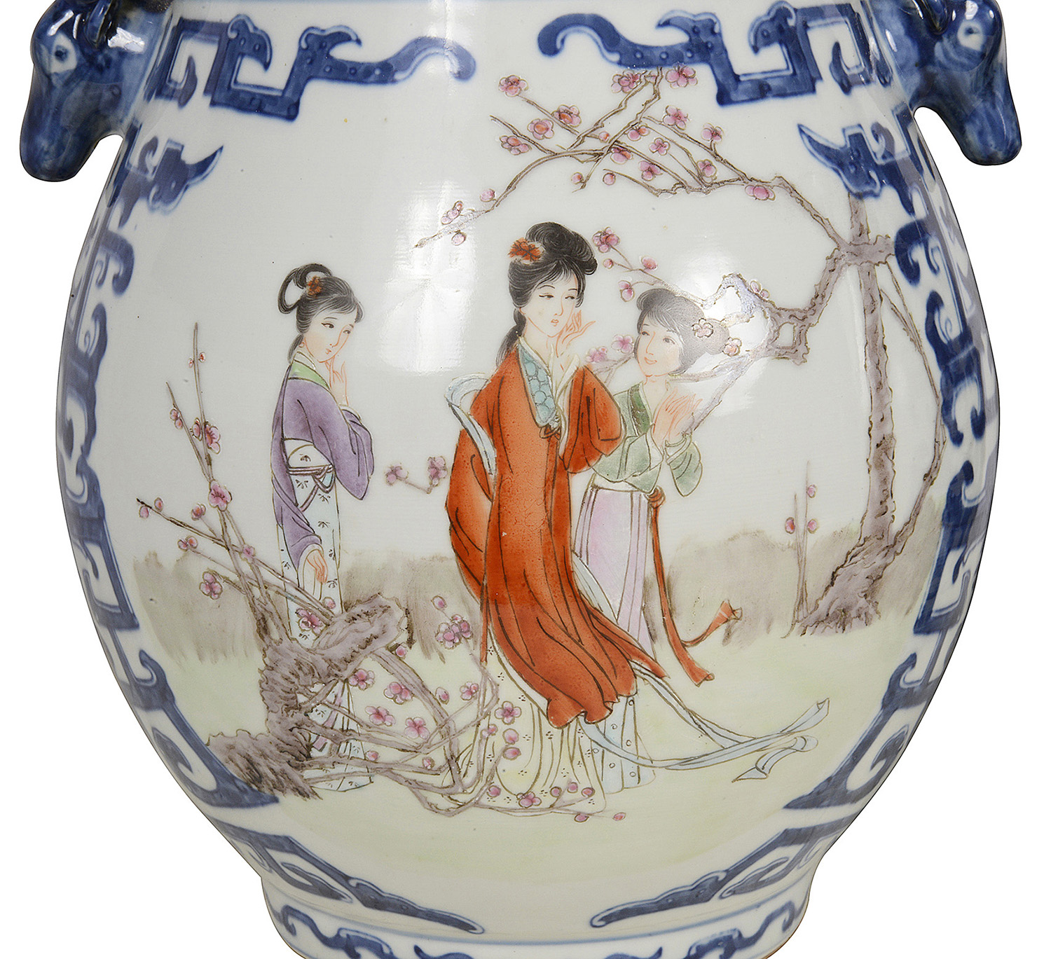 A very decorative pair of 20th Century Chinese porcelain vases / lamps. Each with blue coloured classical motif decoration boarders and Deer head handles, inset hand painted panels depicting females in attendants among flowers and gardens. Converted later to lamps.